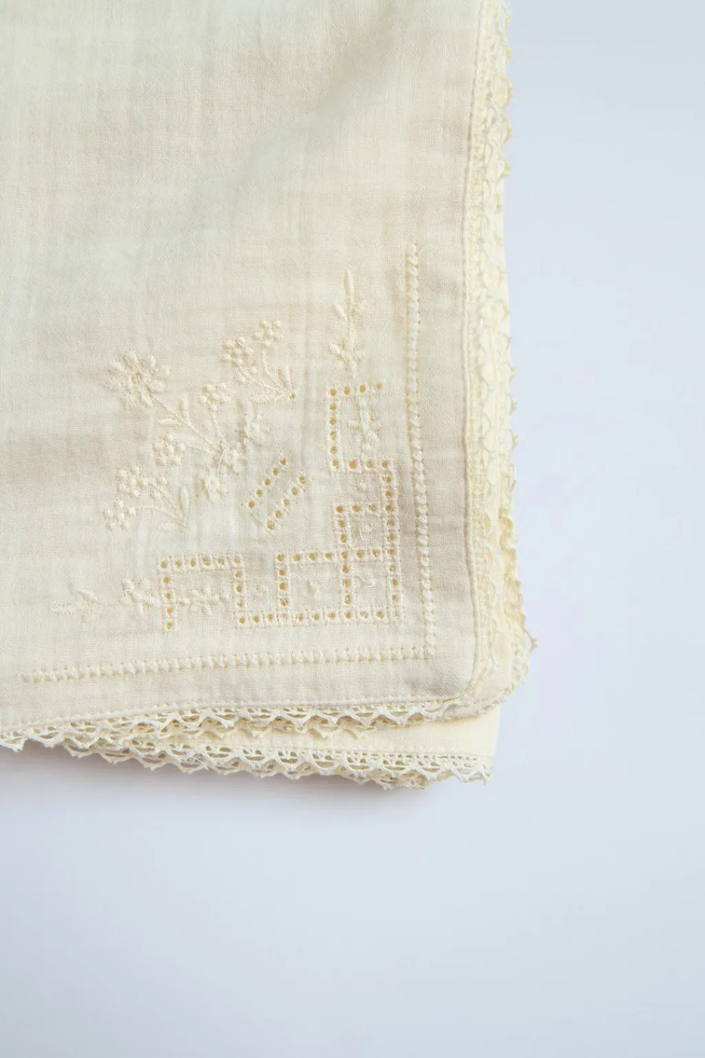 Manta tipo arrullo con acabados en puntilla. Detalle bordados.