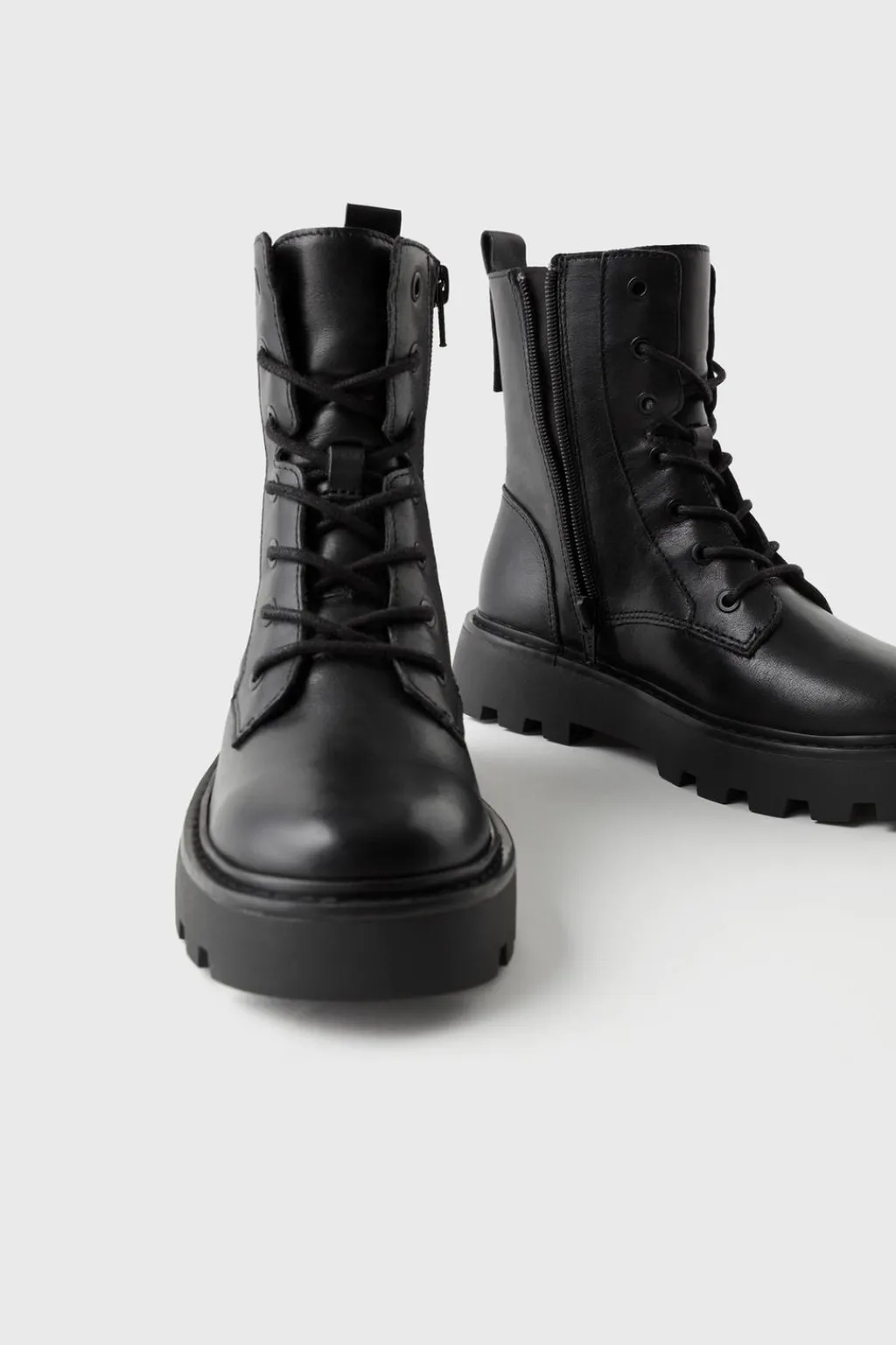 Botín de piel 100% vacuno. Cierre mediante cremallera y cordones ajustables. Tirador trasero para facilitar el calce. Plantilla flexible. Suela de goma dentada estilo track.