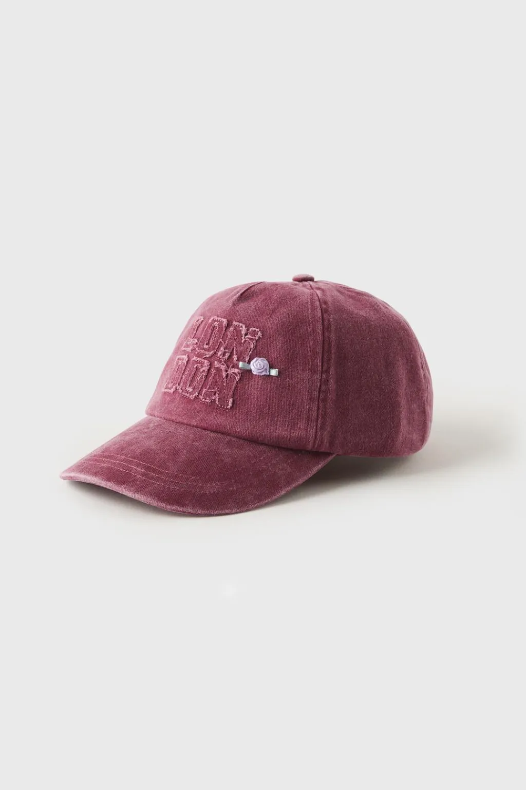 Gorra con tejido efecto lavado y cierre ajustable en nuca. Detalle texto bordado en delantero y aplique flor.