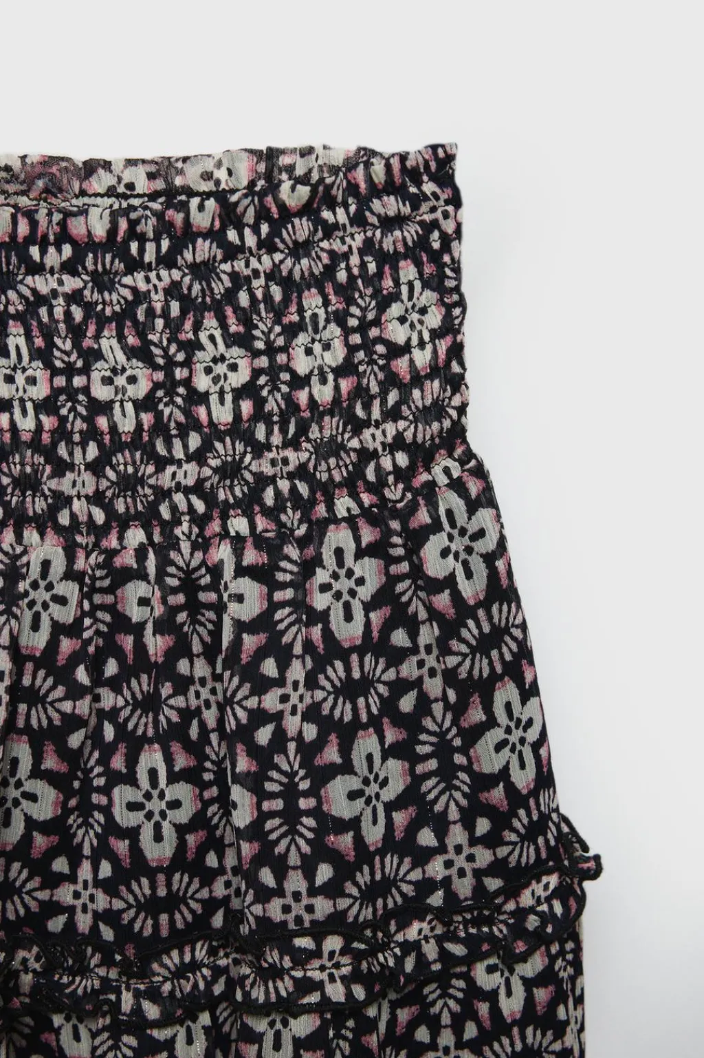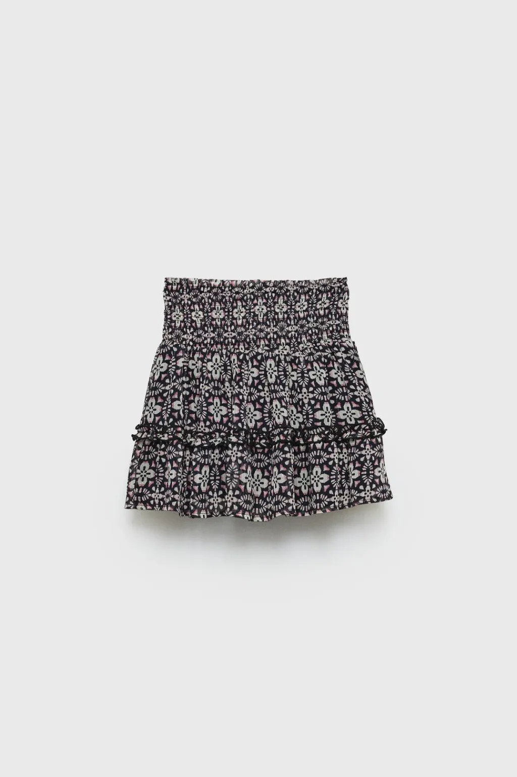 Falda con cinturilla elástica. Aplique volantes. Estampado de flores con detalle brillos.