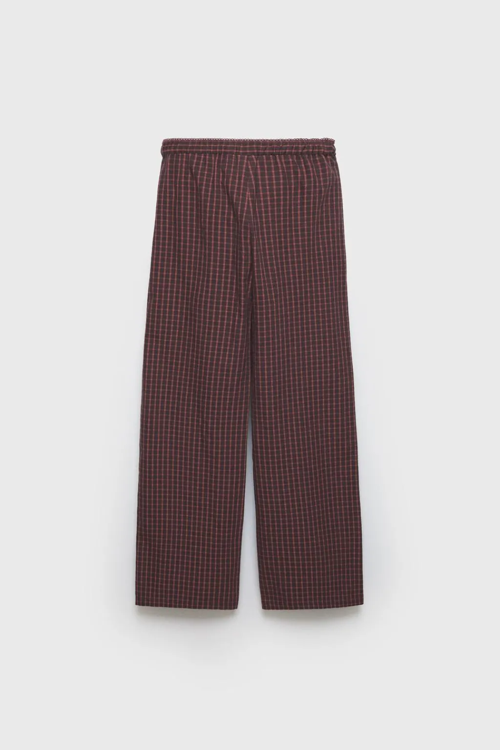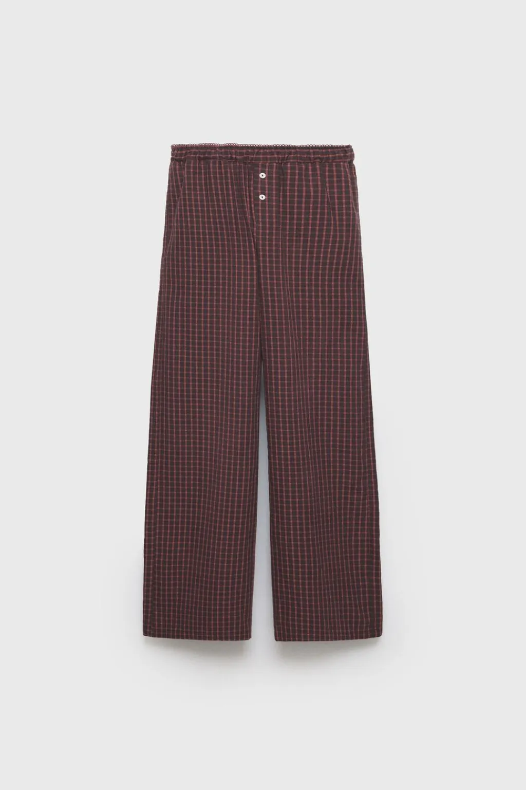 Pantalón de cuadros con cinturilla elástica, detalle puntilla y aplique botones frontal.