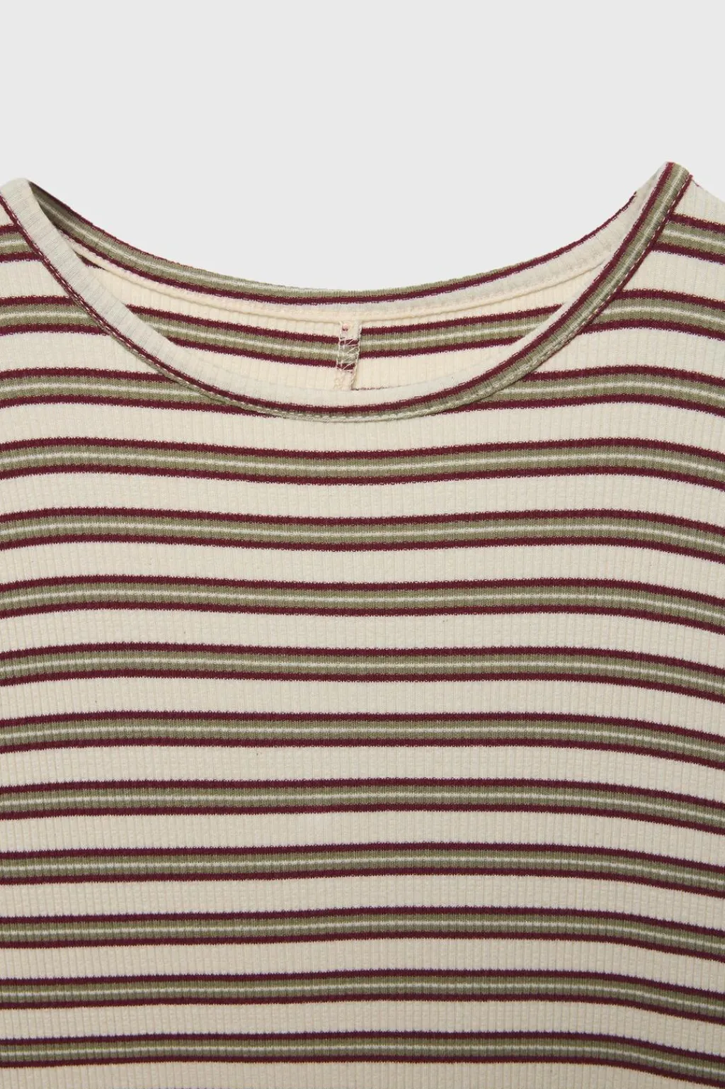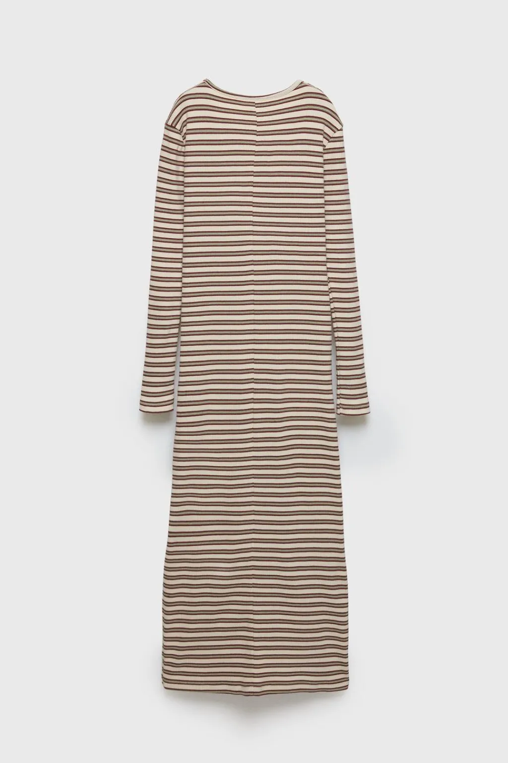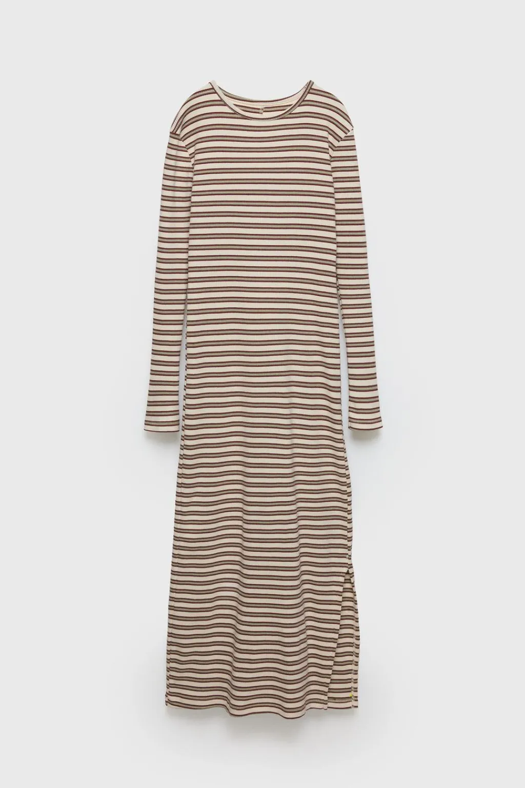 Vestido rib tipo midi con cuello redondo y manga larga. Abertura lateral en bajo. Estampado de rayas.