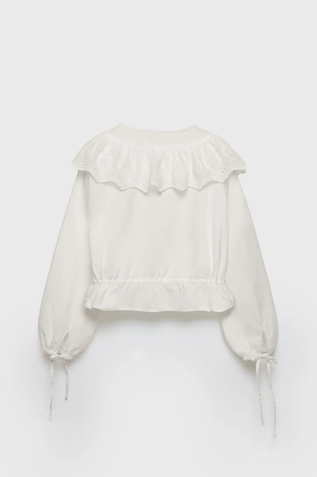 Blusa con cuello redondo y manga larga acabada con lazo ajustable. Cierre botonadura en frontal. Aplique volante con puntilla en pechera y espalda. Detalle lazo ajustable en cintura.