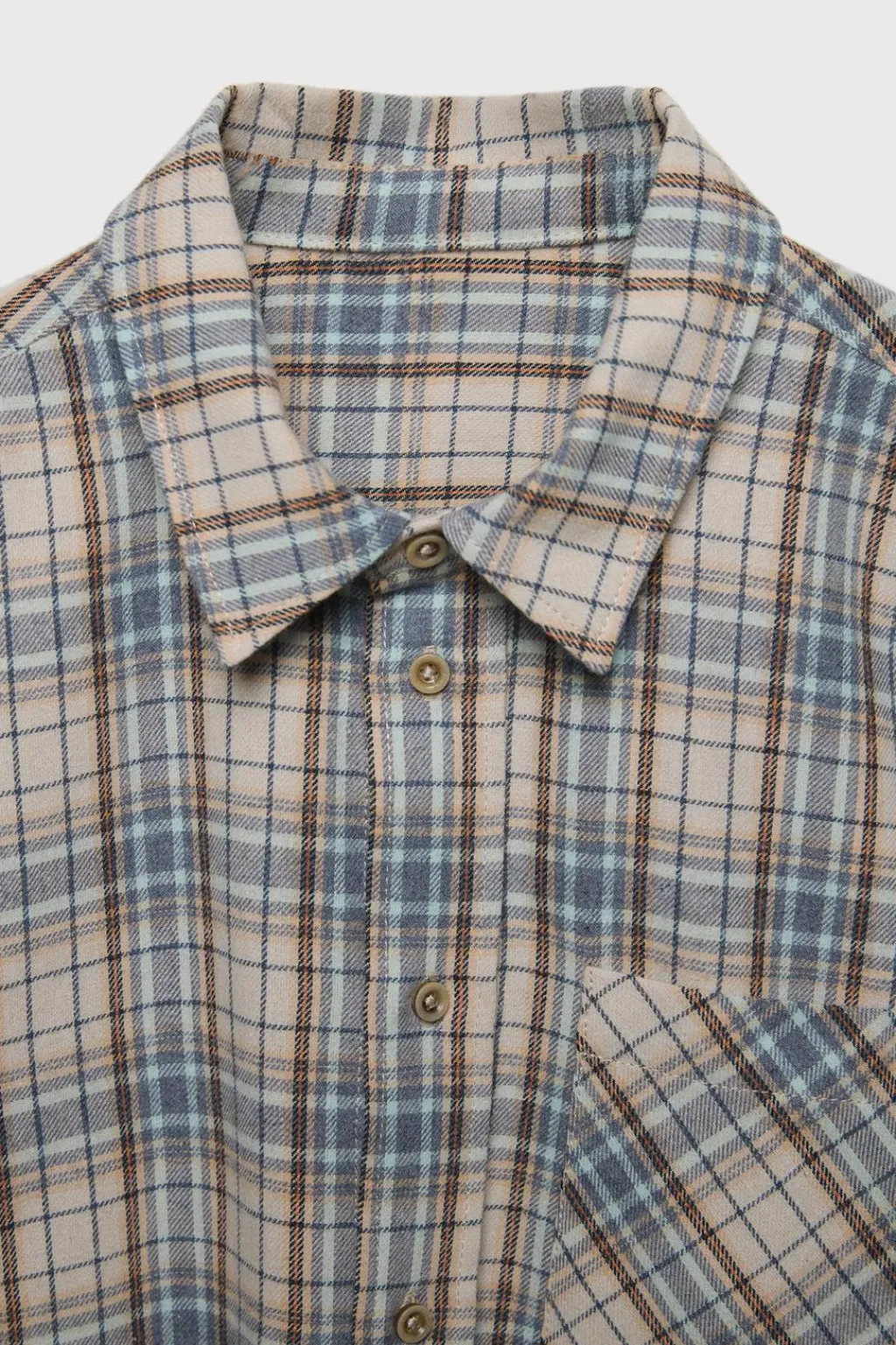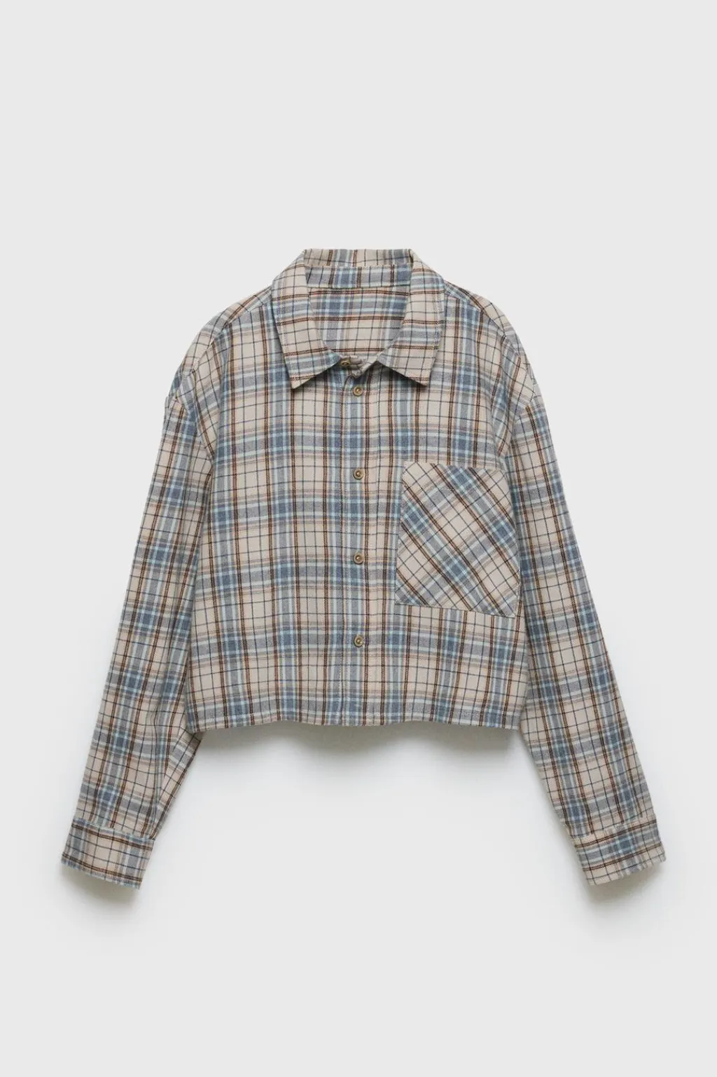 Camisa de cuadros con cuello camisero y manga larga acabada en cierre botón. Cierre botonadura frontal. Bolsillo de tipo plastrón en pechera.