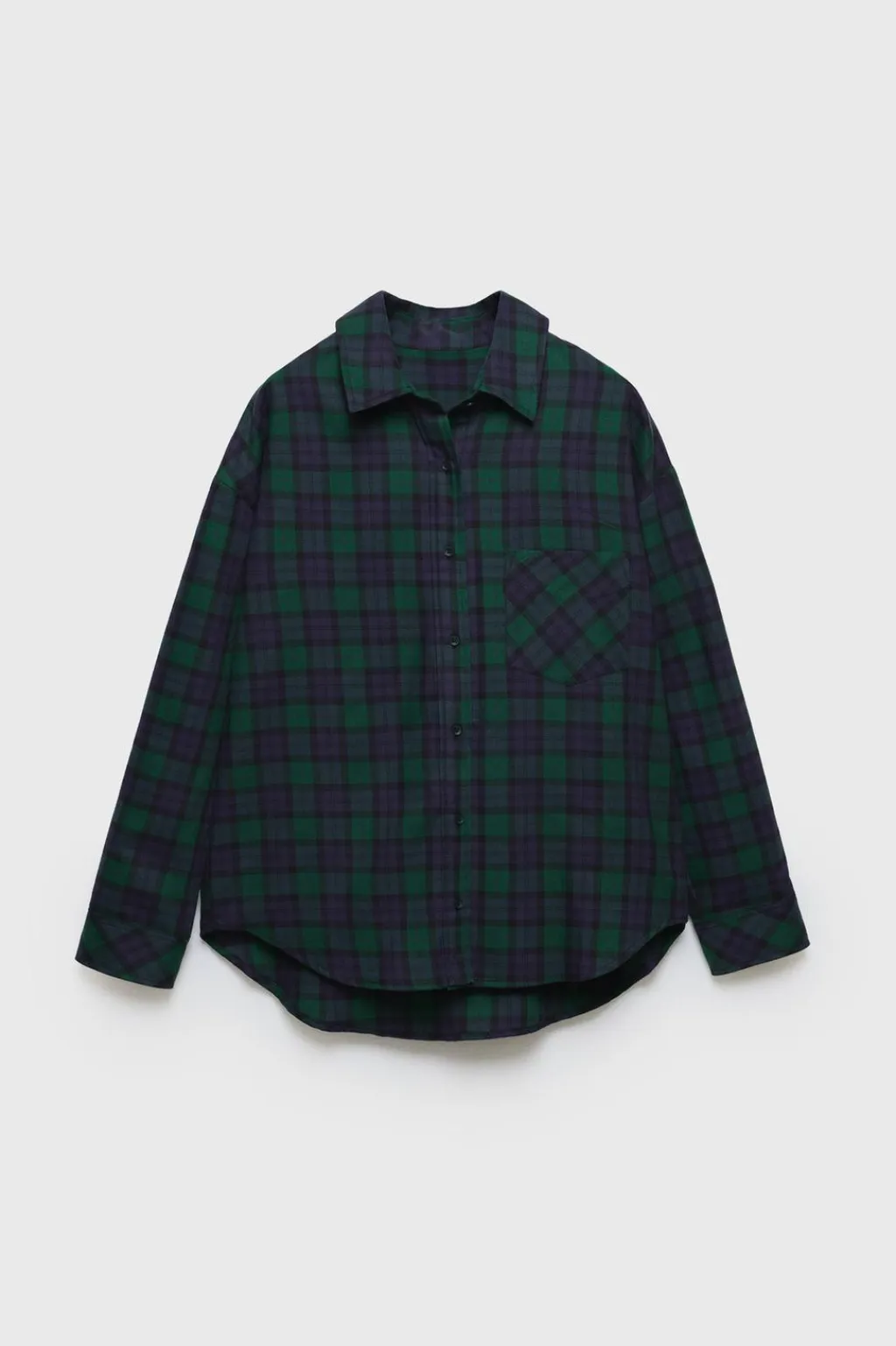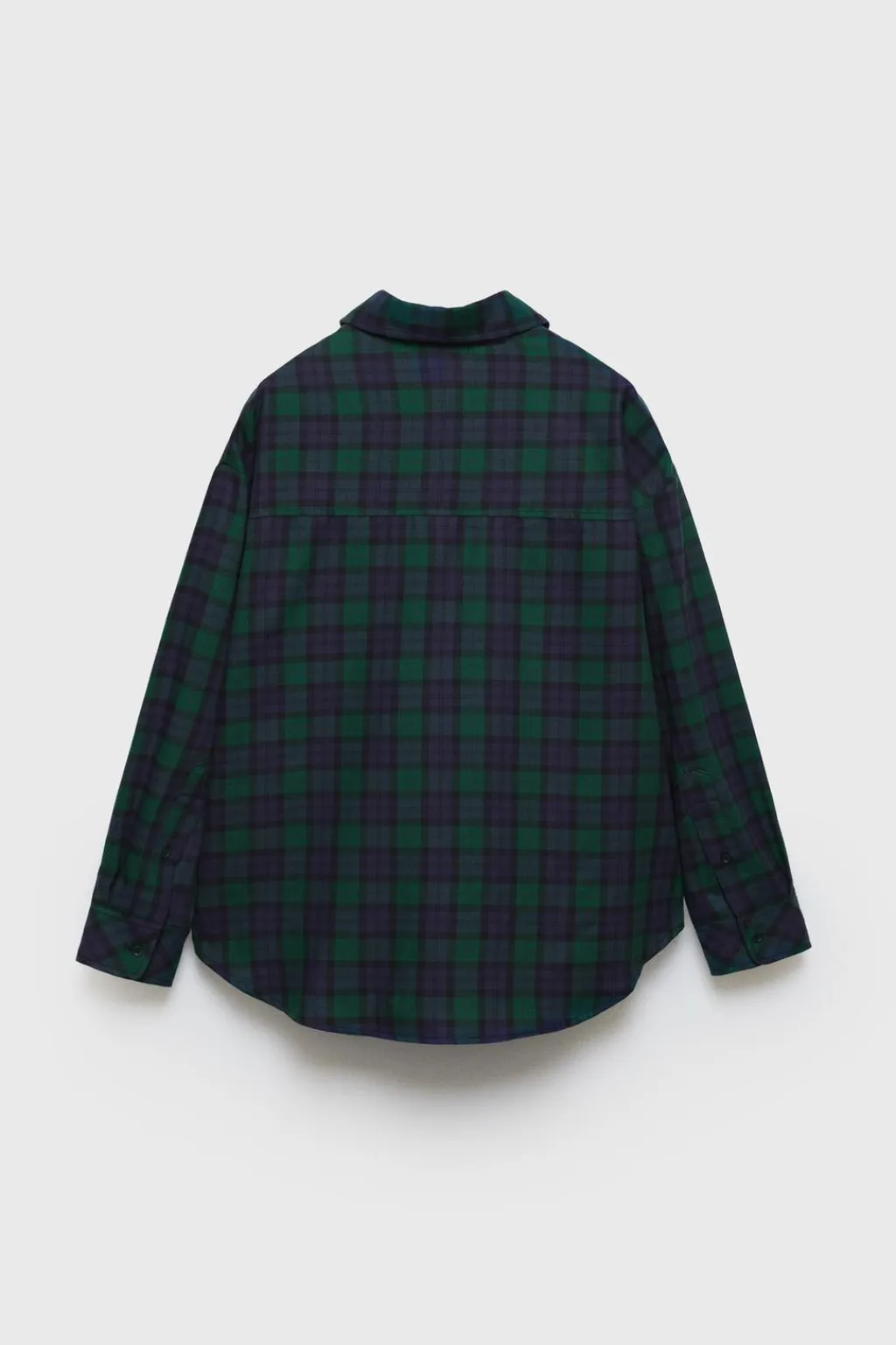 Camisa con cuello camisero y manga larga. Cierre botonadura frontal y bolsillo tipo plastrón en pechera. Estampado cuadros.