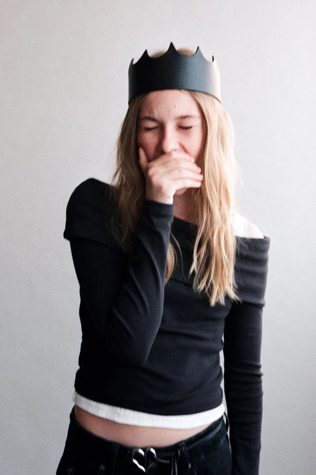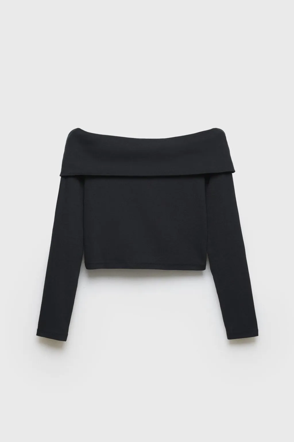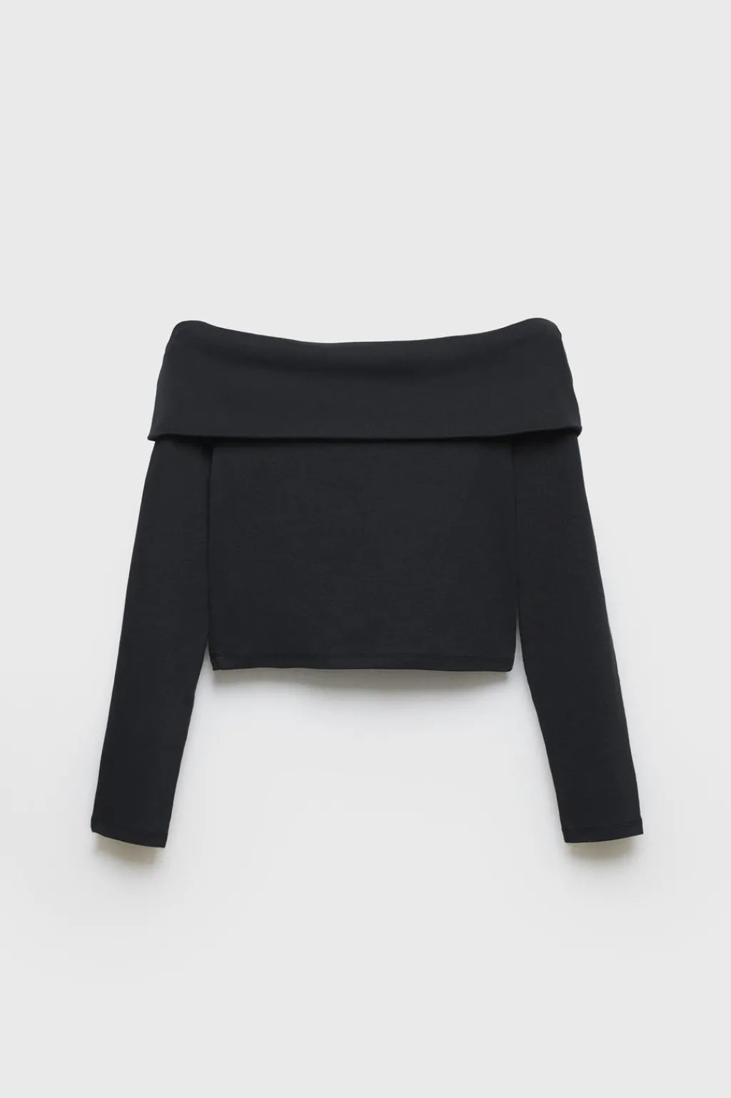 Camiseta de cuello recto acabado en vuelta con hombros descubiertos y manga larga.