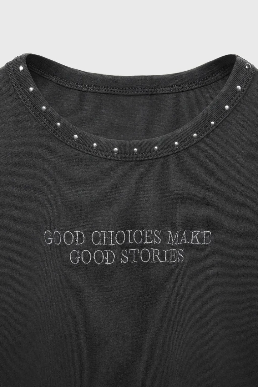 Camiseta con cuello redondo y manga larga. Detalle de bordado en pechera y aplique tachas en cuello.