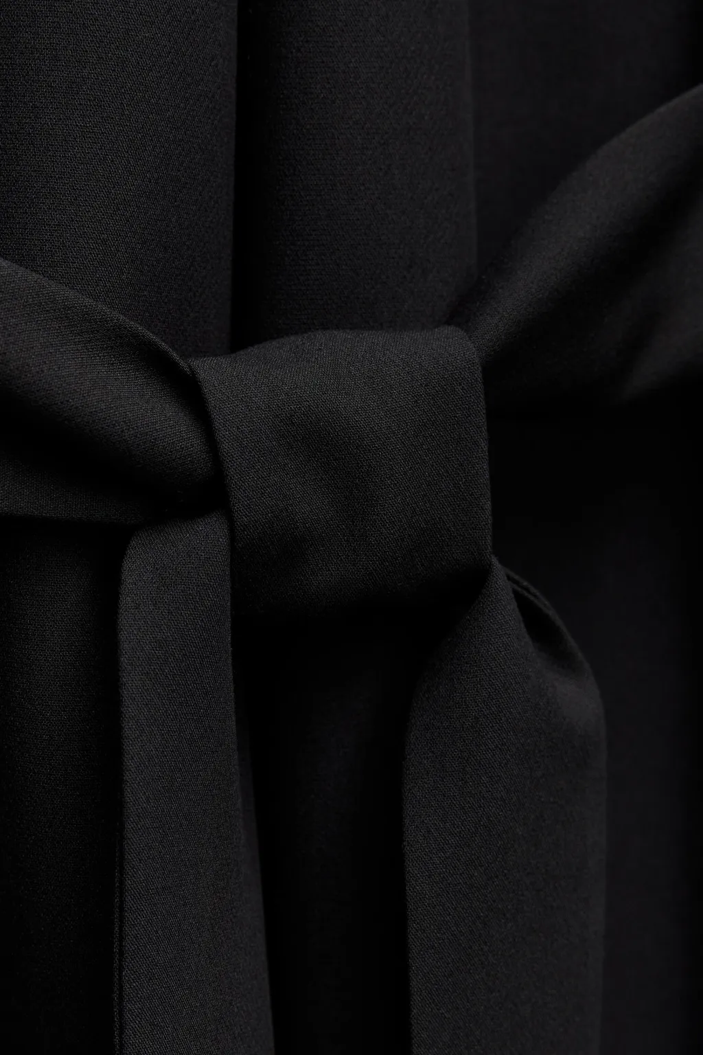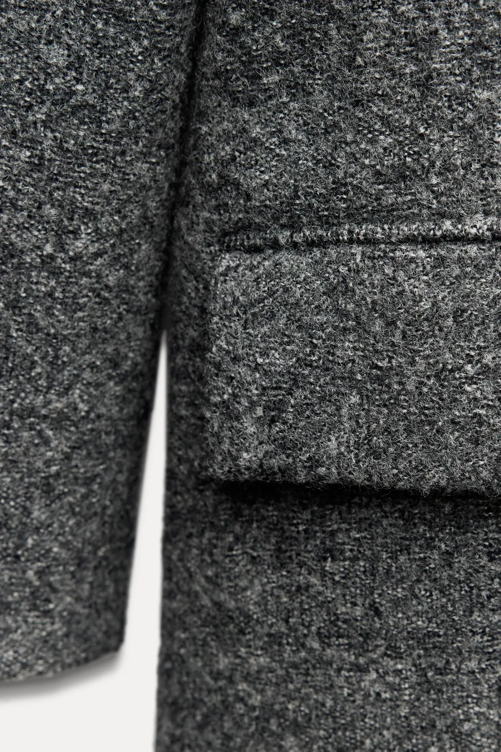 Abrigo largo confeccionado en hilatura de lana 100%. Cuello solapa de muescas y manga larga acabada en abertura y botones. Bolsillos con solapa en delantero. Detalle de aplicación de tejido en espalda a contraste. Cierre frontal con botones ocultos por solapa.