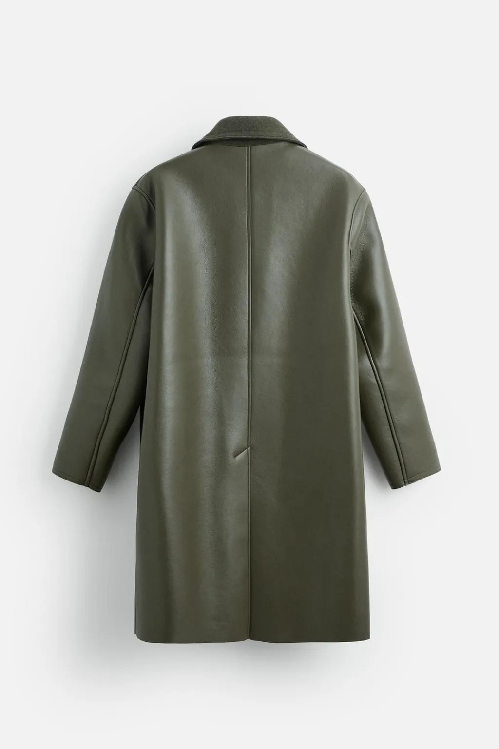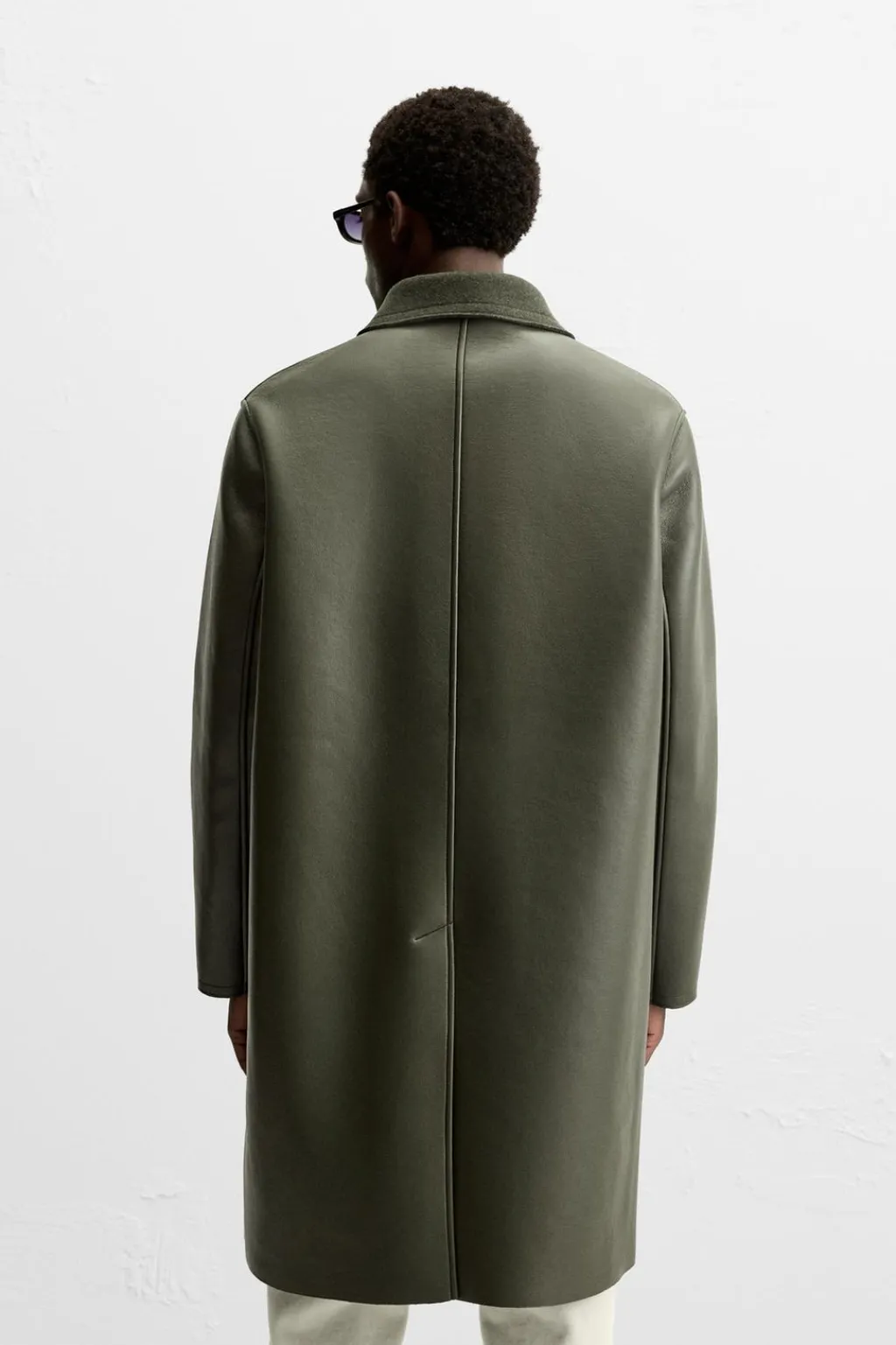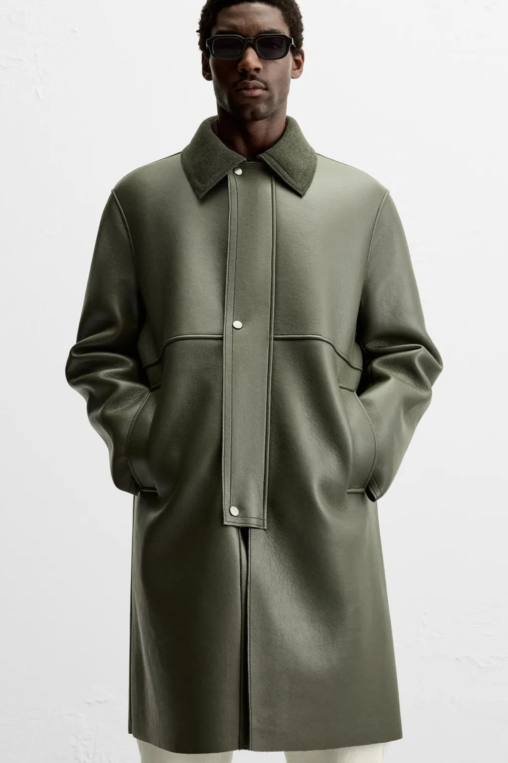 Abrigo relaxed fit confeccionado en tejido efecto piel con el interior acabado en fieltro. Cuello solapa combinado a contraste. Manga larga. Bolsillos de vivo en cadera. Bajo con abertura en centro espalda. Cierre frontal con cremallera oculta por solapa con botones a presión.