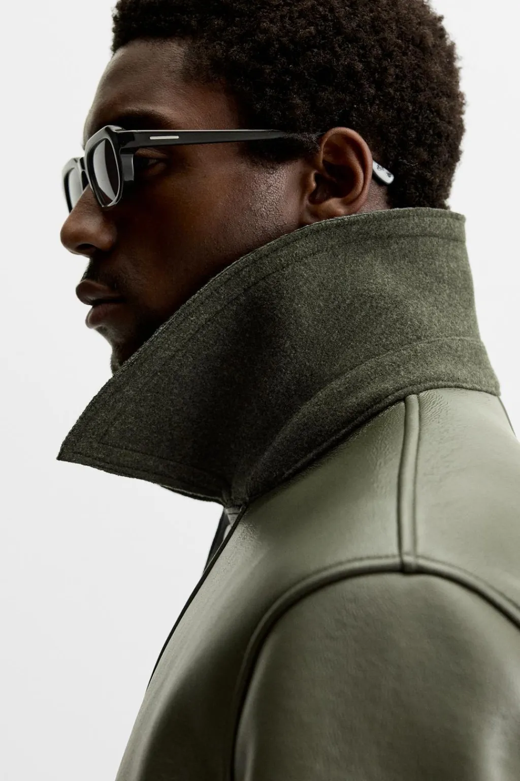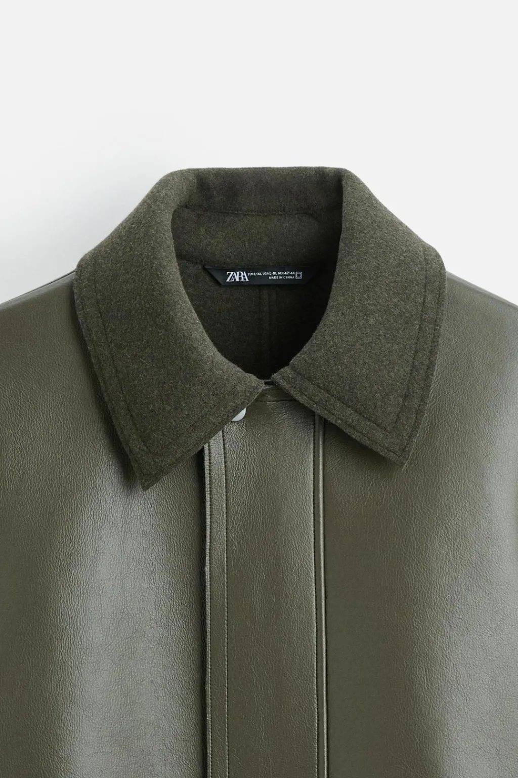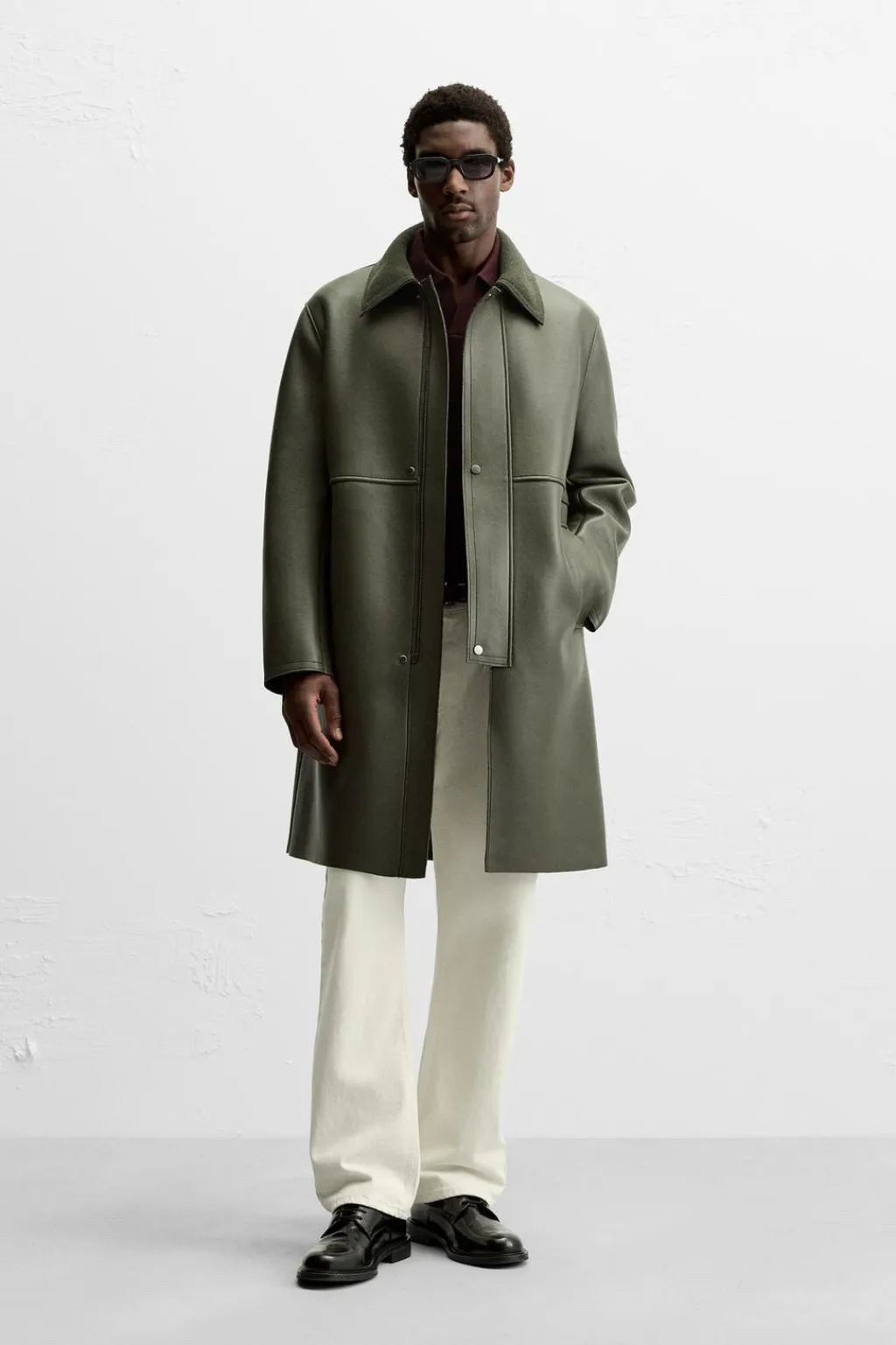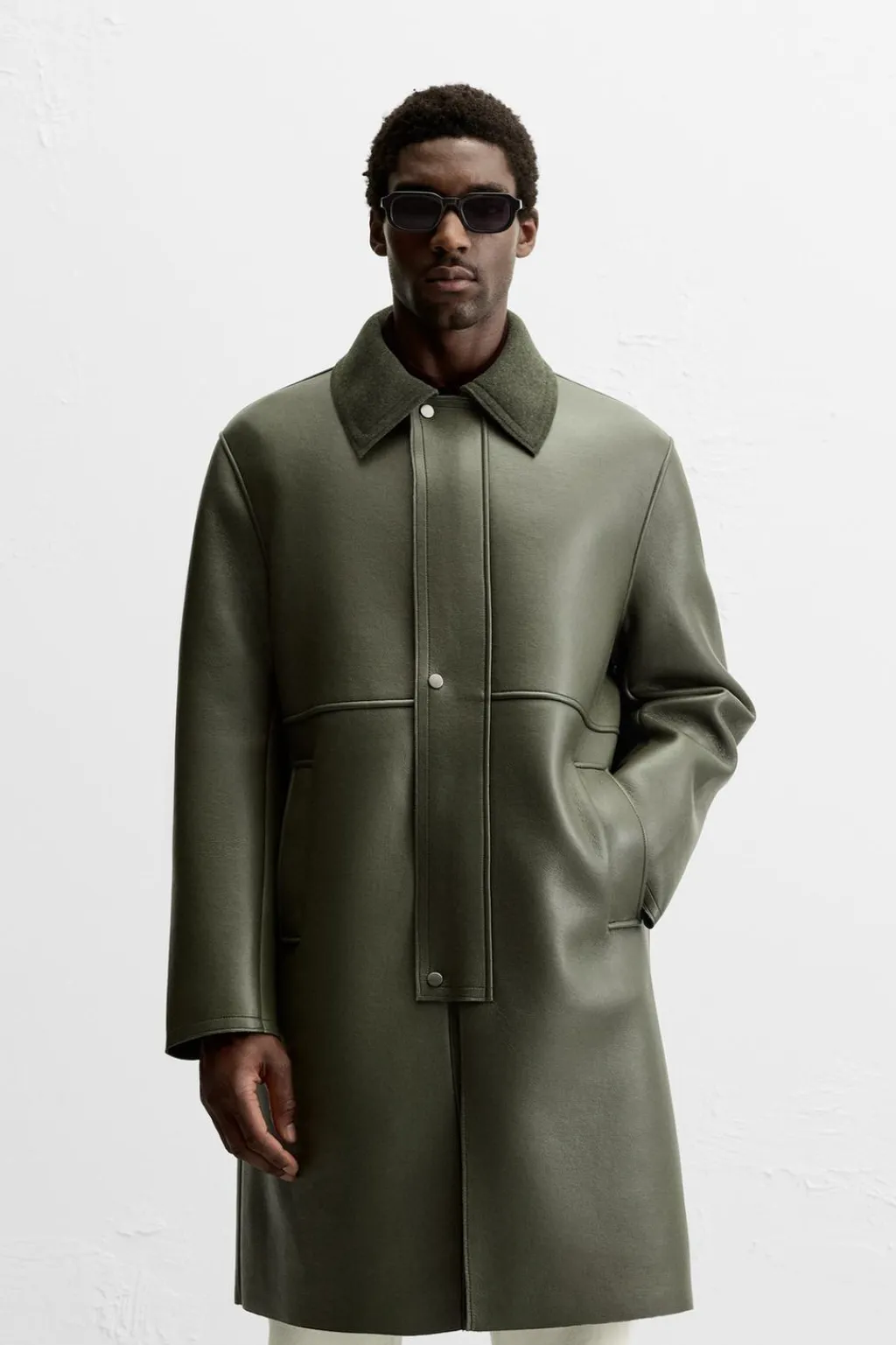 Abrigo relaxed fit confeccionado en tejido efecto piel con el interior acabado en fieltro. Cuello solapa combinado a contraste. Manga larga. Bolsillos de vivo en cadera. Bajo con abertura en centro espalda. Cierre frontal con cremallera oculta por solapa con botones a presión.