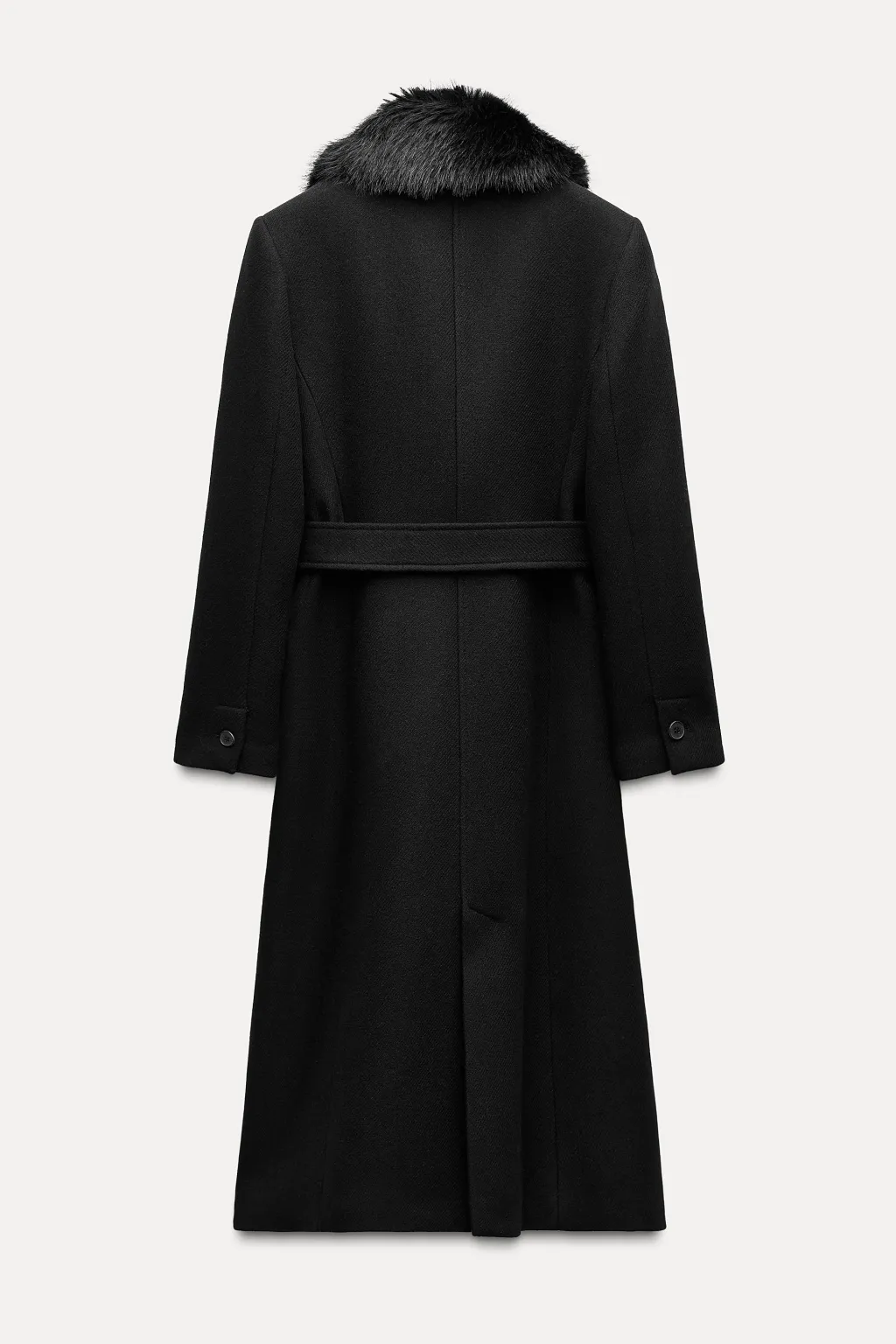 Abrigo confeccionado con lana. Cuello con solapa efecto pelo y manga larga. Bolsillos delanteros con solapa. Bajo con abertura trasera. Cierre frontal con botones y cinturón del mismo tejido.