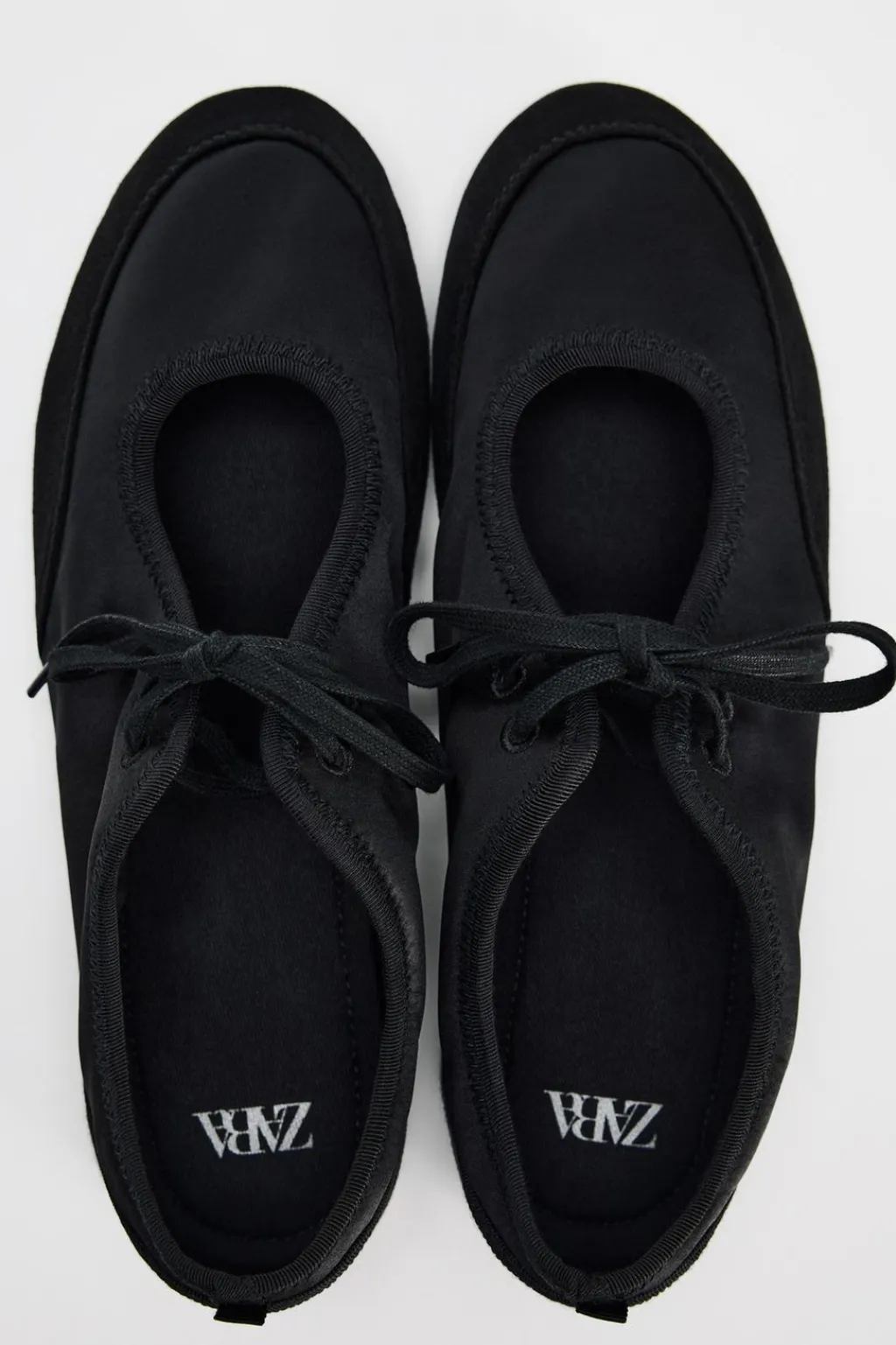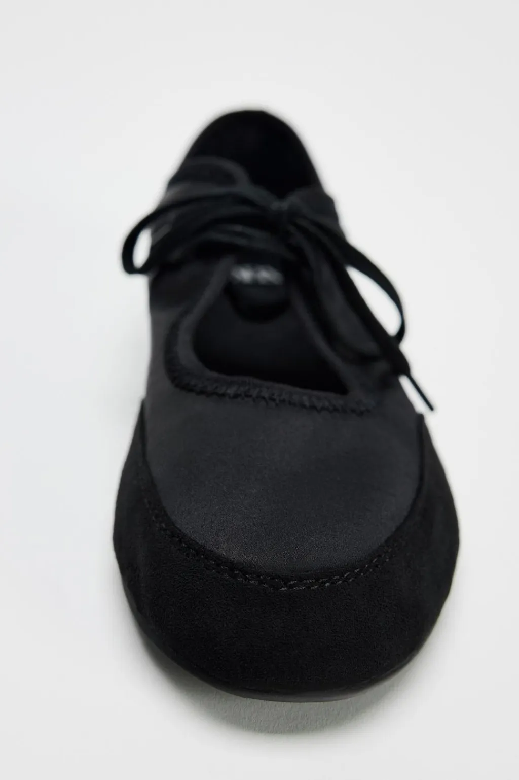 Zapato plano tipo bailarina en tejido satinado. Detalle de abertura en la parte delantera. Cierre mediante cordones.