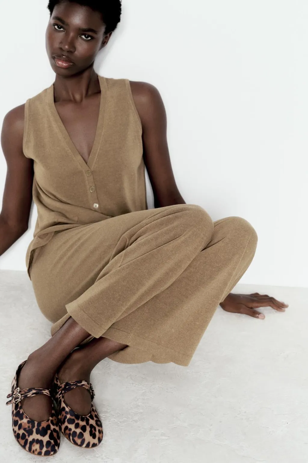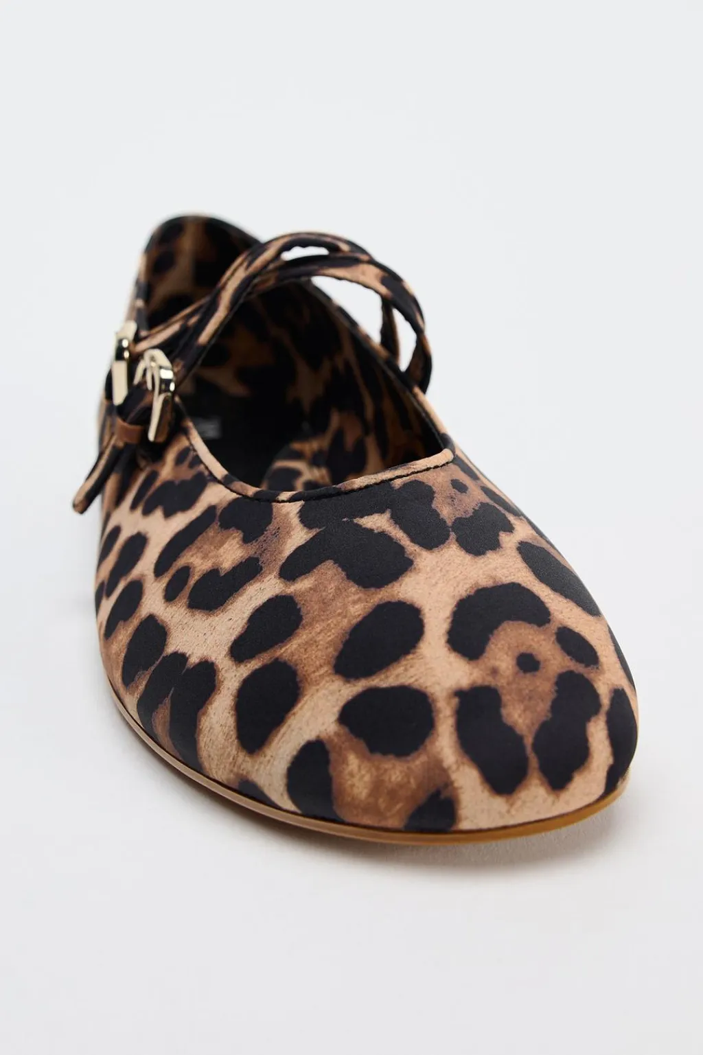 Zapato plano tipo bailarina en estampado animal. Tiras multiposición con hebillas.