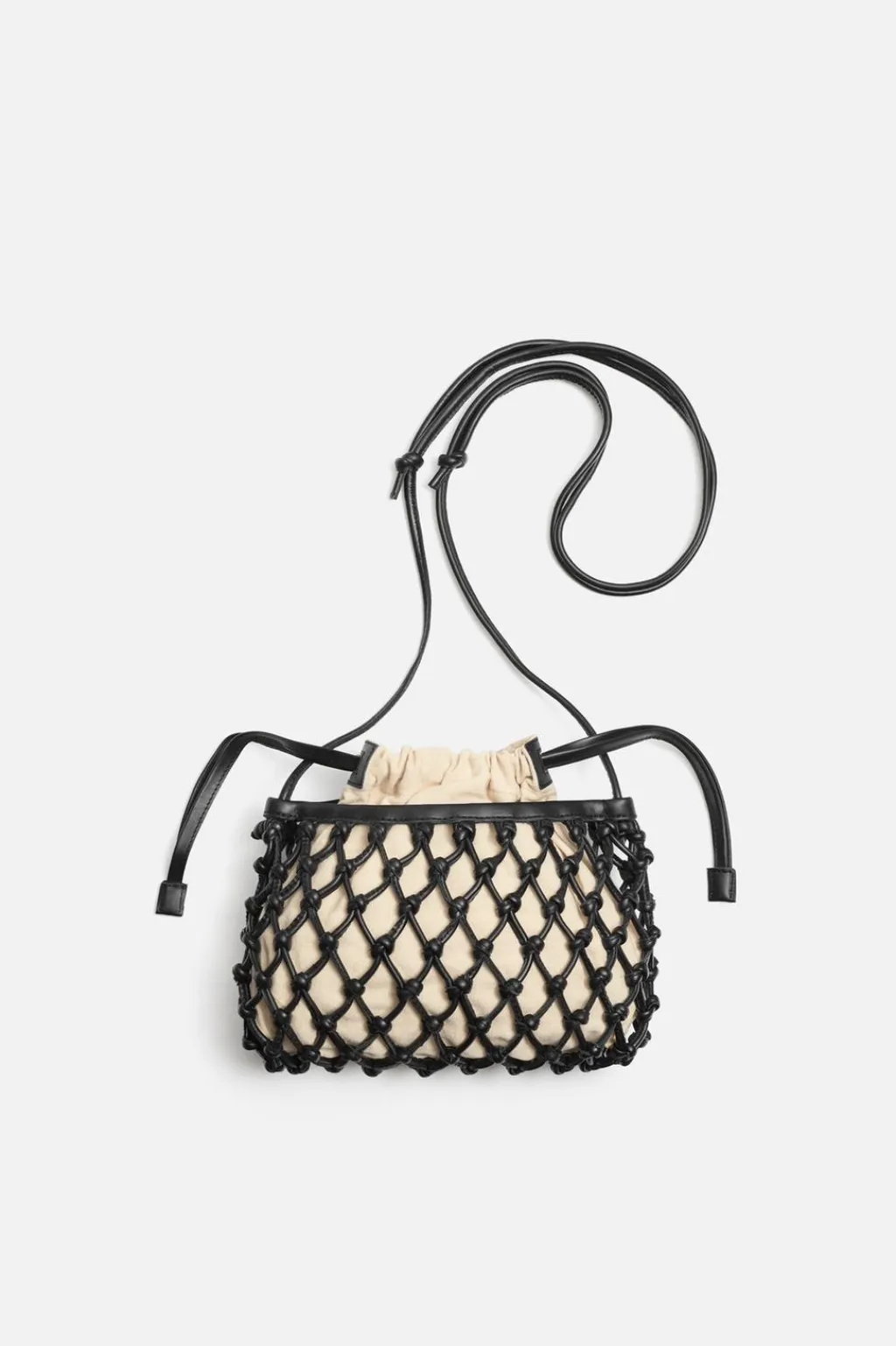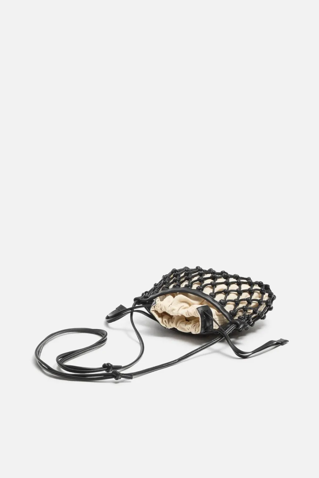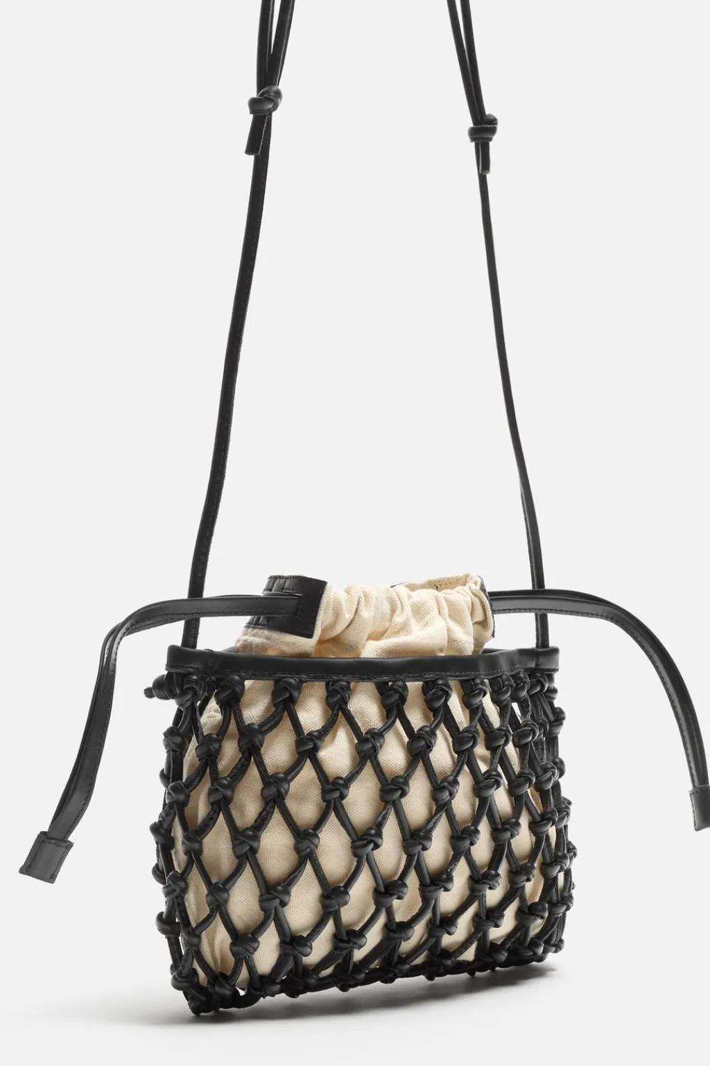 Bandolera macramé fabricada en piel. Saca interior en tejido con cierre mediante cordón y bolsillo plano en su interior.