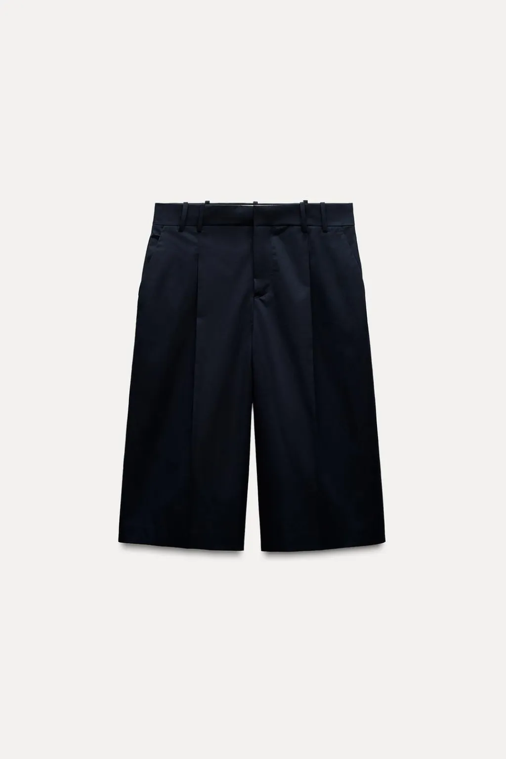 Bermuda confeccionada en hilatura de algodón 100%. Tiro medio y cintura con trabillas. Bolsillos delanteros. Detalle de raya planchada en delantero. Cierre frontal con cremallera, botón y gancho metálico.