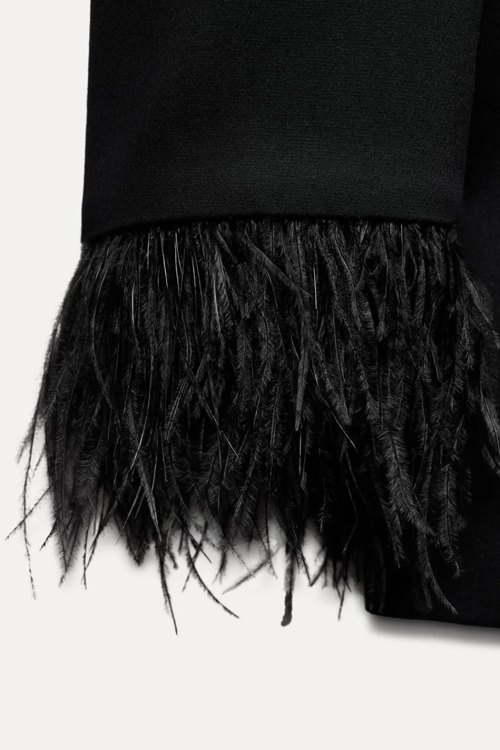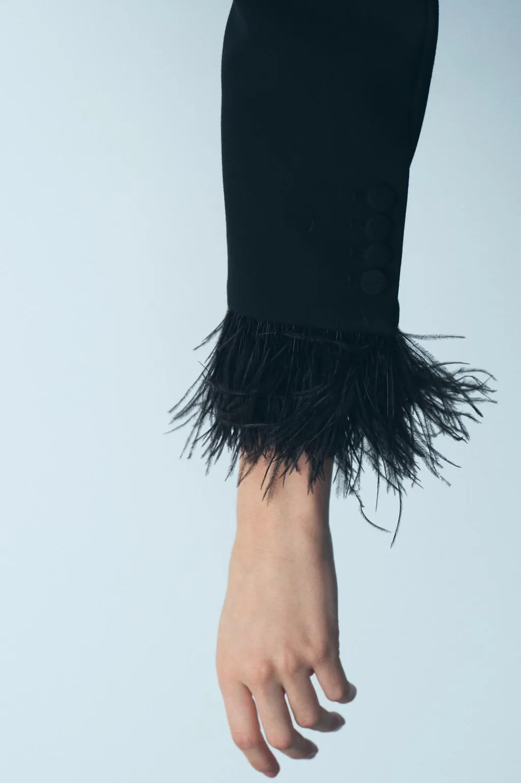 Blazer de cuello solapa y manga larga con hombreras acabada con plumas. Bolsillos delanteros con solapa. Cierre frontal cruzado con botones.