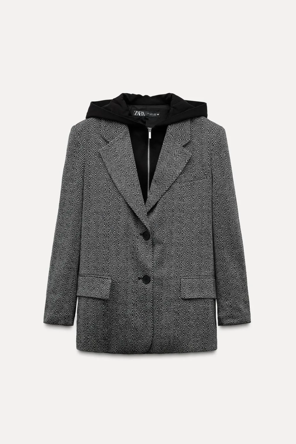 Blazer de cuello con solapa y capucha combinada. Manga larga con hombreras. Bolsillos delanteros con solapa. Bajo con abertura en espalda. Cierre frontal con cremallera y botones.