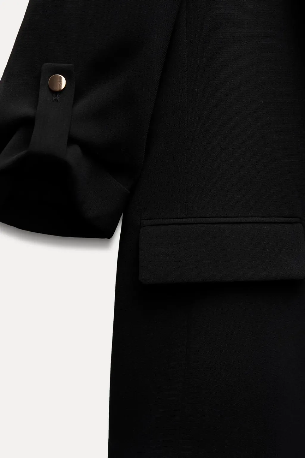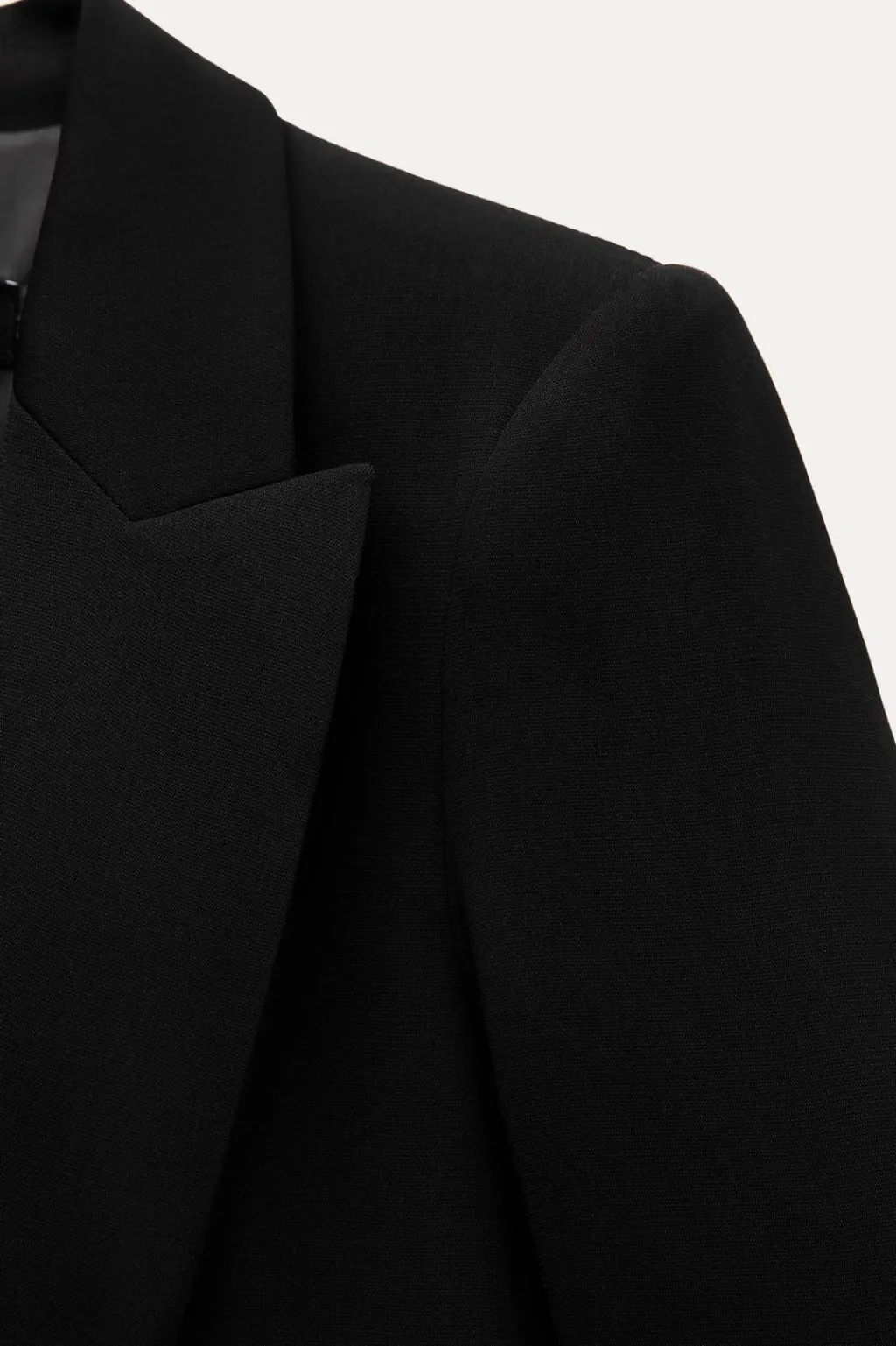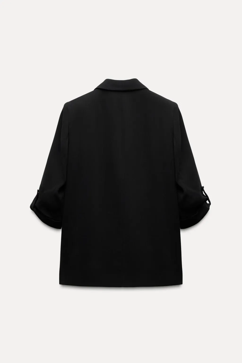 Blazer abierta de cuello solapa y hombreras. Manga por debajo del codo acabada en vuelta con trabilla y botón dorado. Bolsillos delanteros con solapa.