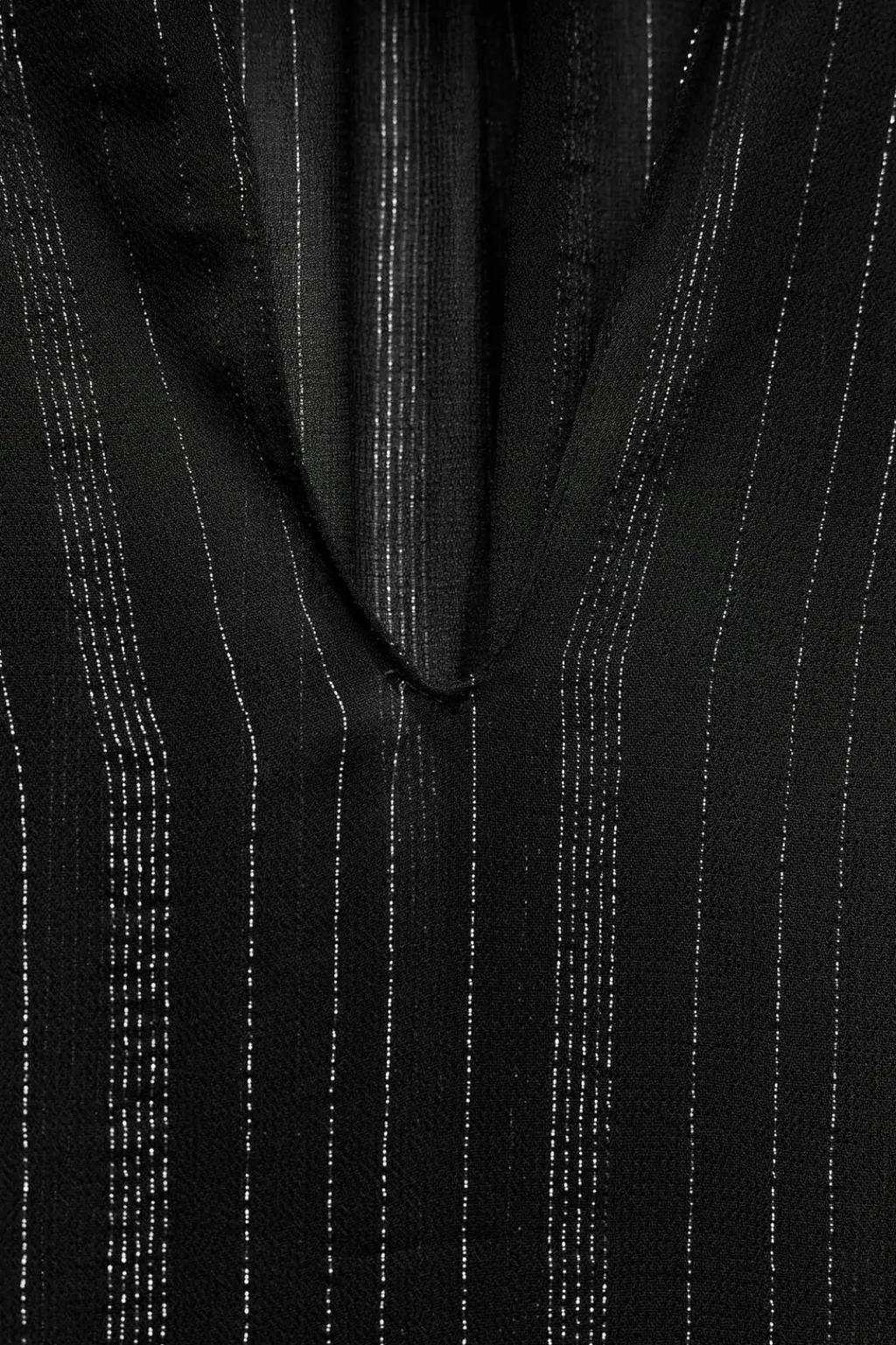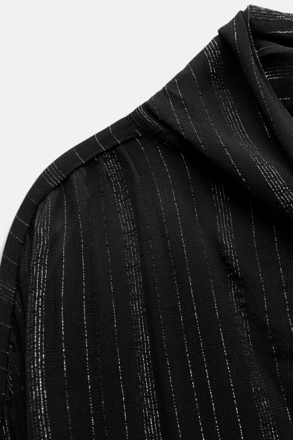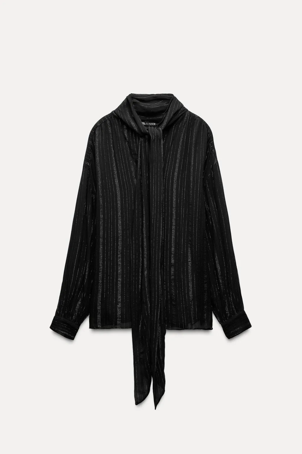 Blusa de cuello redondo con lazo en mismo tejido. Manga larga acabada en puño. Detalle de aplicación de hilo metalizado. Bajo asimétrico.