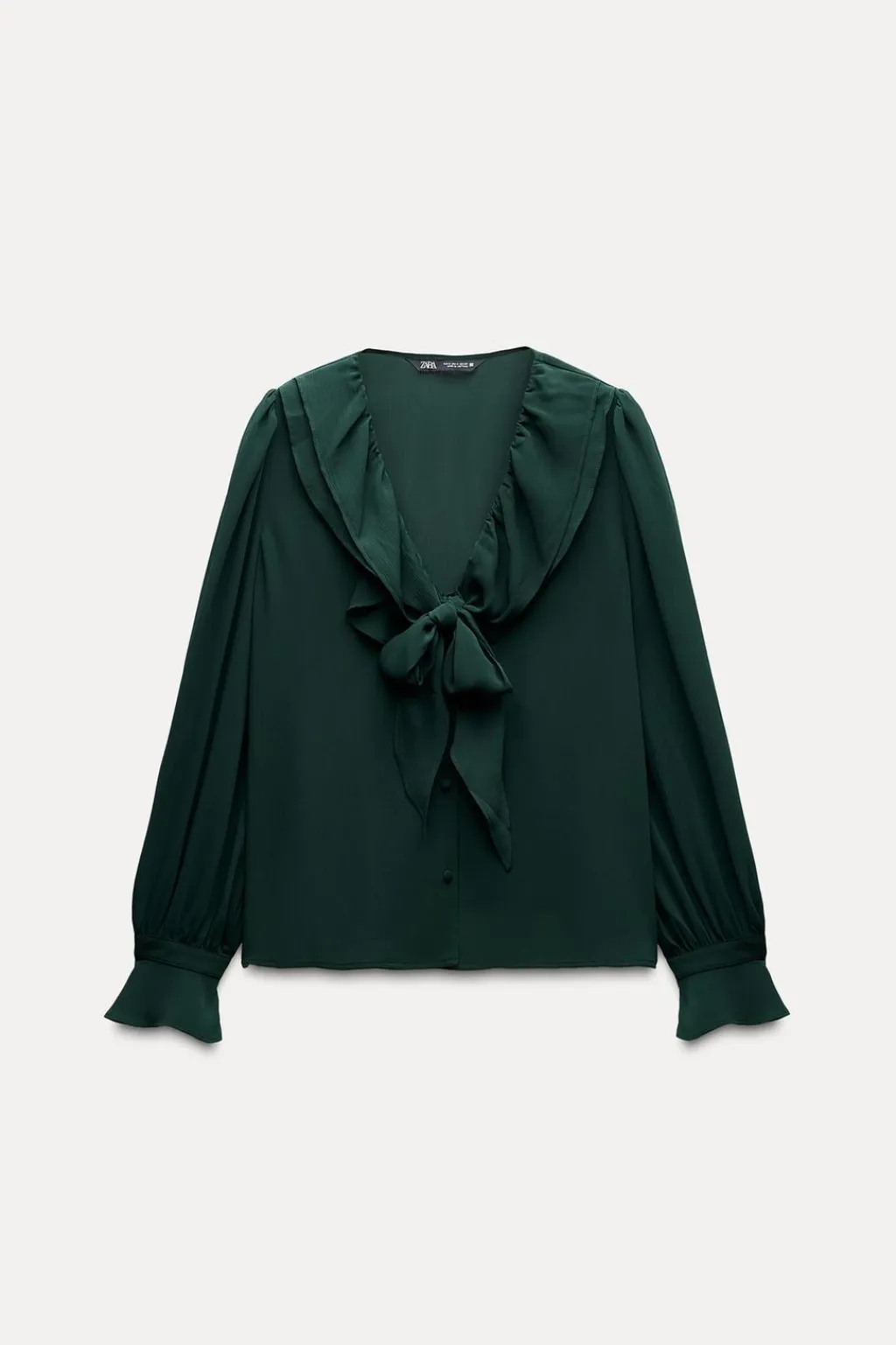 Blusa de escote pico con volante y lazo. Manga larga acabada con volante. Cierre frontal con botones forrados a tono.