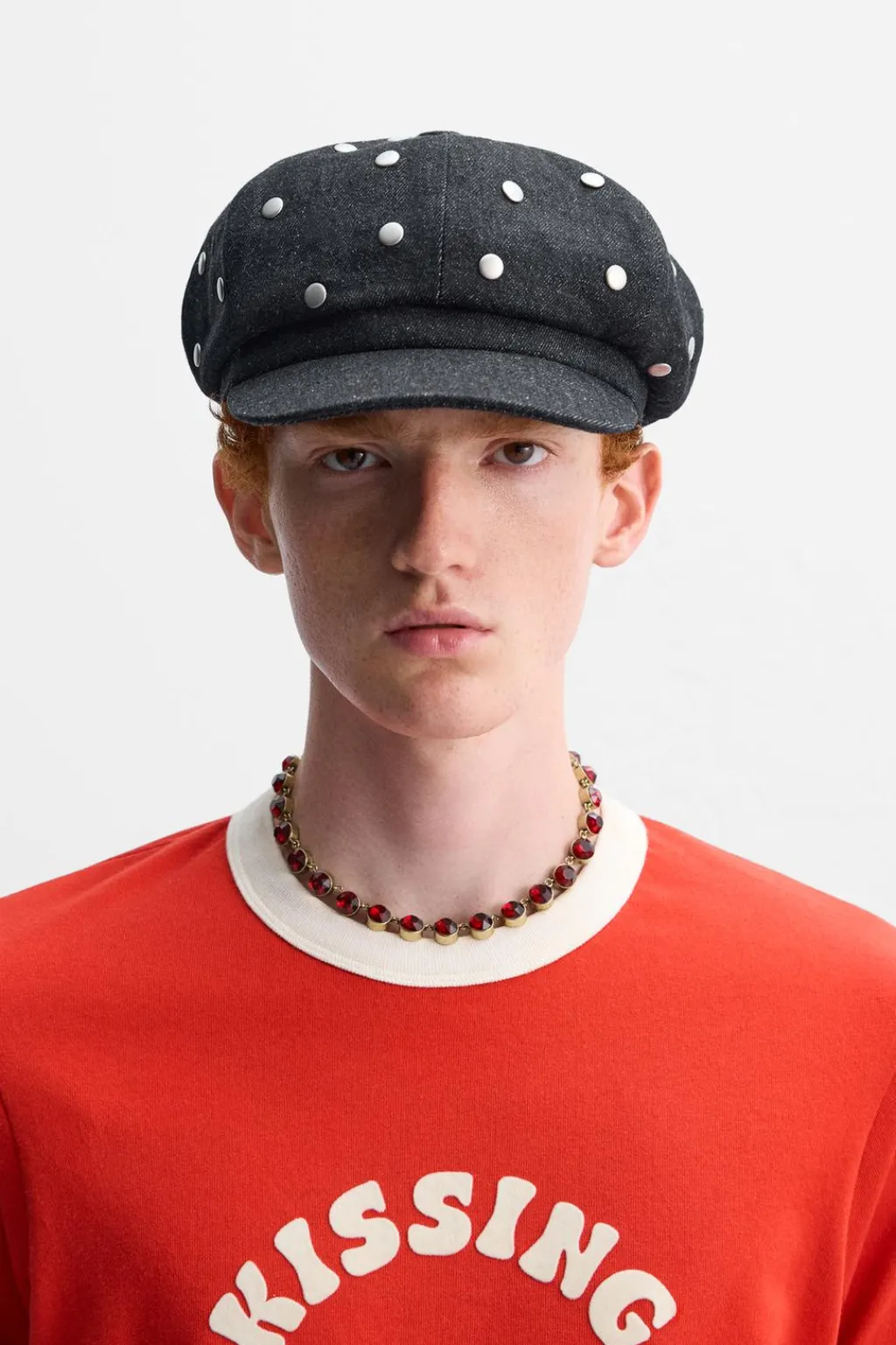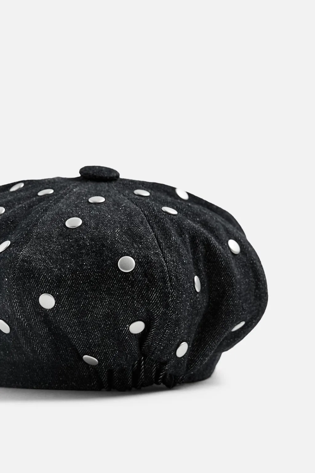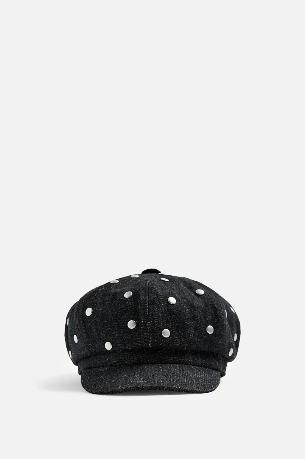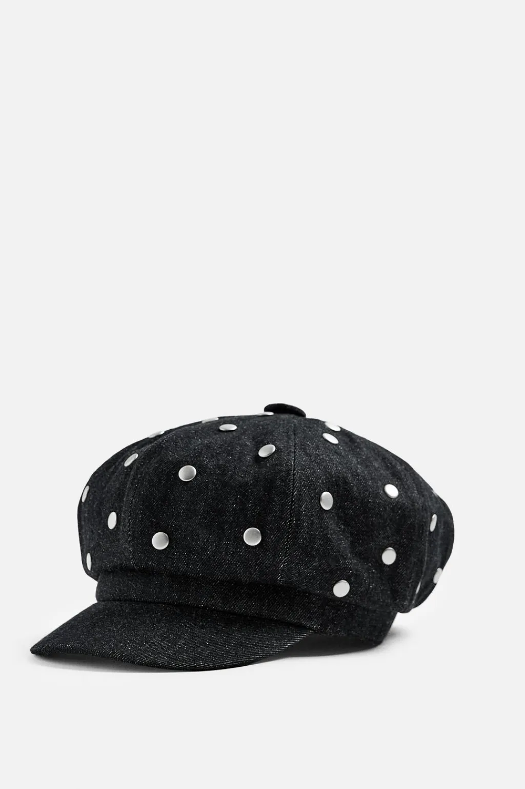 Boina con visera confeccionada en denim de algodón. Aplicación de tachas metálicas.