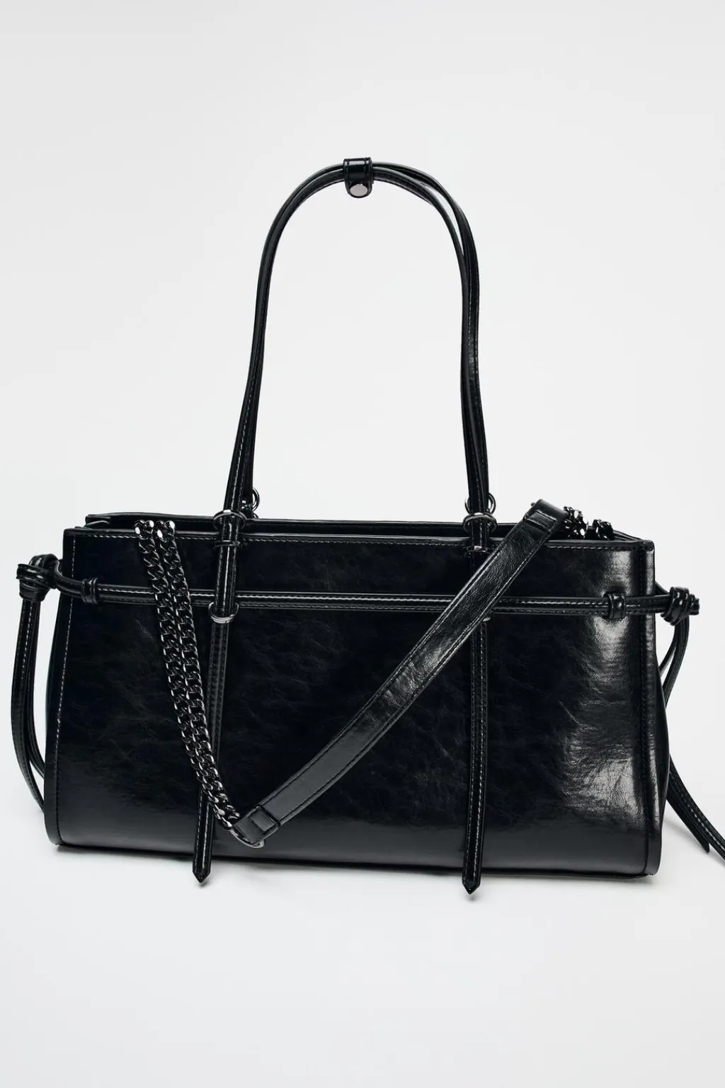 Bolso formato de hombro con forma alargada. Detalle de tira con nudos laterales en el cuerpo. Doble asa de hombro. Bolsillo interior con cremallera. Cierre mediante cremallera.