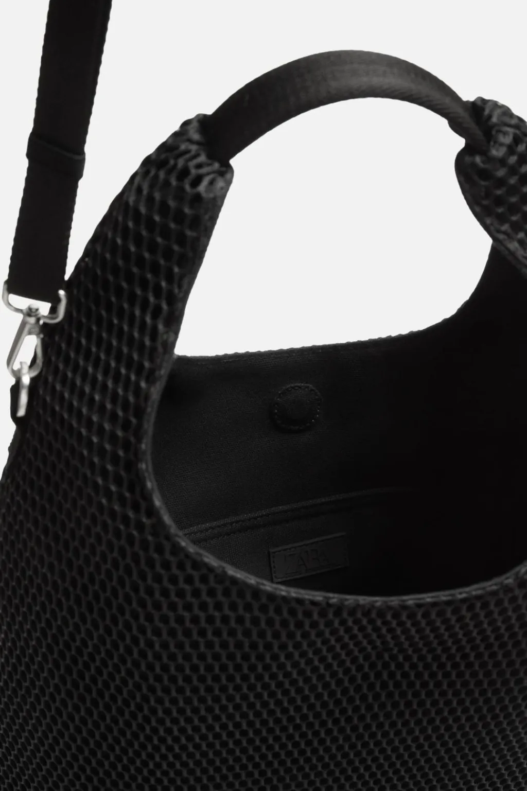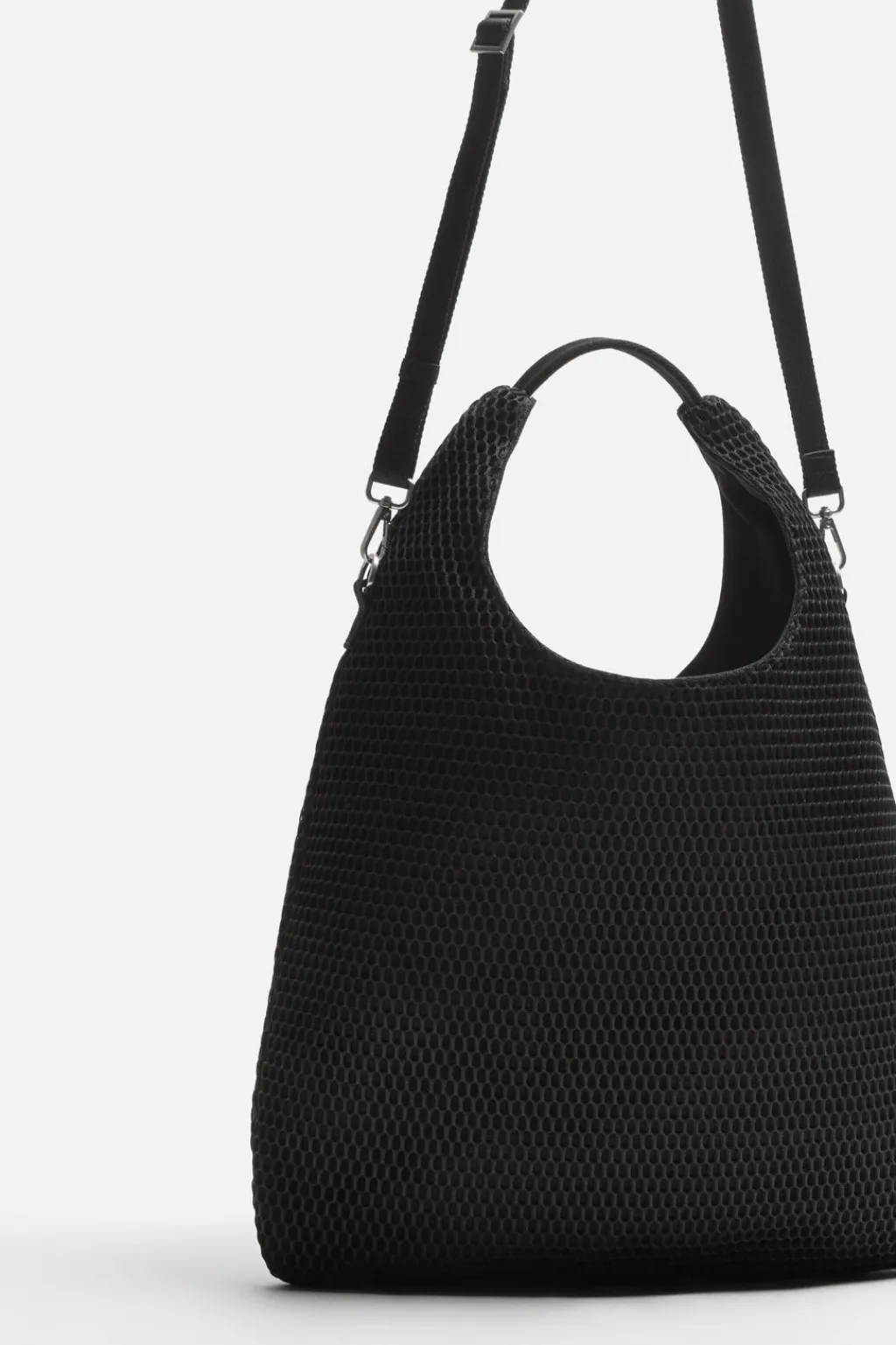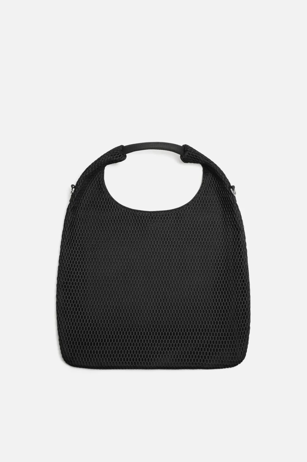 Bolso shopper fabricado en malla. Compartimento con cierre magnético y bolsillo plano. Asa de mano y asa de hombro removible yajustable.