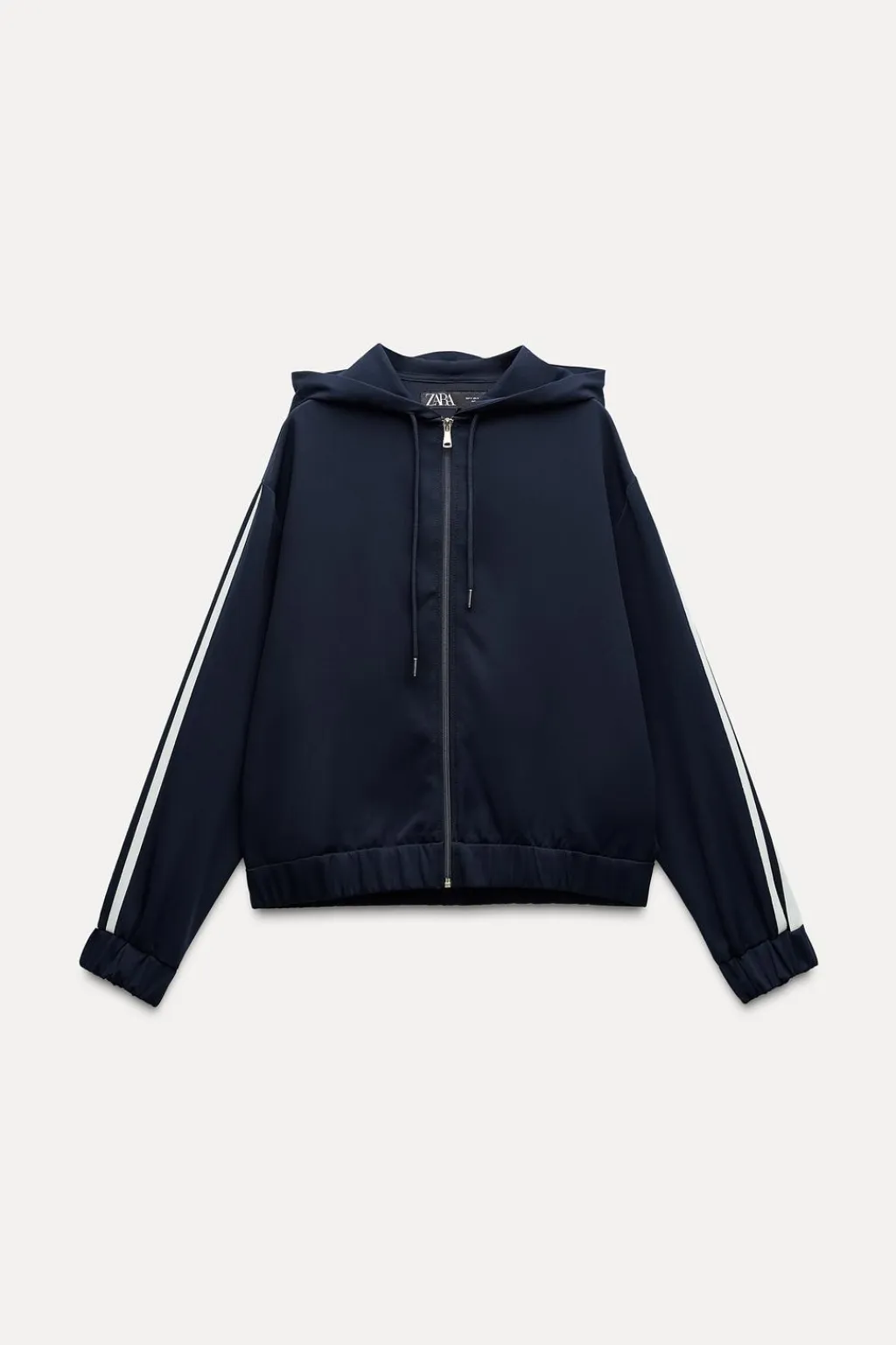 Bomber con capucha ajustable con cordones. Manga larga con bandas combinadas a contraste acabada en puño elástico. Bolsillos laterales. Bajo acabado en elástico. Cierre frontal con cremallera metálica.