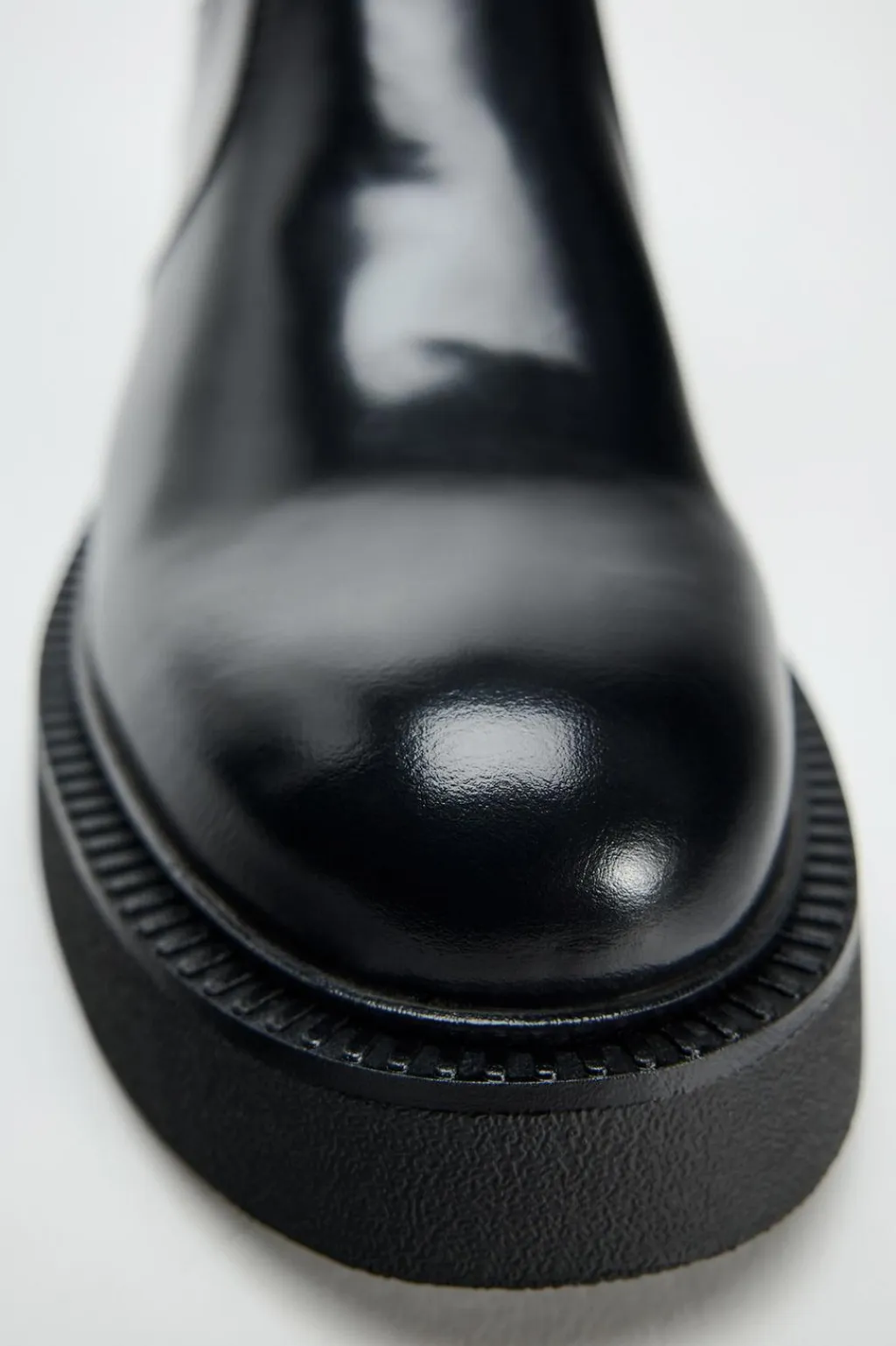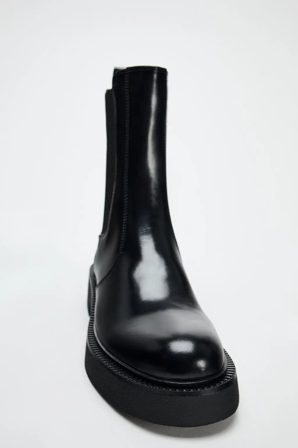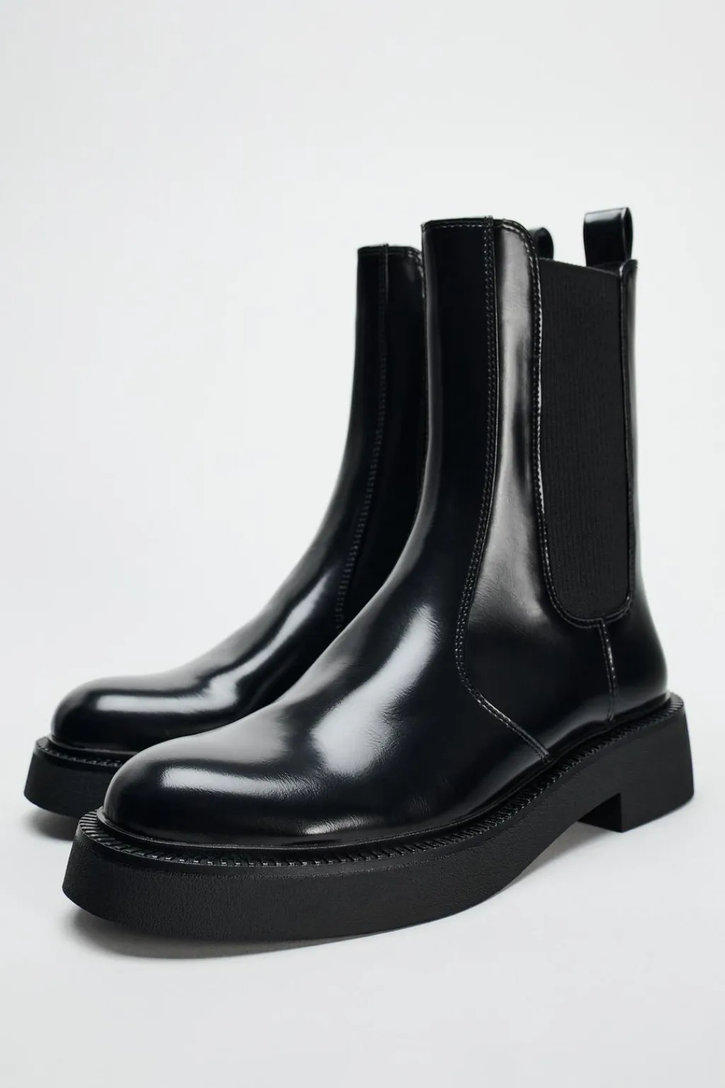 Zapato tipo botín de estilo chelsea. Suela con volumen. Paneles elásticos en los laterales. Tirador trasero. Acabado en punta redonda.