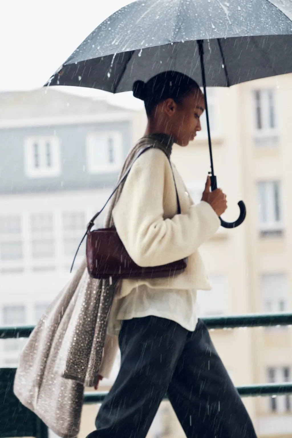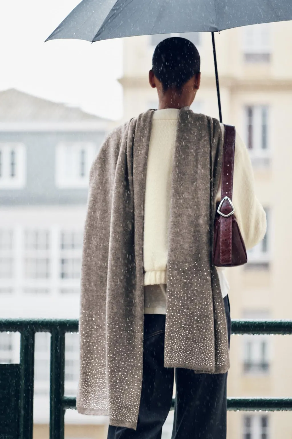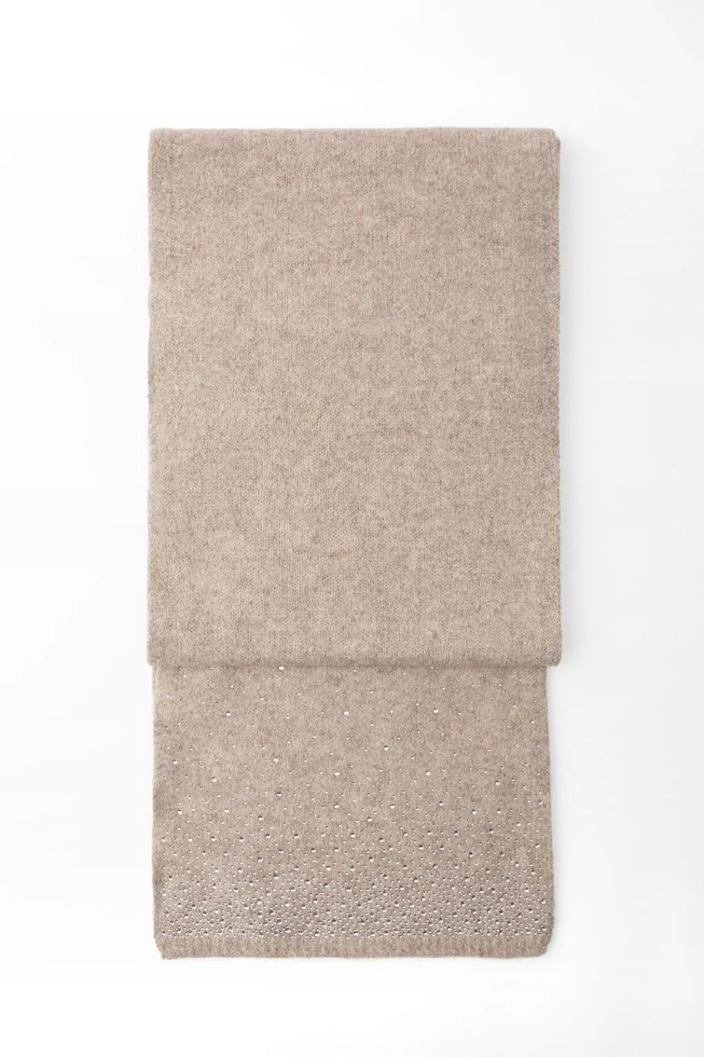 Bufanda confeccionada en mezcla de tejidos y lana 5%. Detalle aplicación de strass combinadas a contraste.