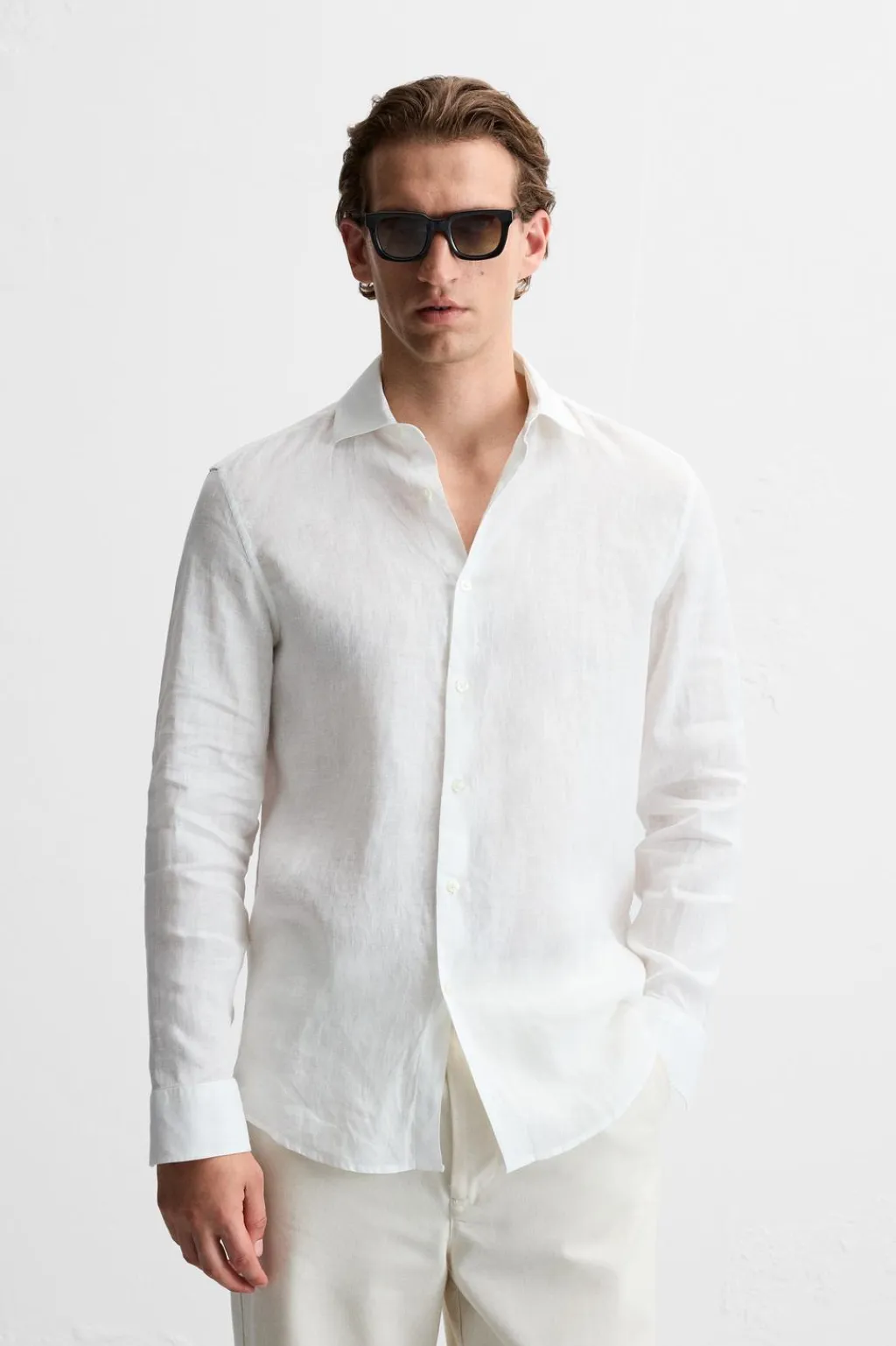 Camisa relaxed fit confeccionada en tejido de lino. Cuello solapa y manga larga acabada en puño con botón. Cierre frontal de botonadura.