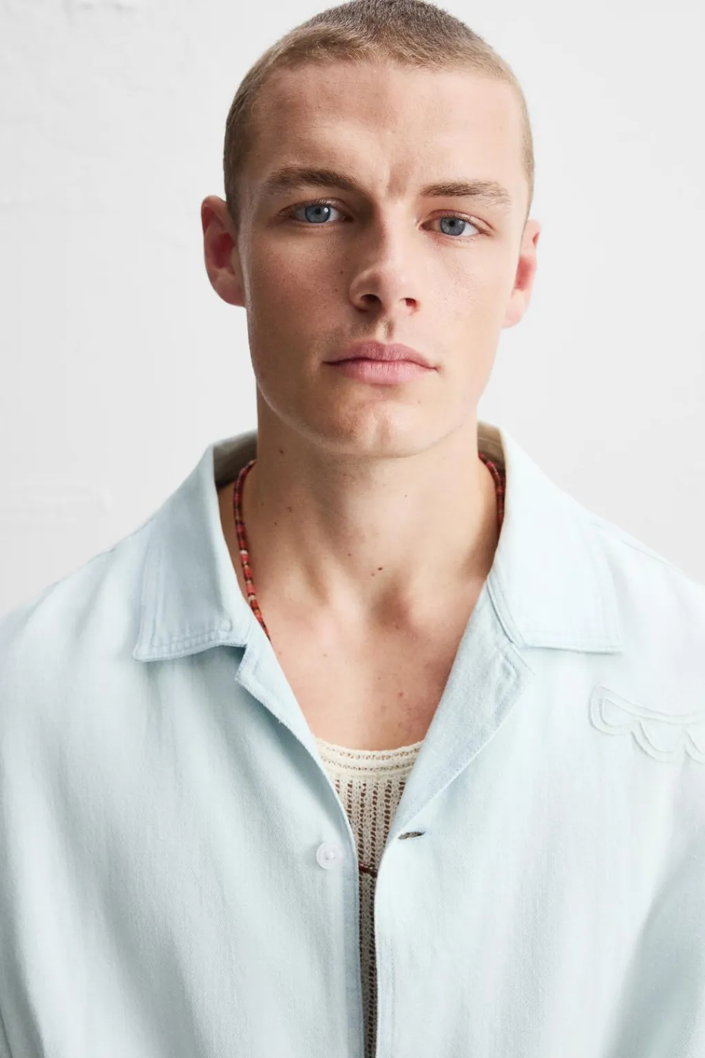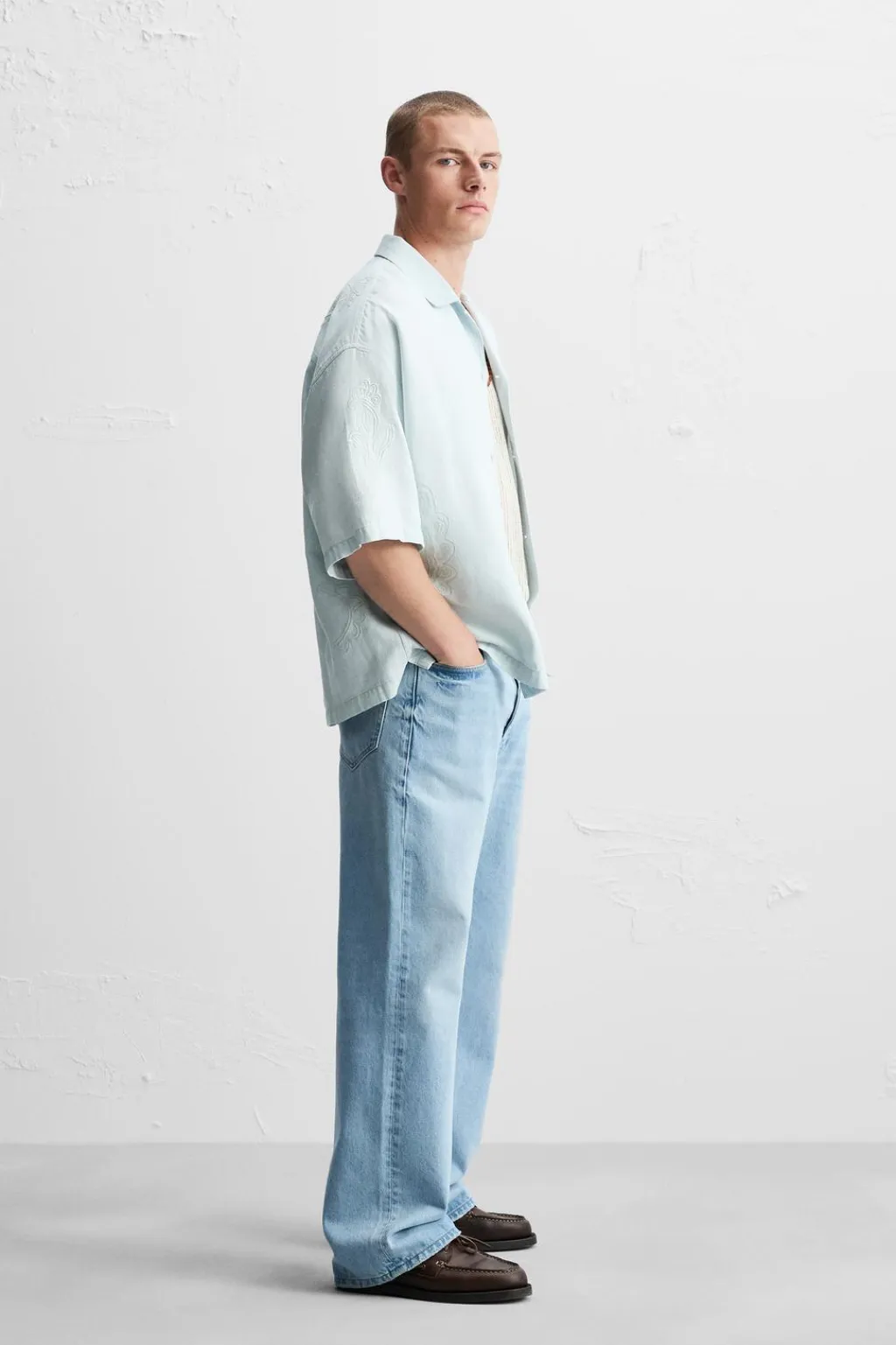 Camisa relaxed fit confeccionada en tejido con mezcla de algodón y lino. Cuello bowling y manga corta. Bordados combinados a contraste en toda la prenda. Bajo con aberturas laterales. Cierre frontal de botonadura.