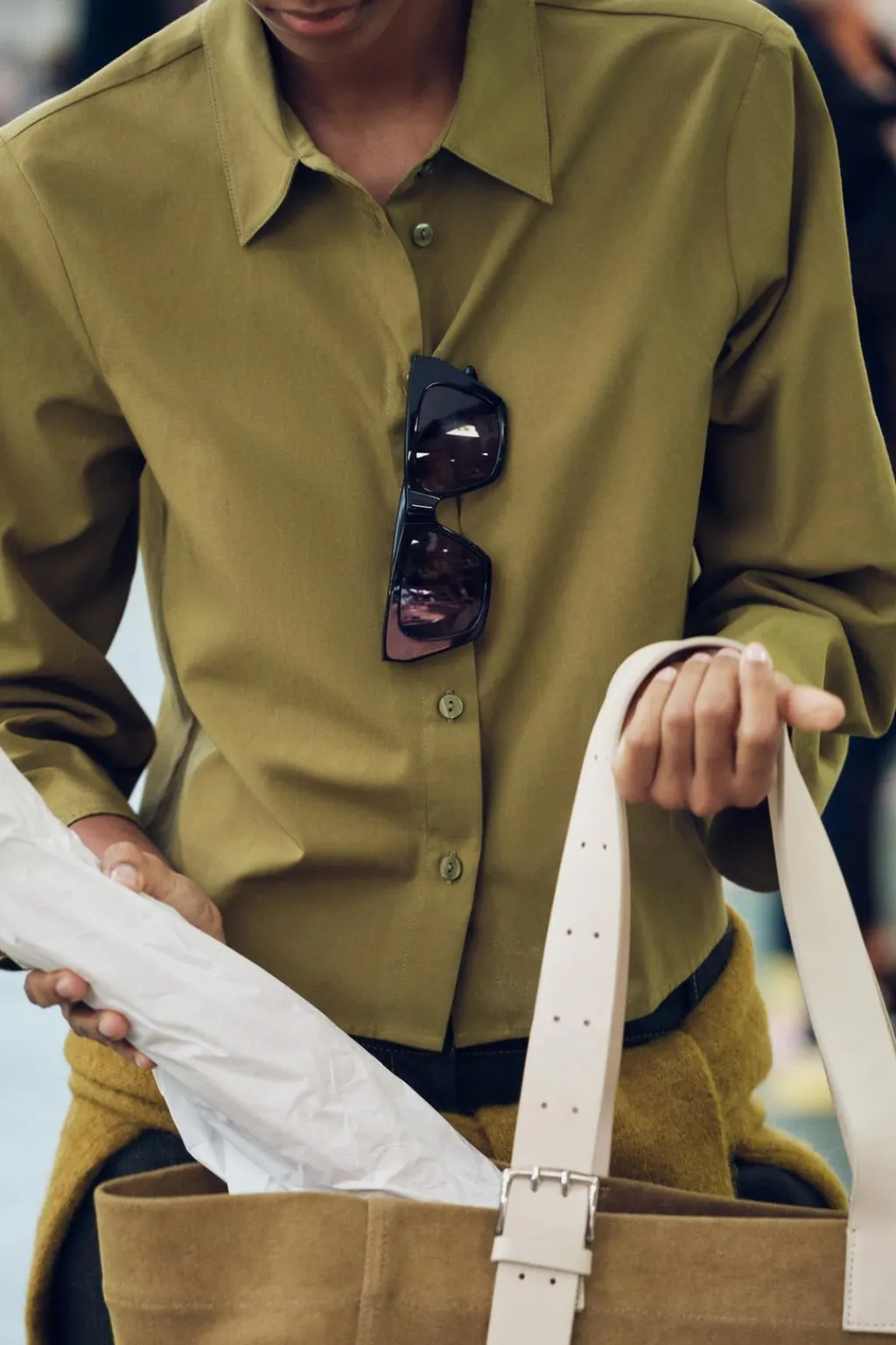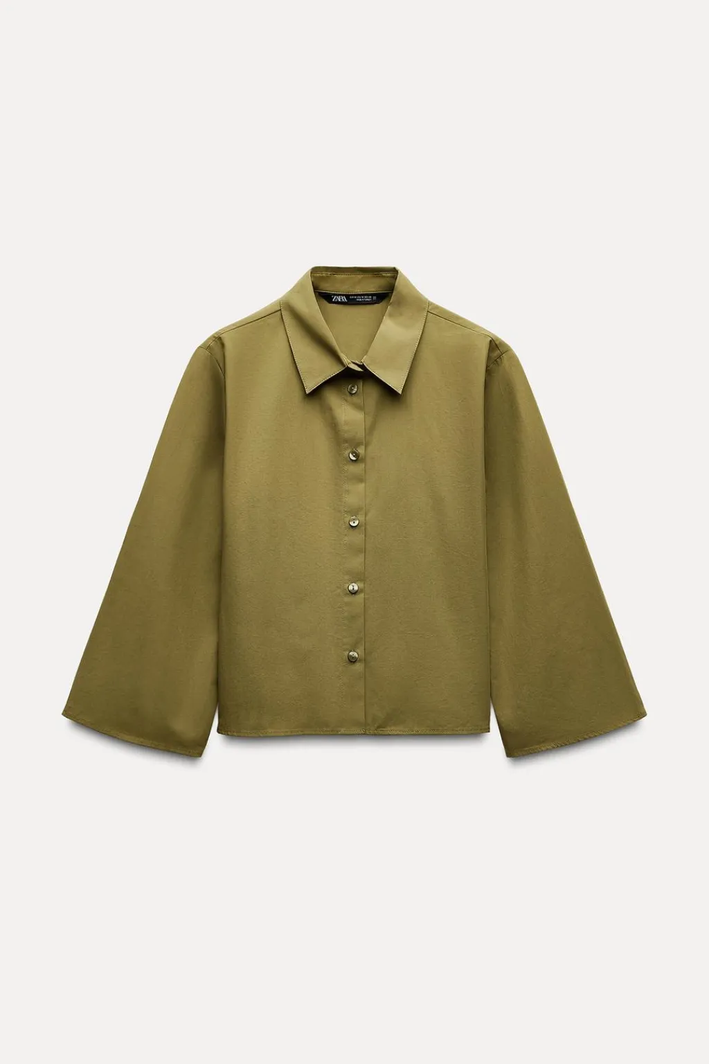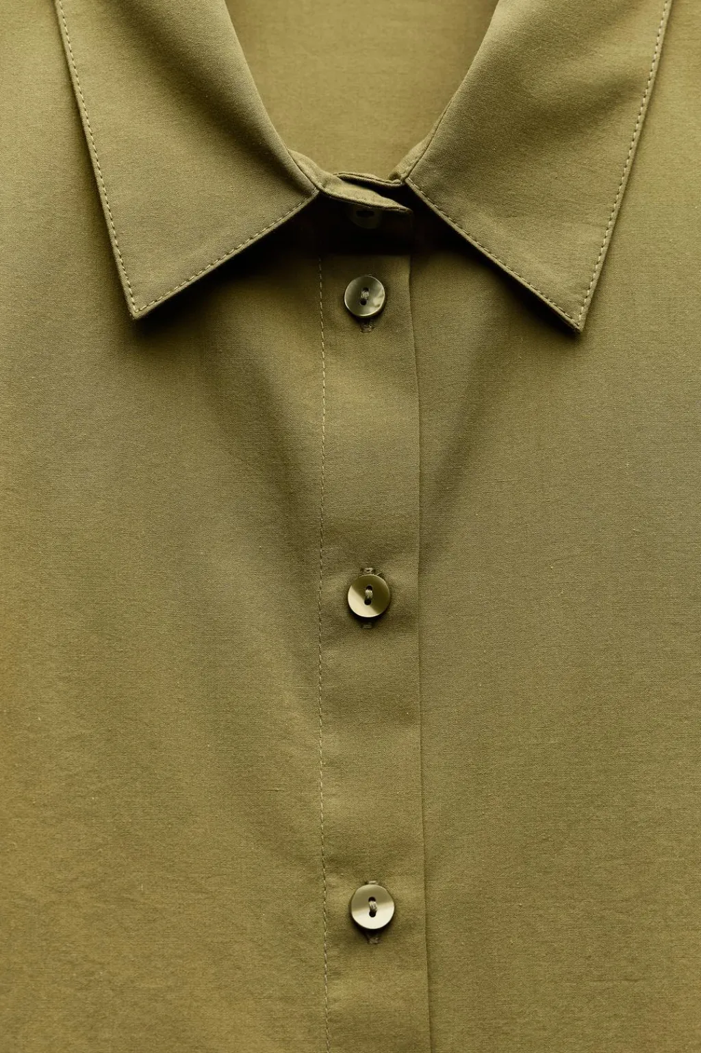 Camisa corta de cuello solapa y manga por debajo del codo. Cierre frontal con botones.