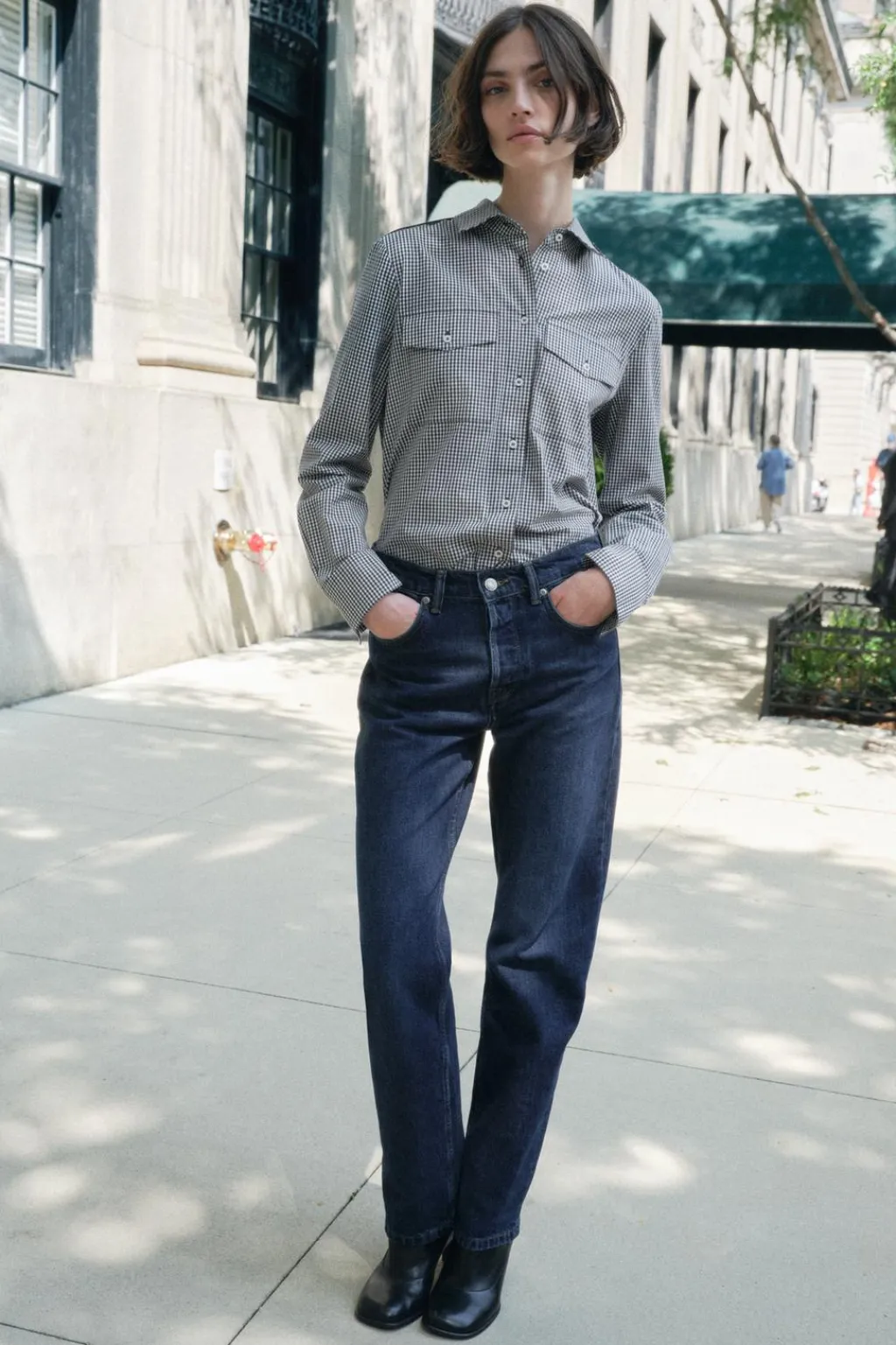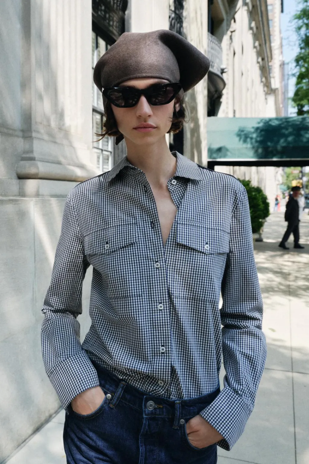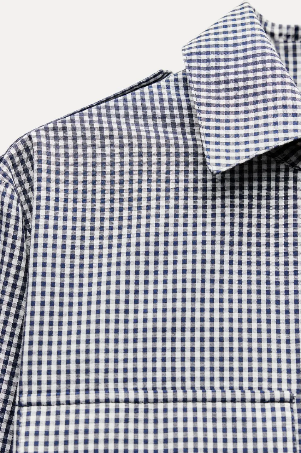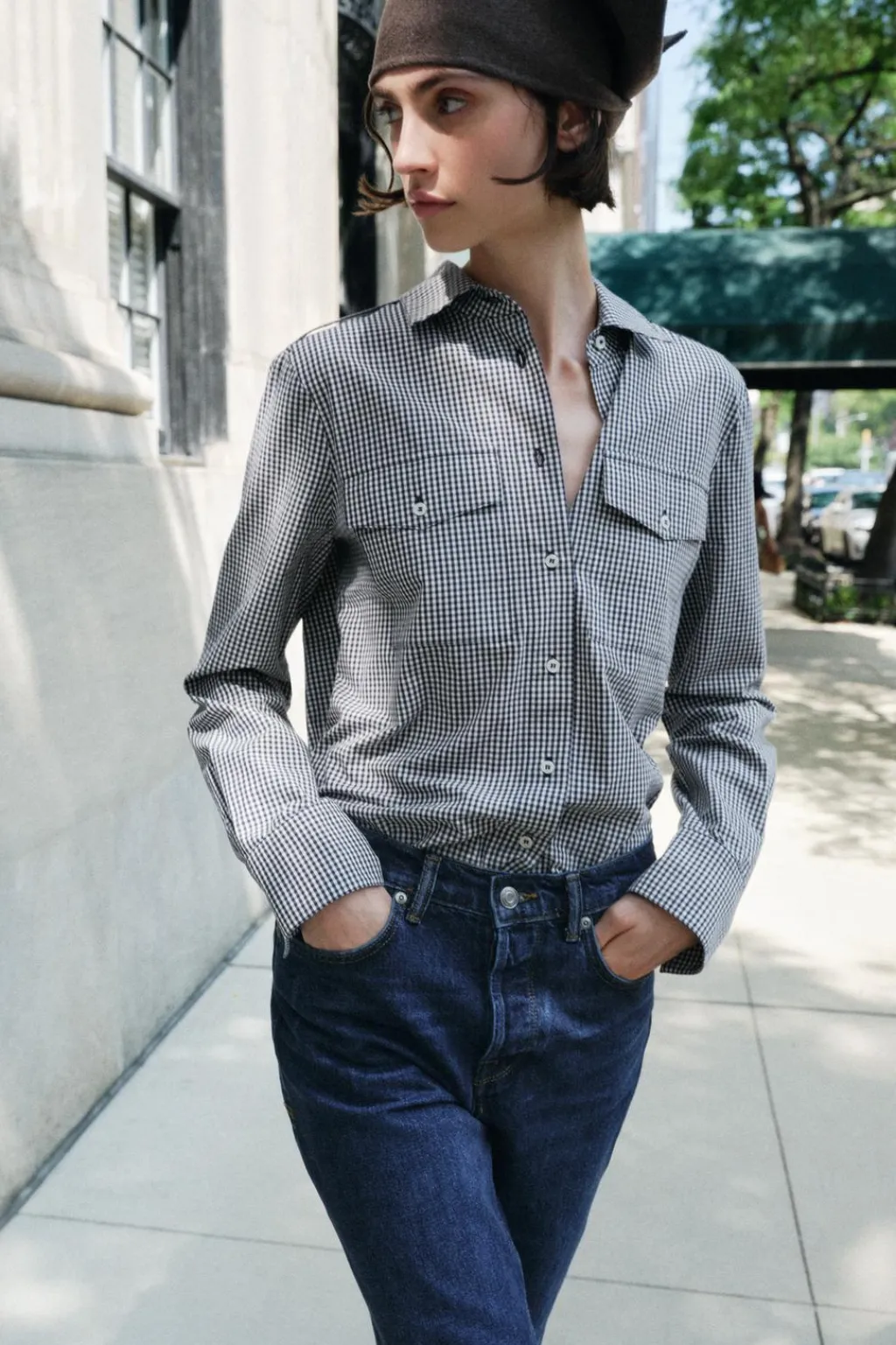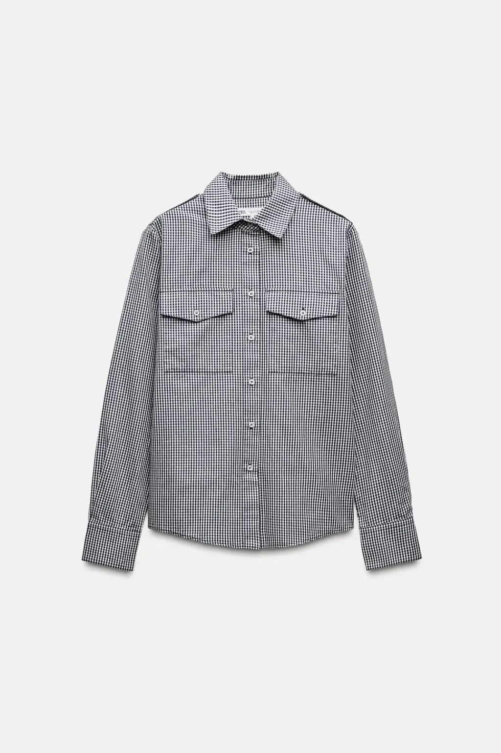 Camisa confeccionada en hilatura de algodón 100%. Cuello solapa y manga larga acabada en puño. Bolsillos de plastrón con solapa y botón en pecho. Detalle de trabillas en hombros. Bajo asimétrico. Cierre frontal con botones.