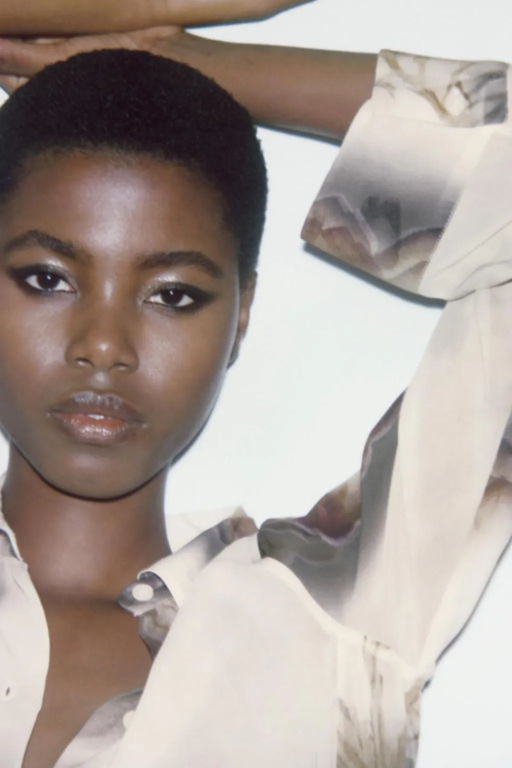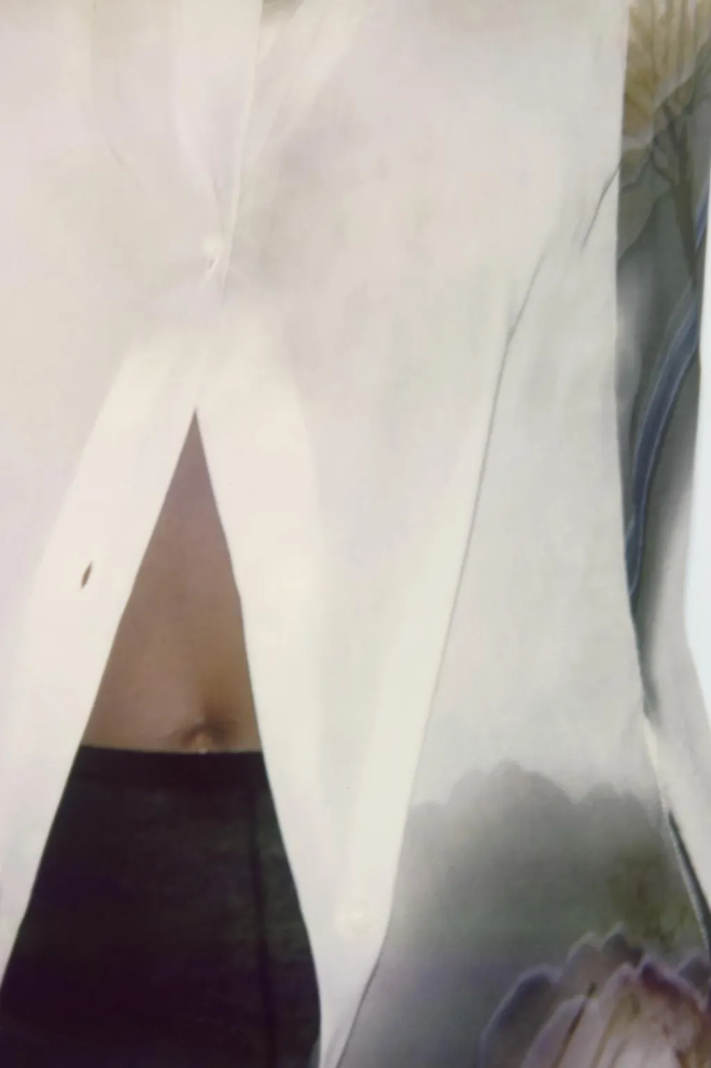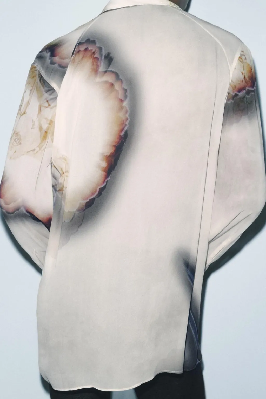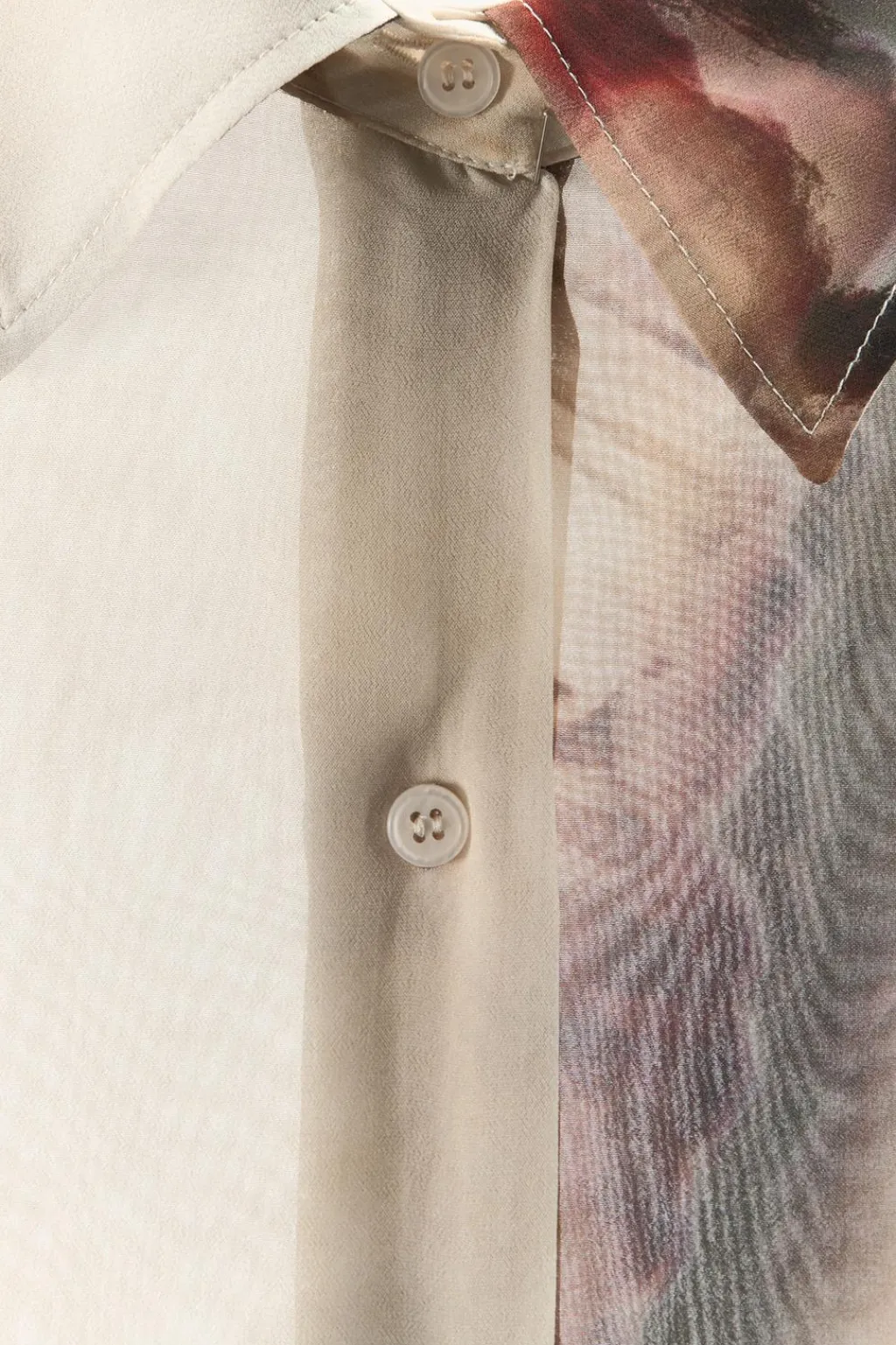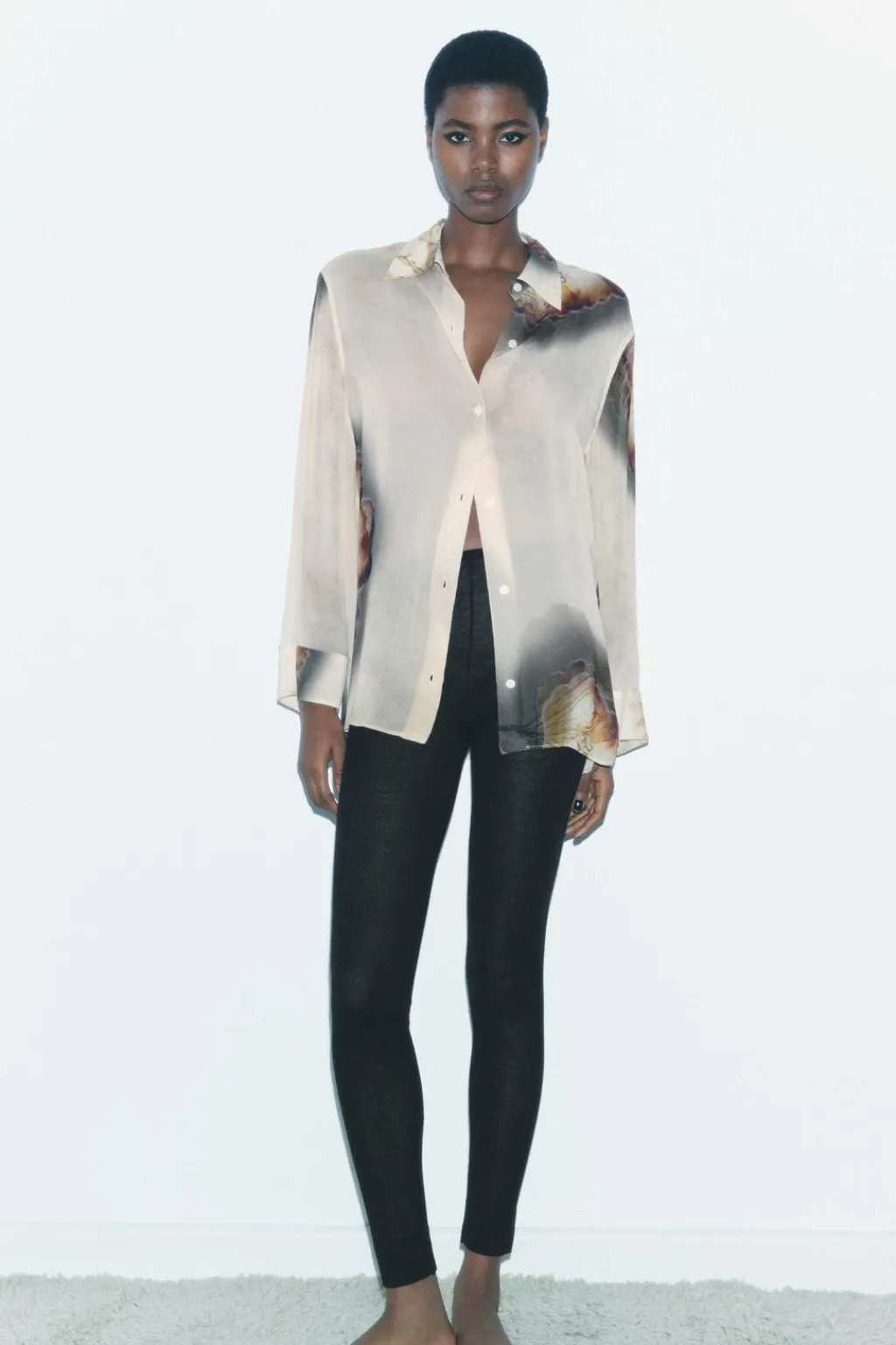 Camisa semitransparente confeccionada en hilatura de viscosa 100%. Cuello solapa y manga larga acabada en puño. Bajo con aberturas laterales. Cierre frontal con botones.
