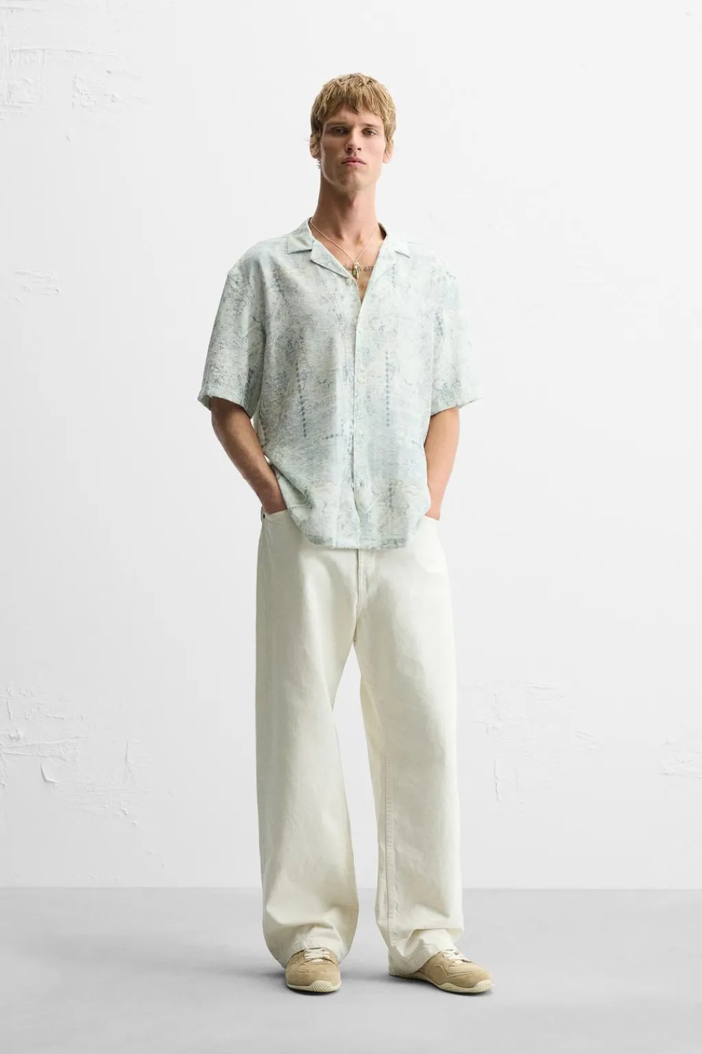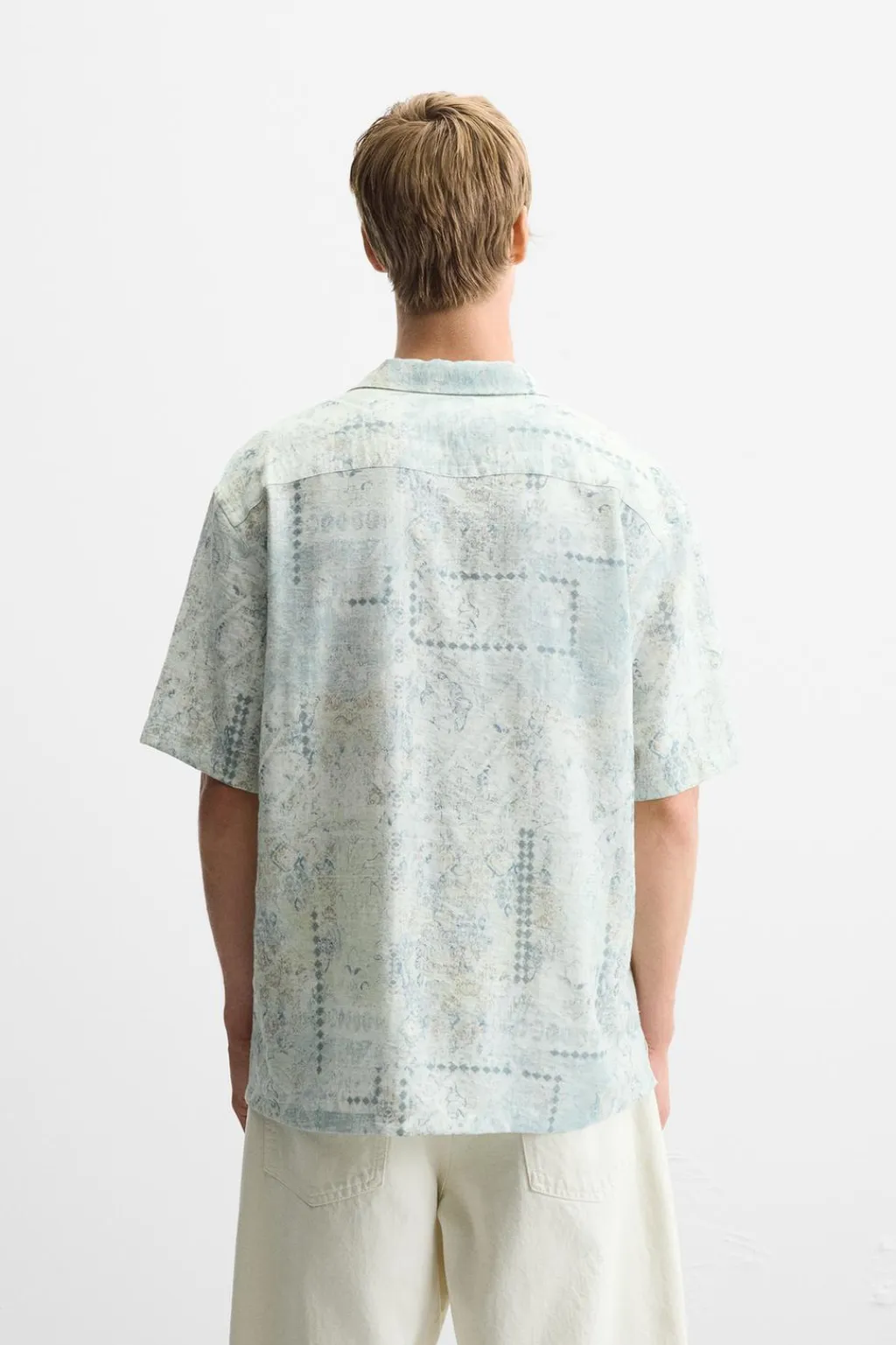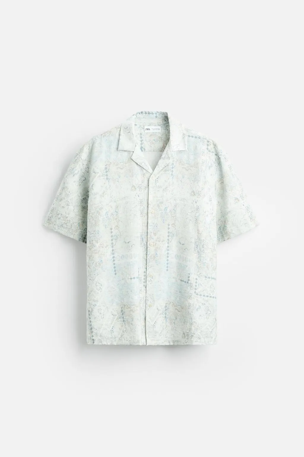 Camisa fluida regular fit confeccionada en tejido con mezcla de viscosa. Cuello bowling y manga corta. Cierre frontal de botonadura.