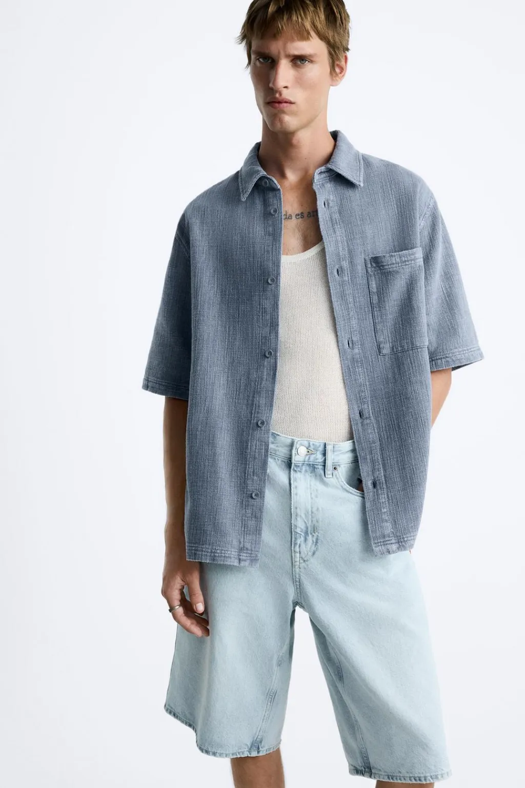 Camisa relaxed fit confeccionada en tejido de algodón con estructura. Cuello solapa y manga corta. Bolsillo plastrón en pecho. Cierre frontal de botonadura.