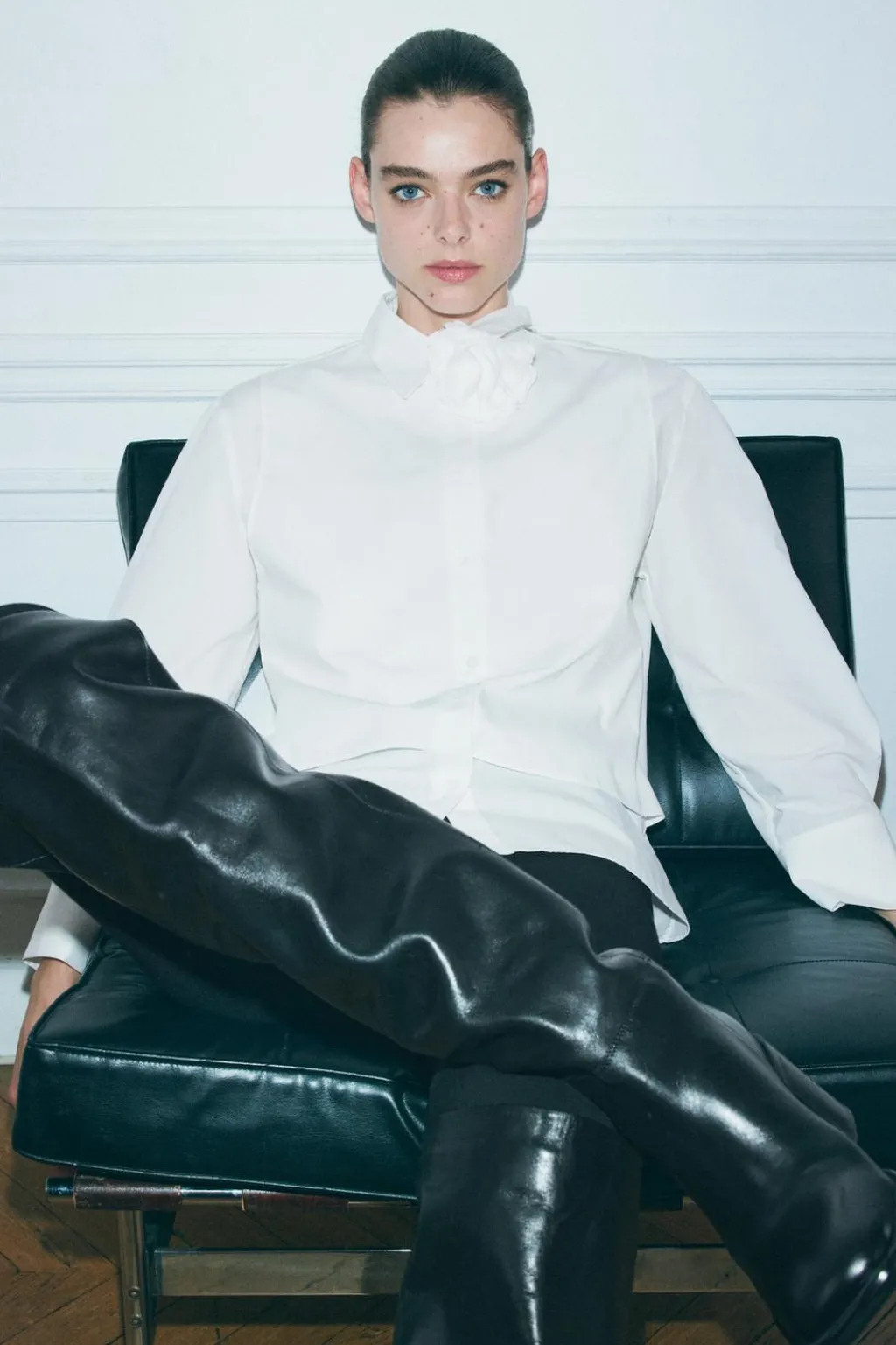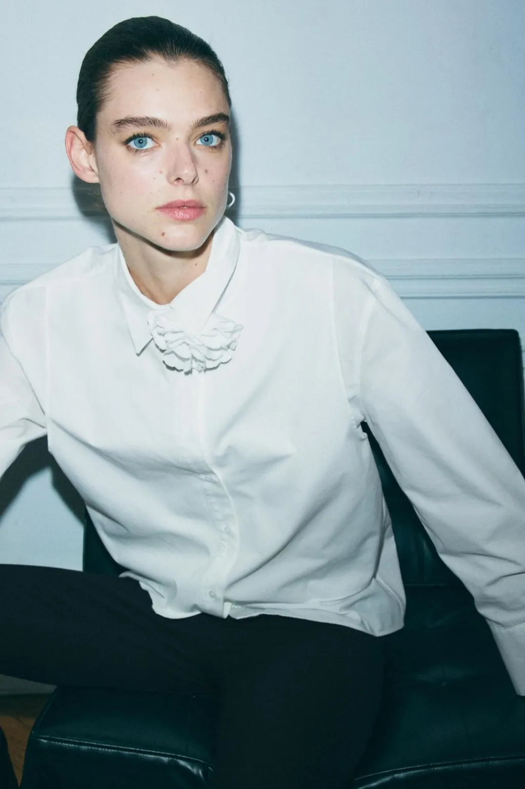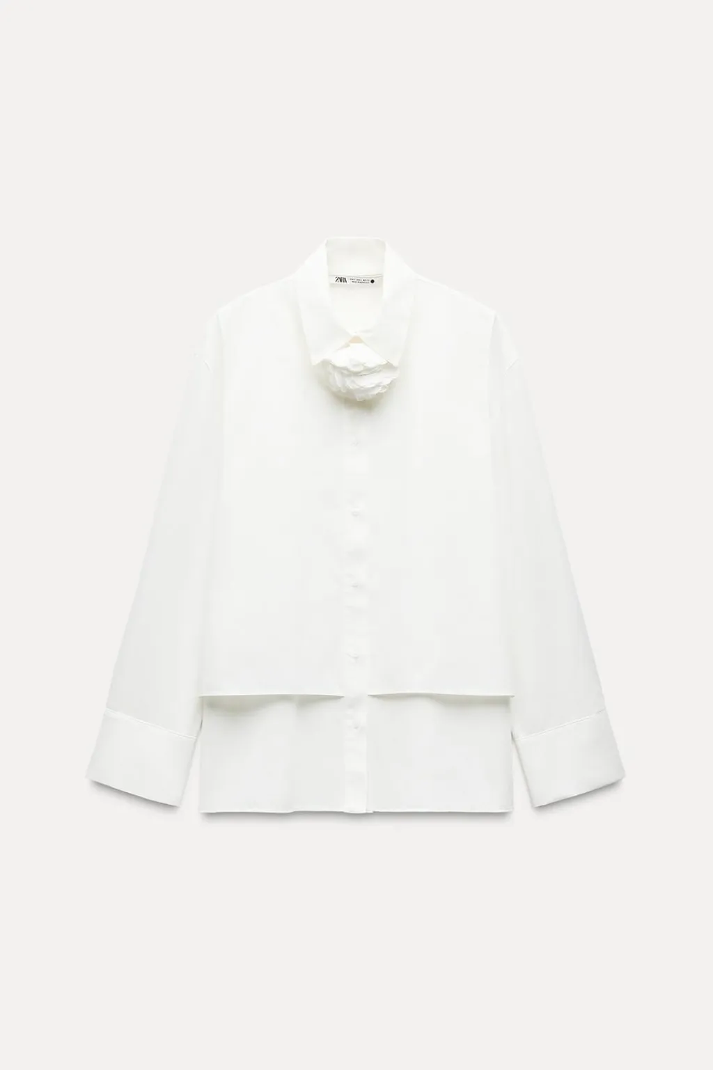 Camisa de cuello solapa y manga larga acabada en puño. Detalle de flor en mismo tejido. Bajo asimétrico. Cierre frontal con botones.