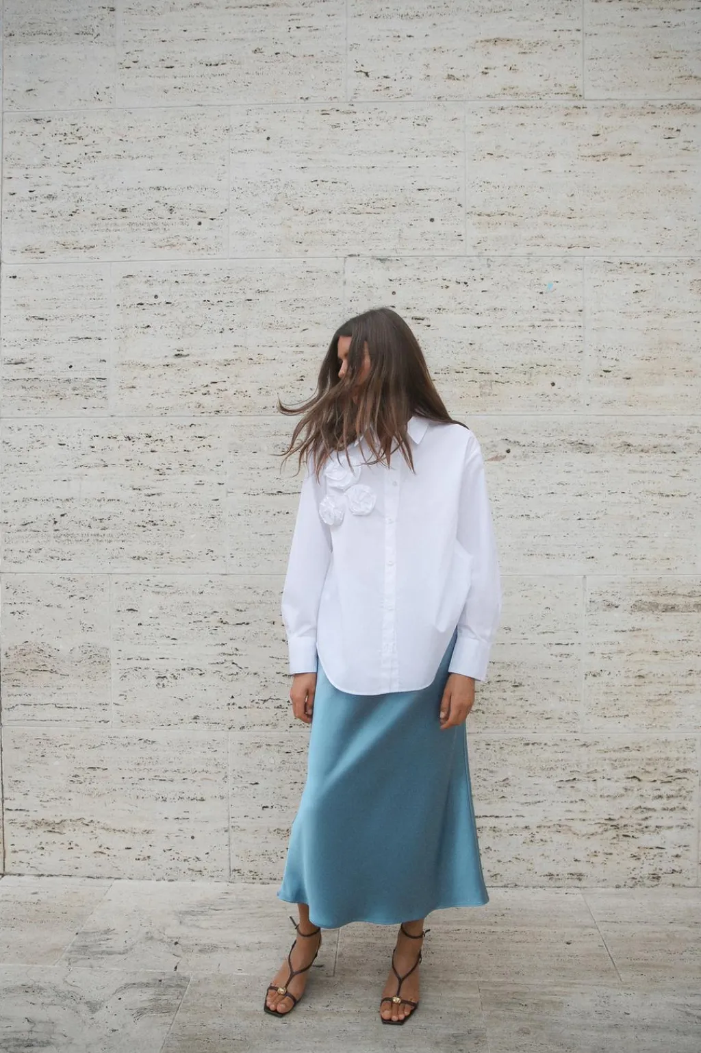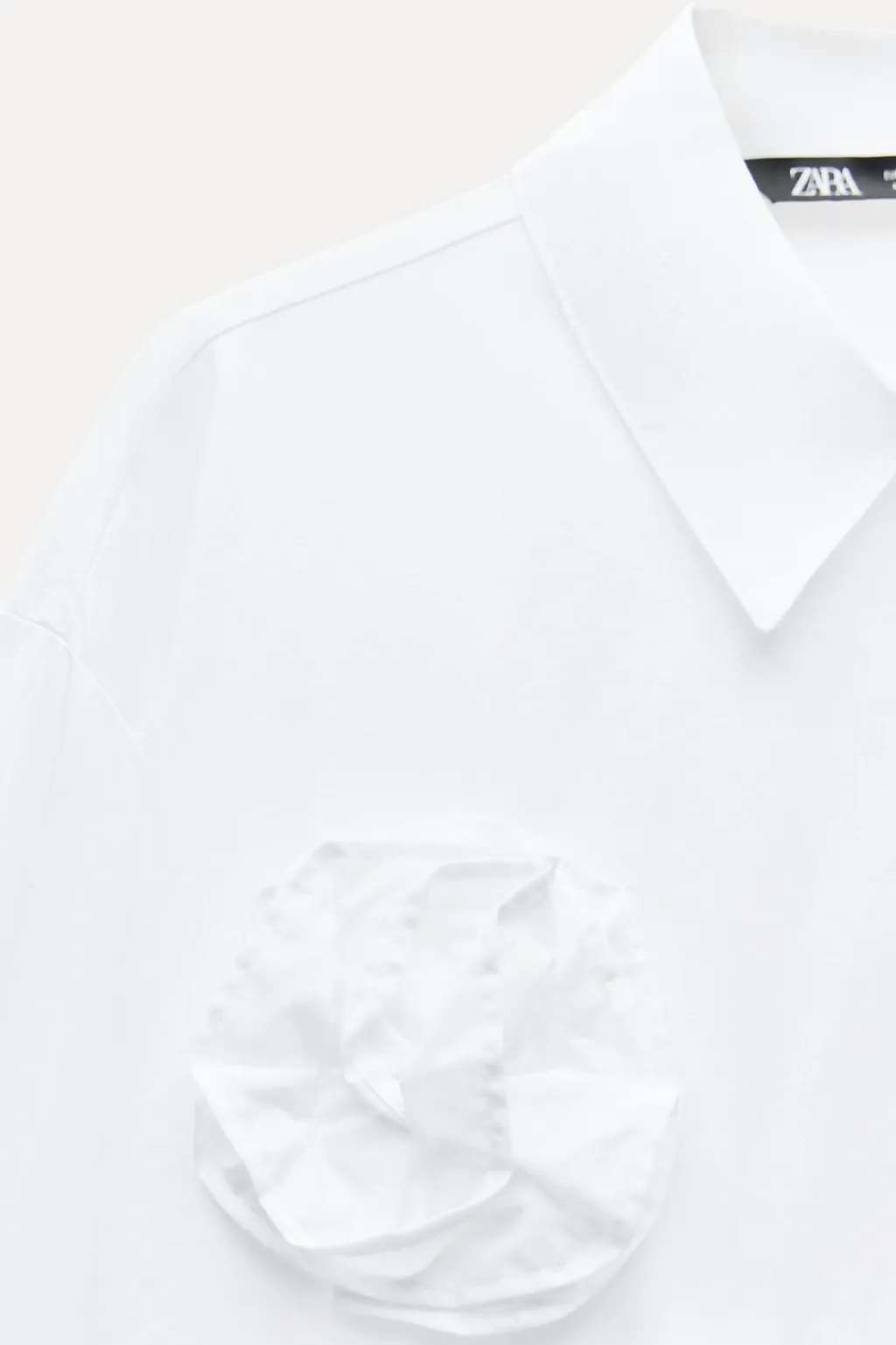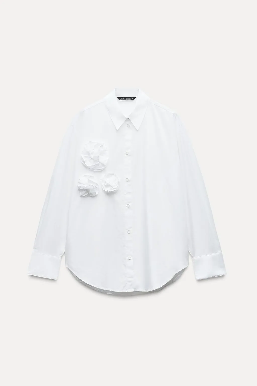 Camisa de cuello solapa y manga larga. Detalle de flores delanteras con tejido en estructura. Cierre frontal con botones.
