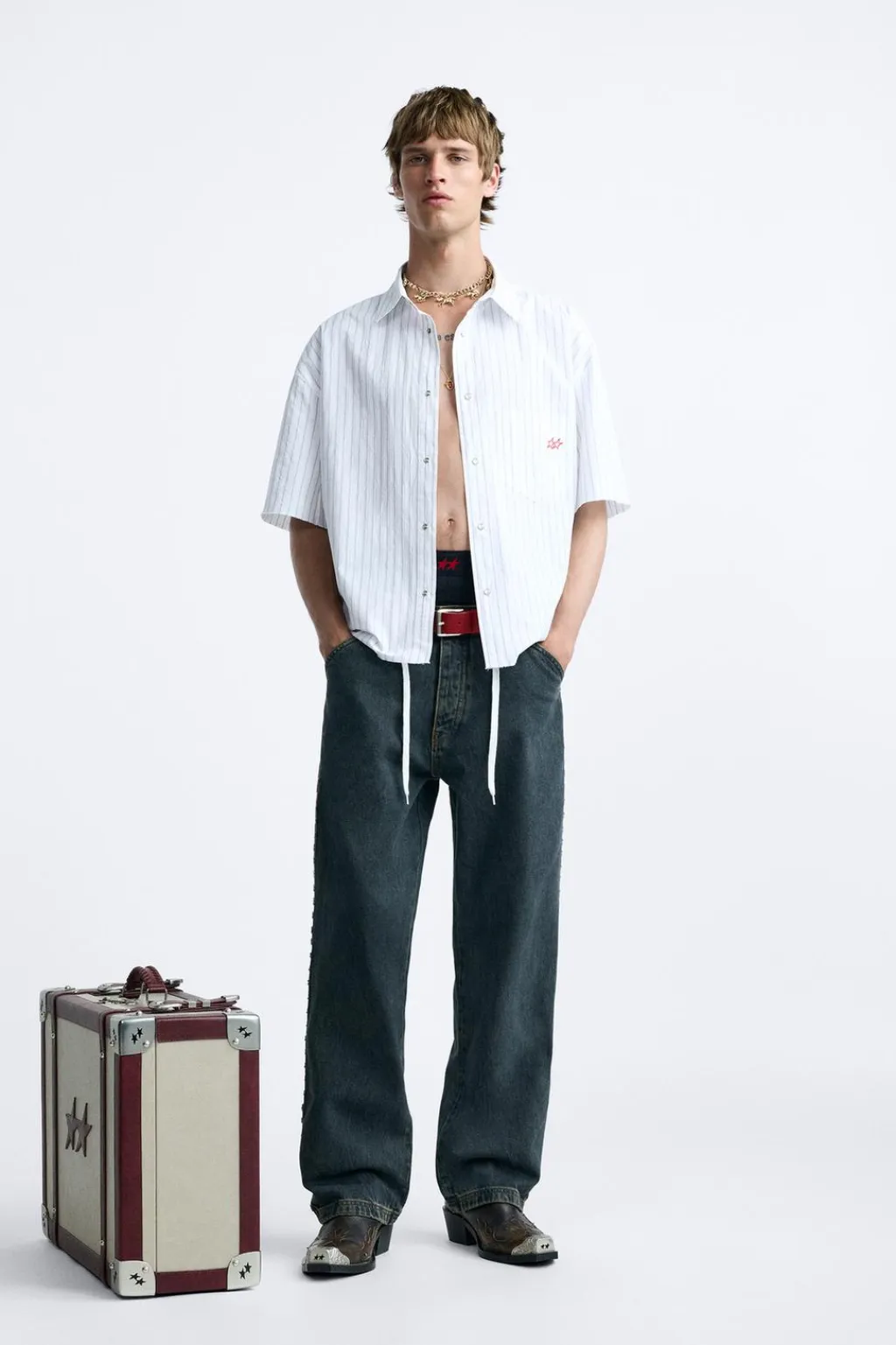 Camisa cropped fit confeccionada en tejido de algodón. Cuello solapa y manga corta. Bolsillo plastrón con bordado combinado a contraste.Estampación combinada a contraste en espalda. Acabados irregulares. Cierre frontal con botones a presión.