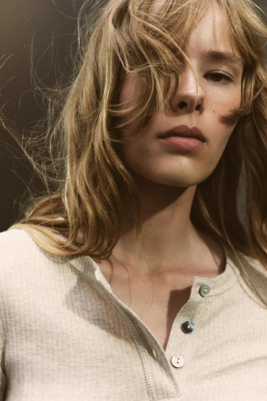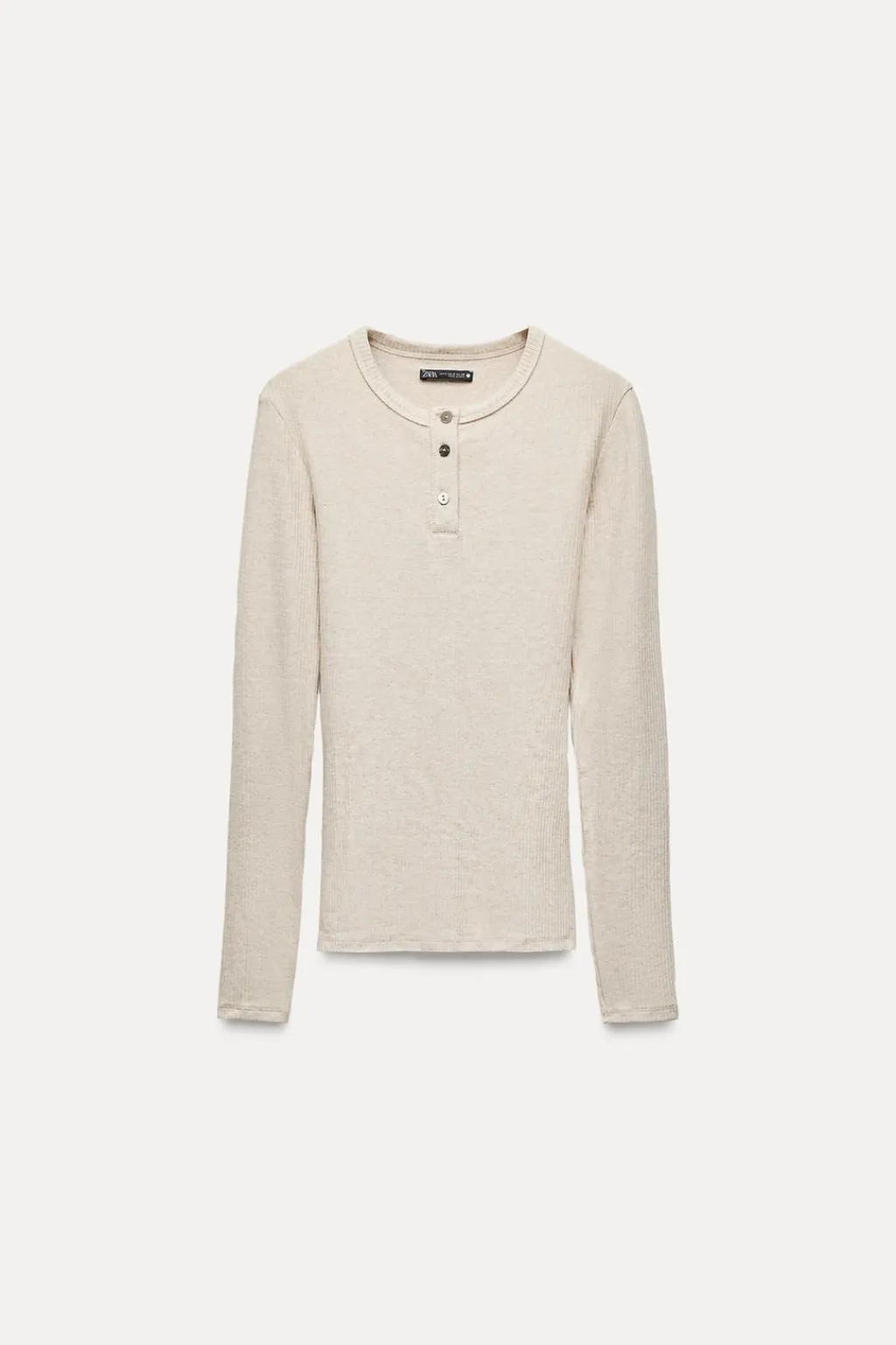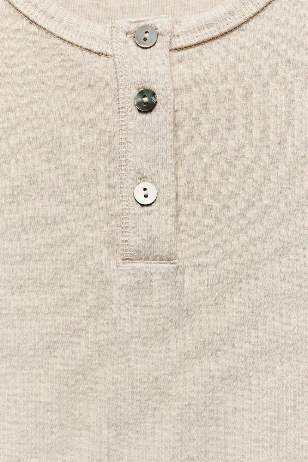 Camiseta confeccionada en hilatura con algodón y modal. Cuello redondo y manga larga. Cierre frontal con botones.