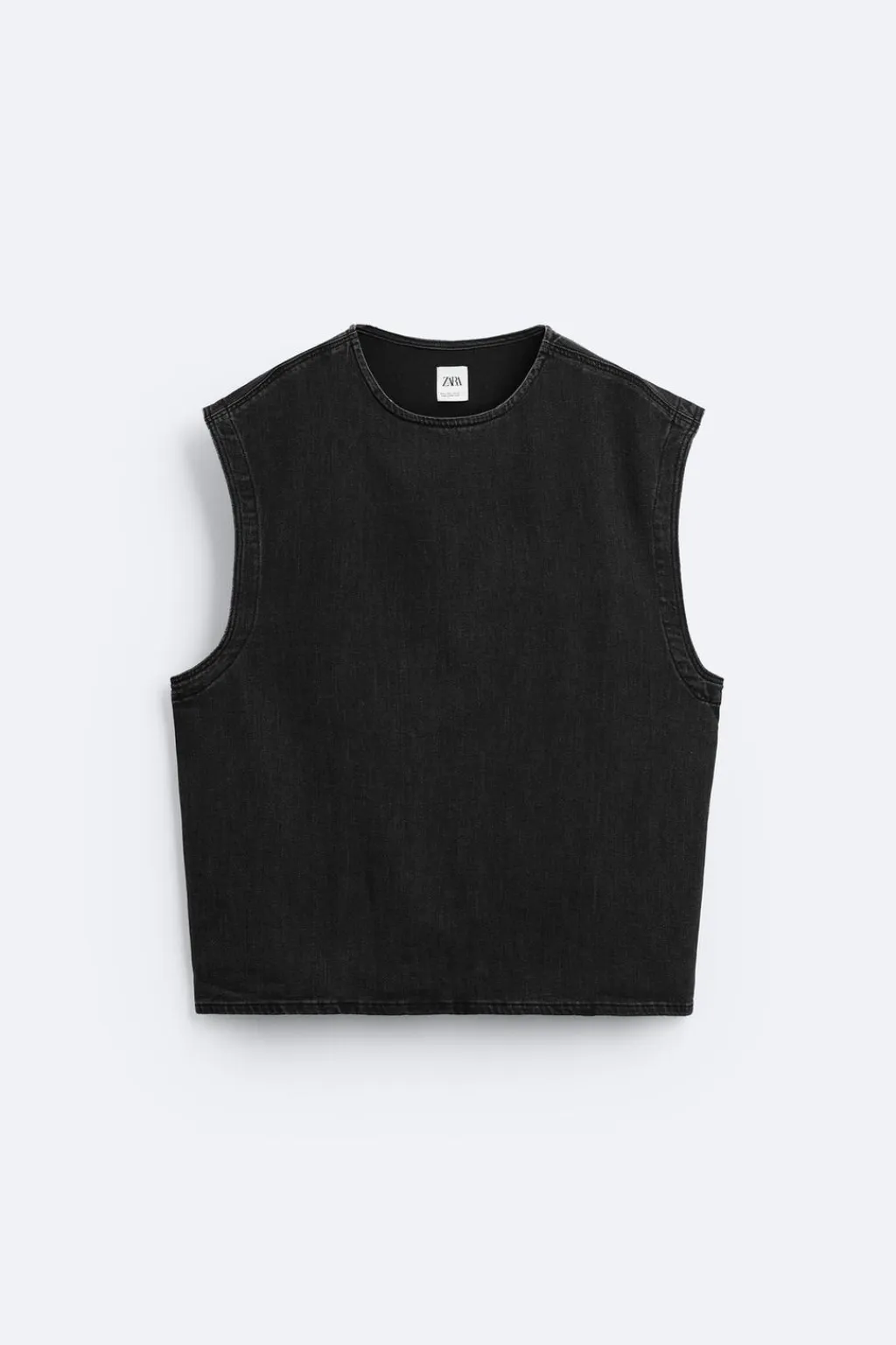 Camiseta relaxed fit confeccionada en denim de algodón. Cuello redondo y manga sisa. Efecto lavado.