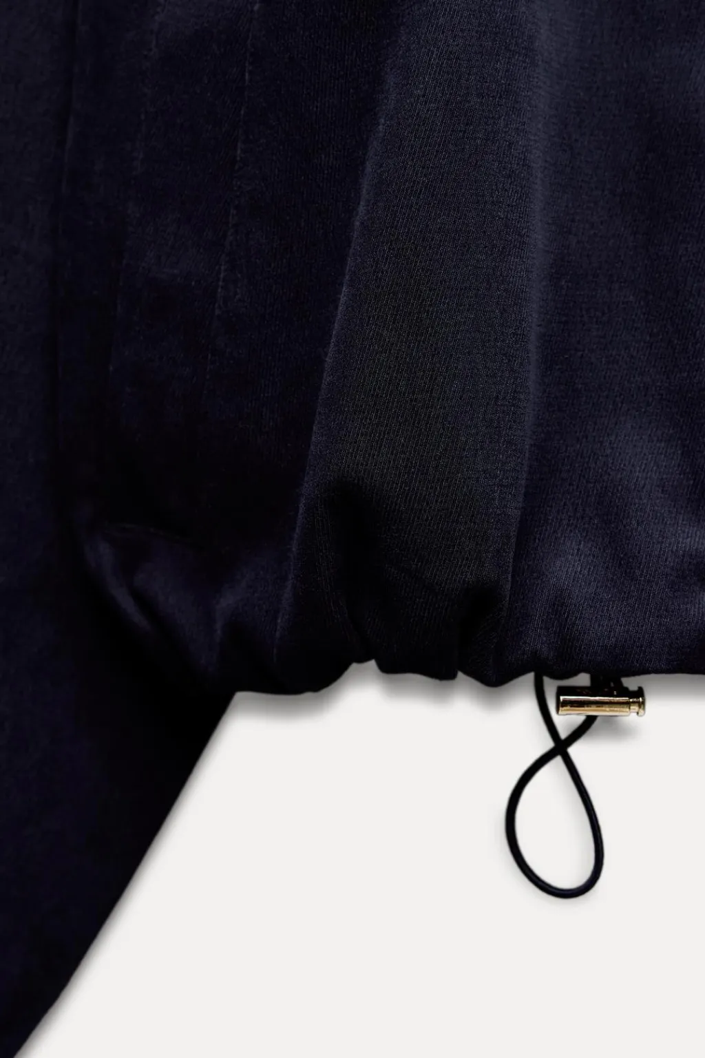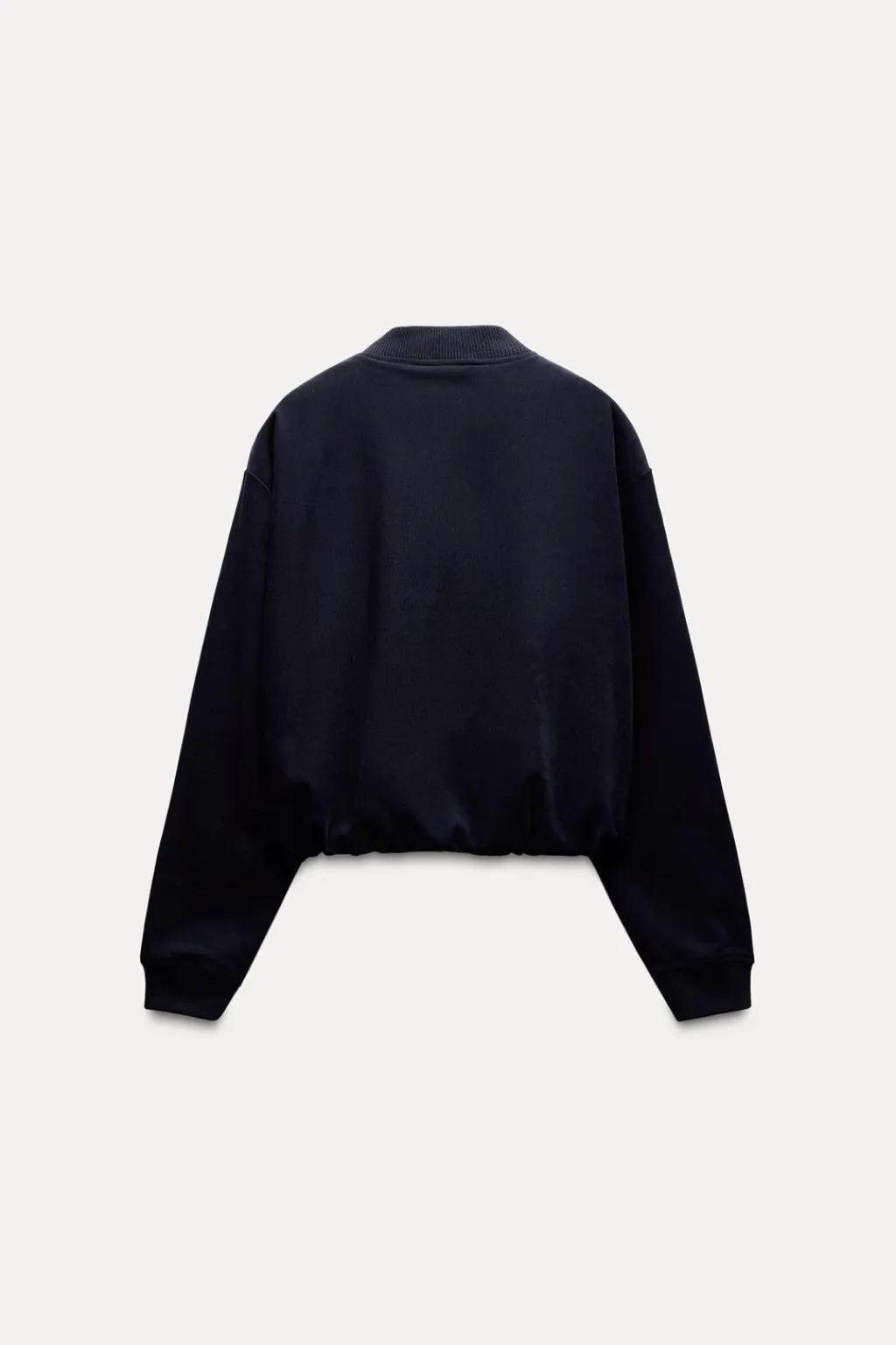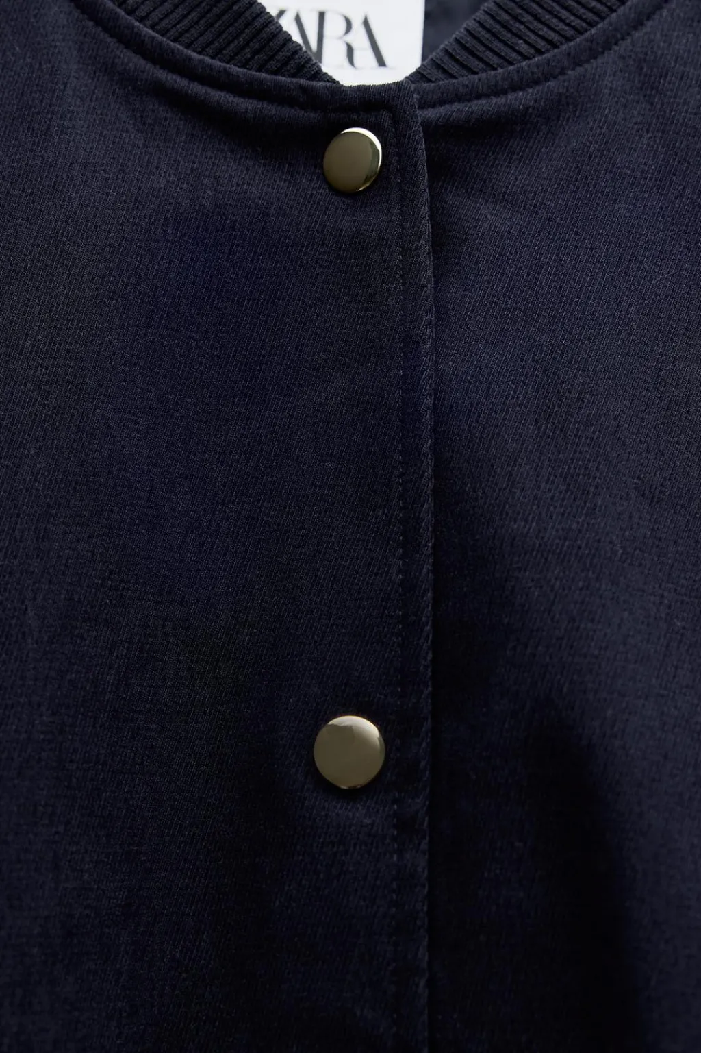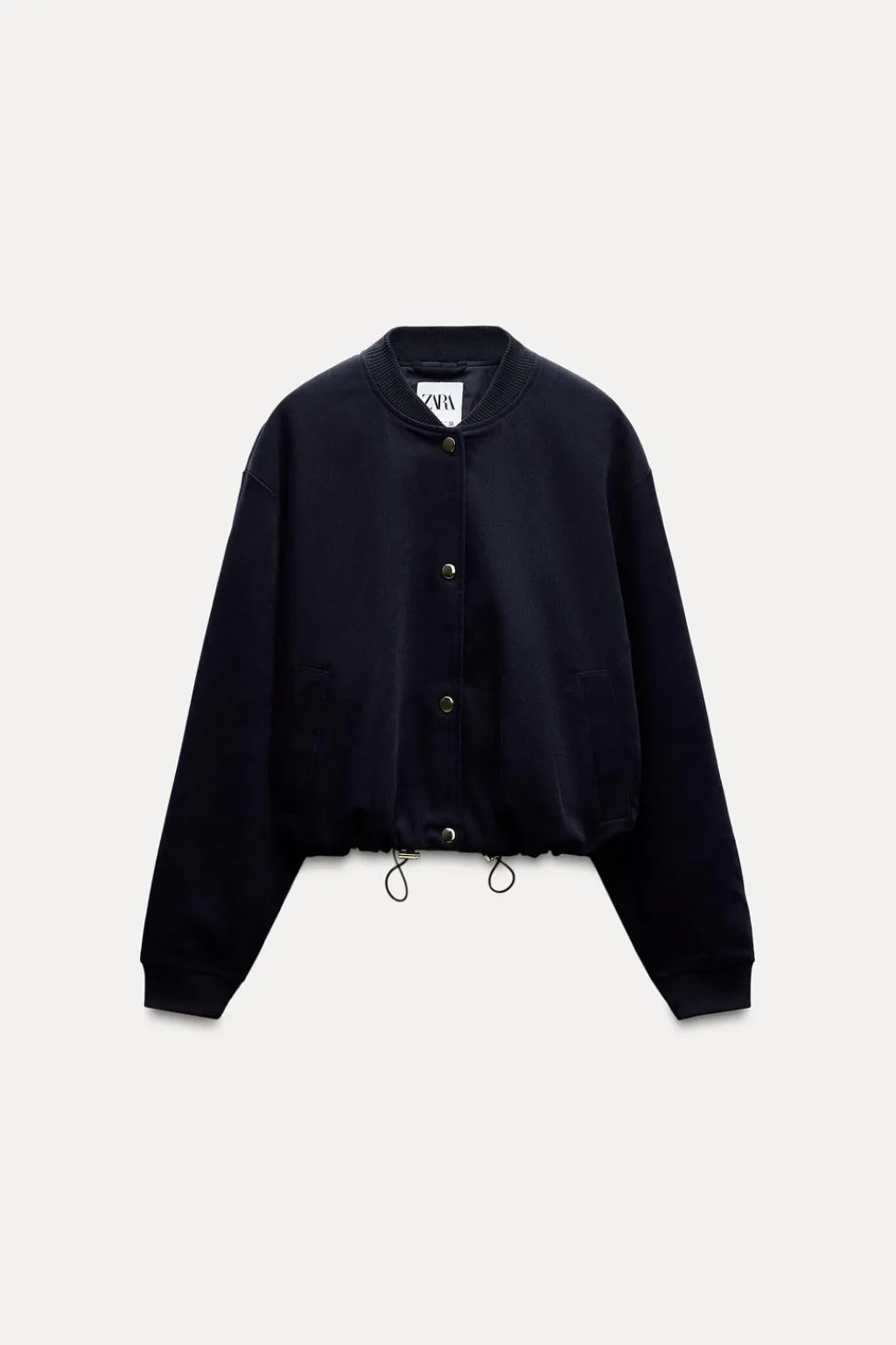 Bomber de cuello redondo y manga larga acabada en puño elástico. Bolsillos de vivo en delantero. Forro interior. Bajo ajustable con cordón elástico y stoppers. Cierre frontal con botones metálicos.