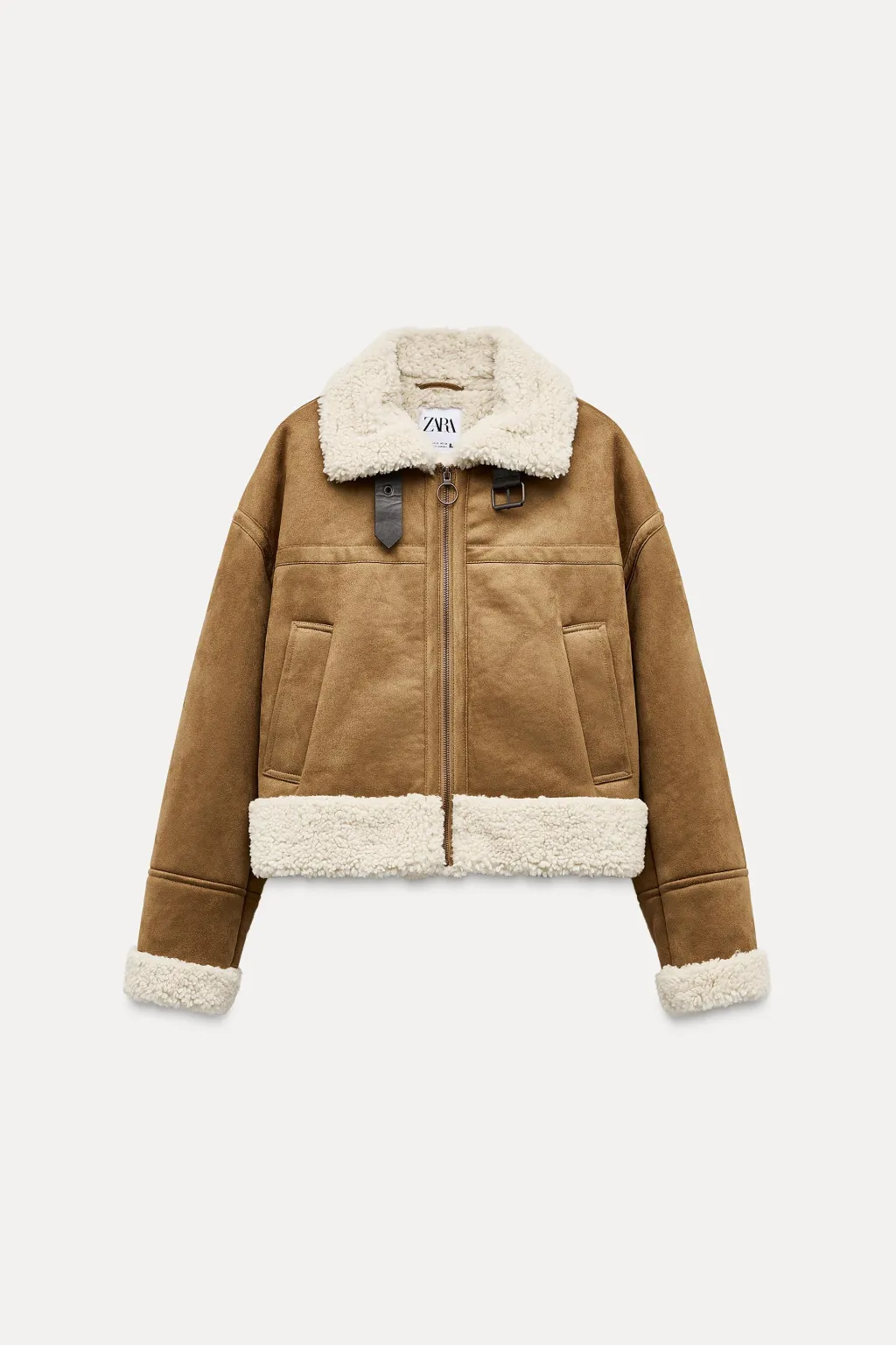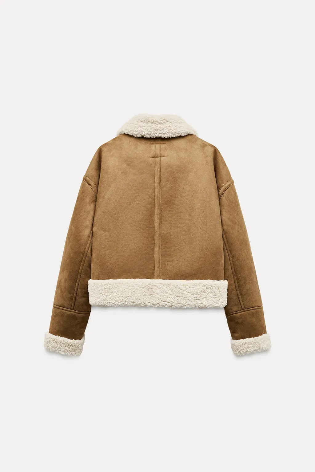 Cazadora de cuello solapa con trabilla y manga larga. Bolsillos delanteros de vivo. Detalle de tejido interior combinado en borreguito. Cierre frontal con cremallera.