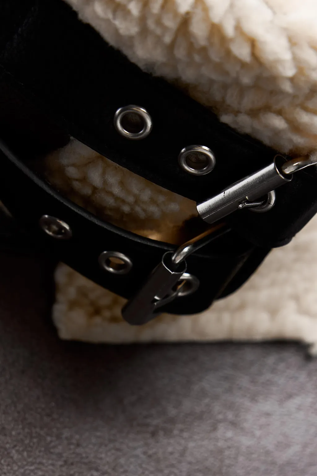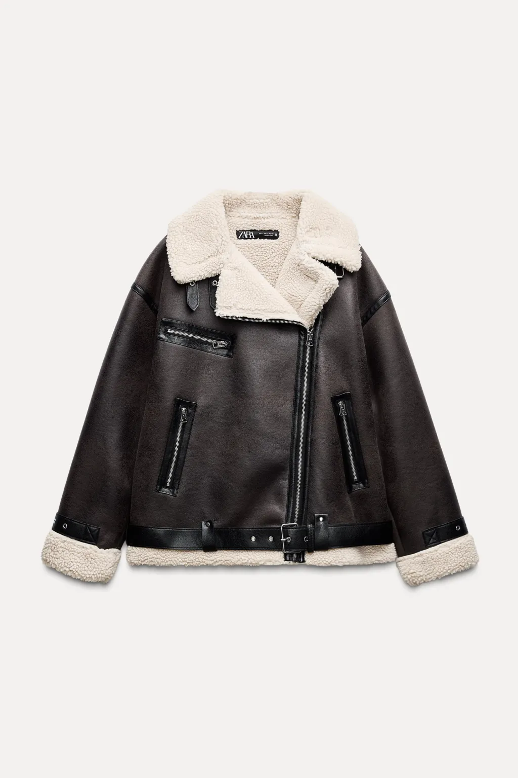 Cazadora de cuello con solapa y trabilla. Manga larga y bajo acabado con cinturón. Detalle de tejido interior combinado en borreguito. Bolsillos delanteros con cierre de cremallera. Cierre frontal cruzado con cremallera.