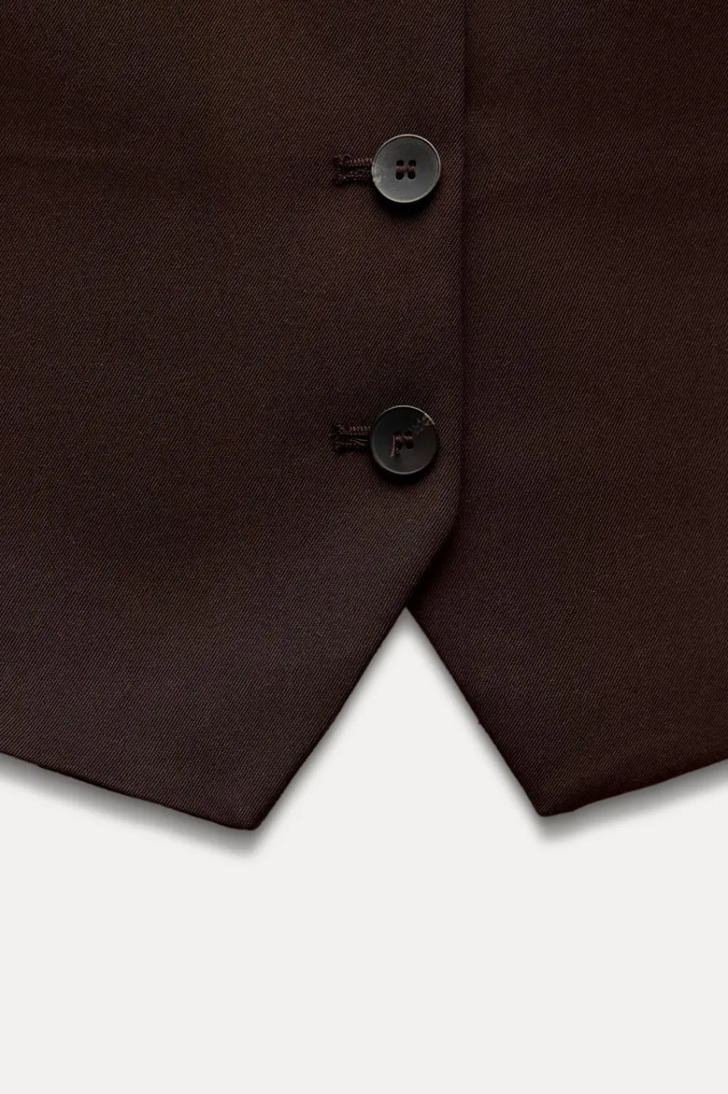 Chaleco de escote pico y manga sisa. Bajo con aberturas laterales. Cierre frontal con botones.