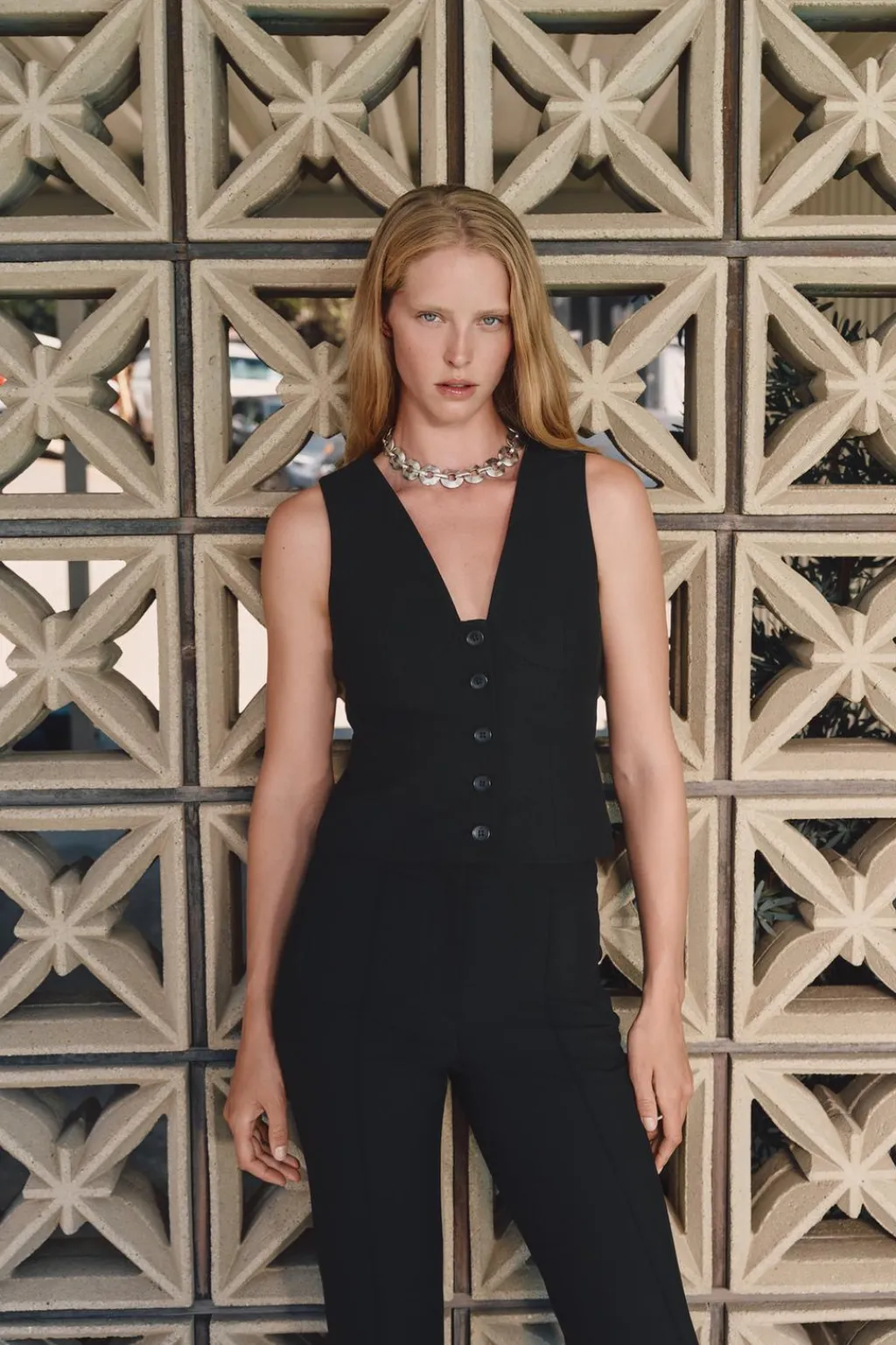 Chaleco de escote pico con costuras con forma de cazuelas y manga sisa. Cierre frontal con botones.