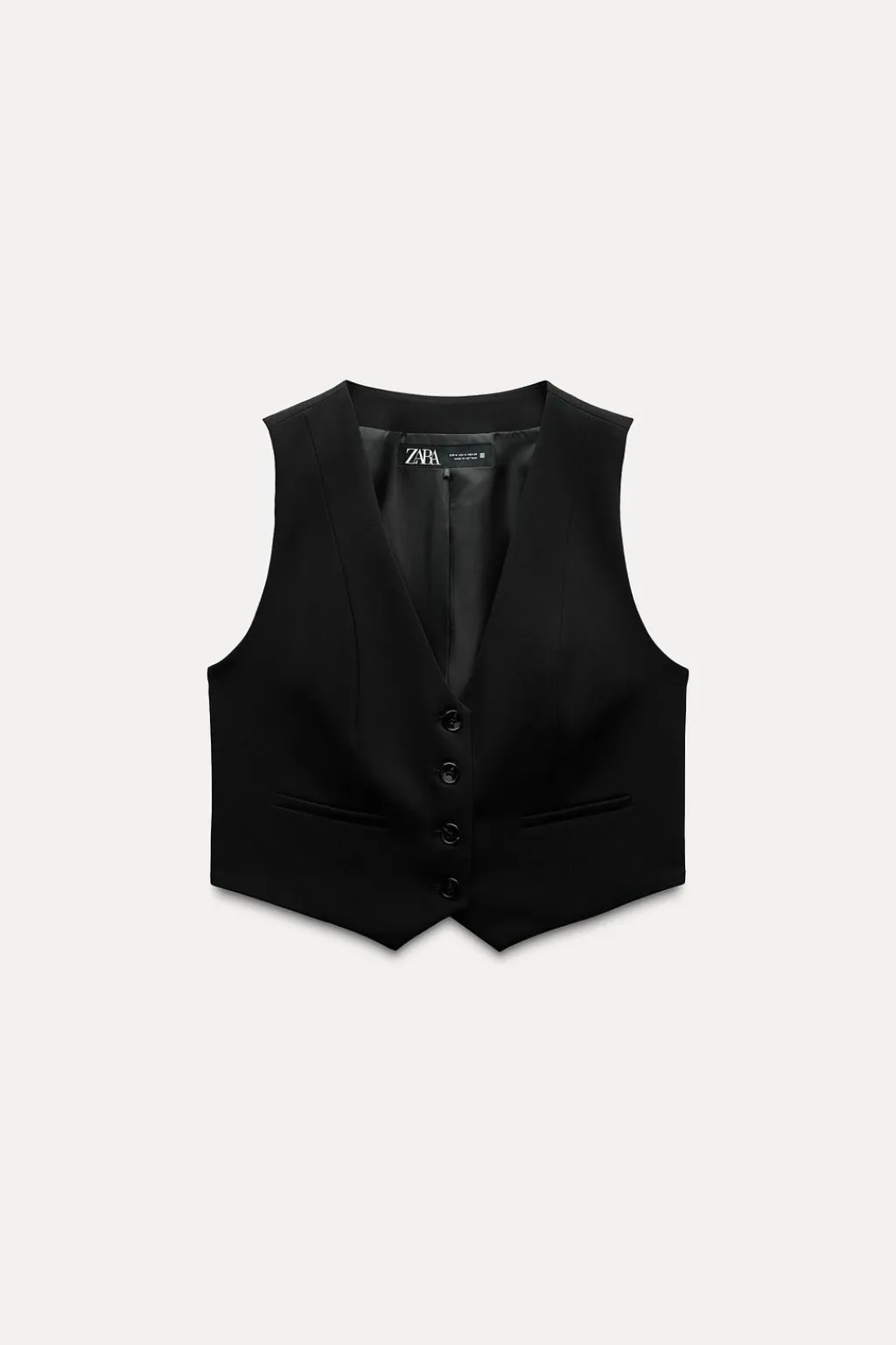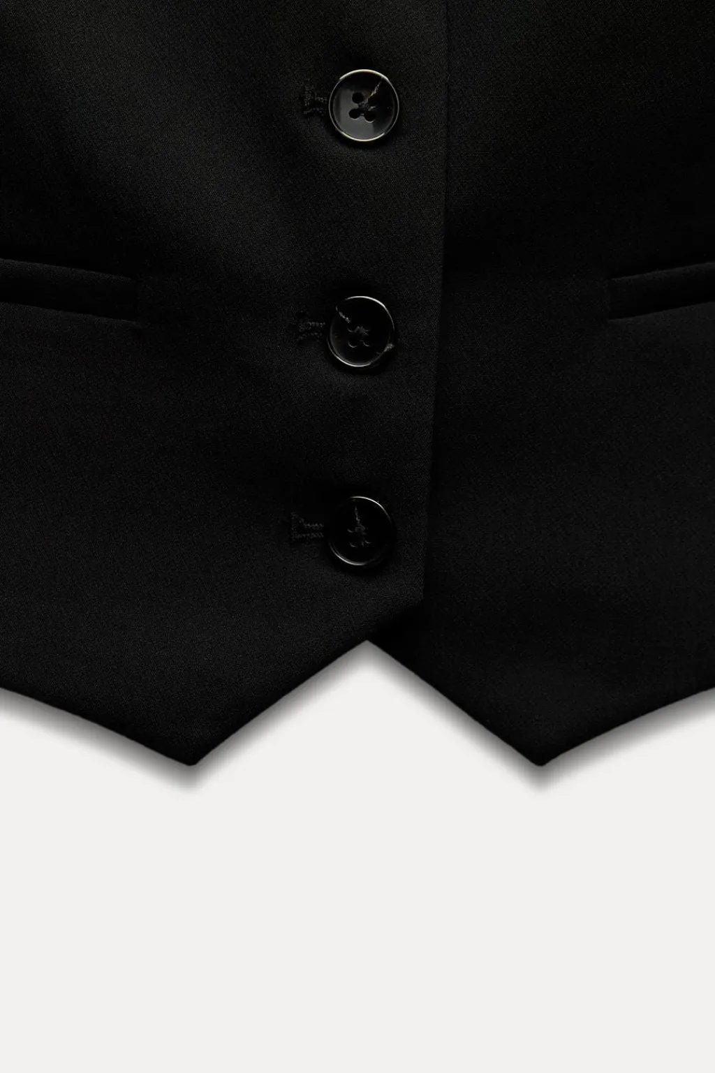 Chaleco corto de escote pico y manga sisa. Bolsillos de vivo en delantero. Cierre frontal con botones.