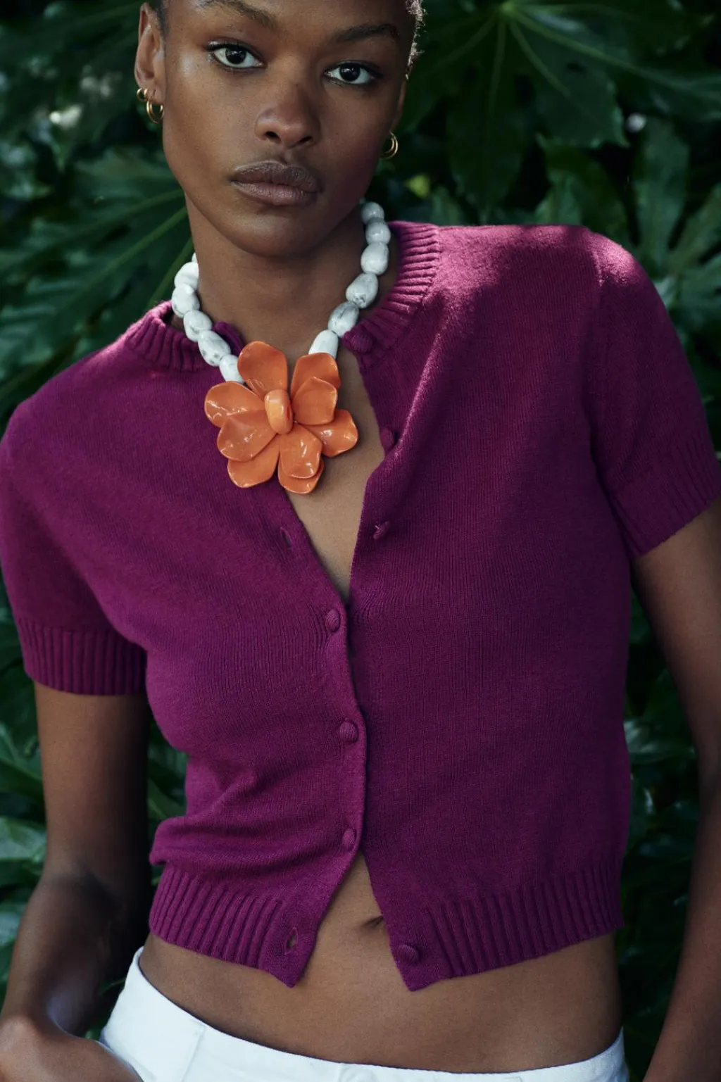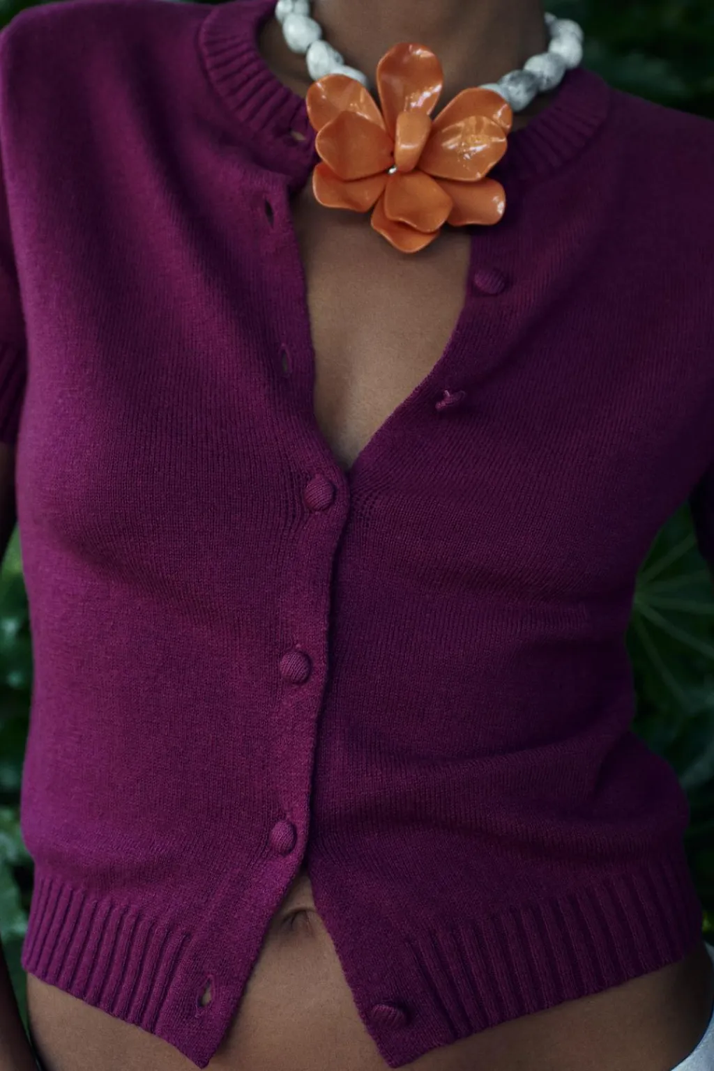 Chaqueta con cuello redondo y manga corta. Acabados en rib. Cierre frontal con botones forrados a tono.