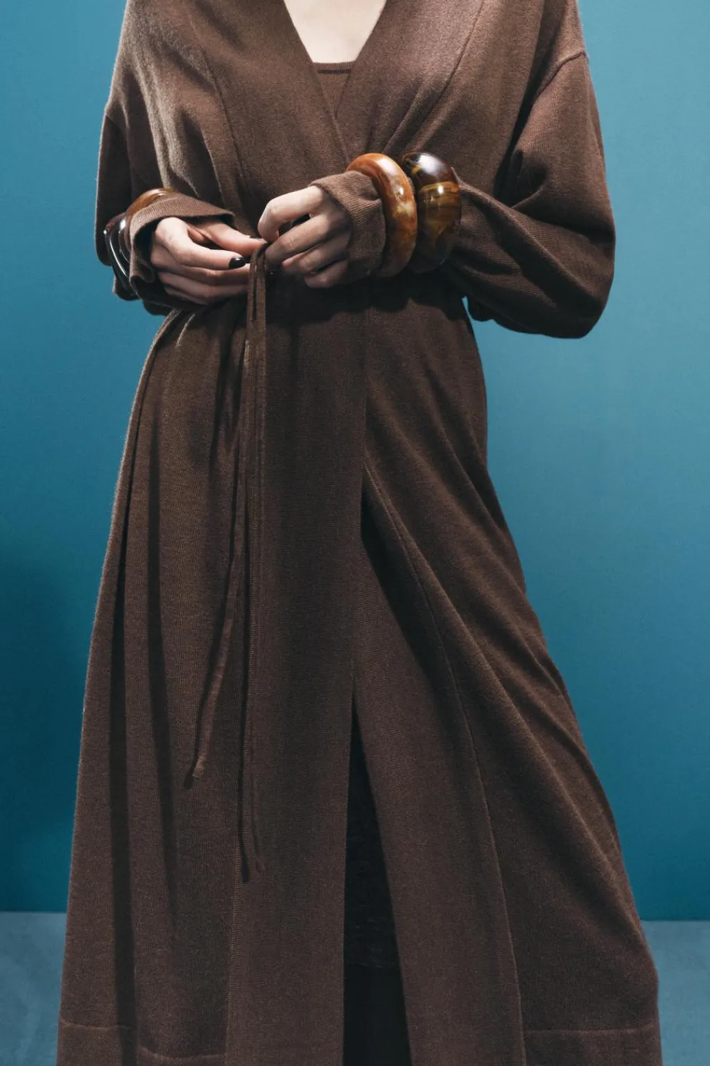 Chaqueta de punto fino con manga larga. Cierre con cinturón fino del mismo tejido.